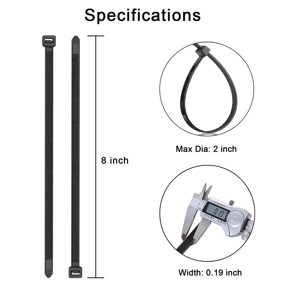 UV Resistant Cable Ties for indoor and outdoor, 50lbs Tensile Strength, Zip Ties 8 inch (1500 Pack), Black QUALITY MATERIAL: The cable ties are made of industrial grade nylon 66 with excellent UV resistance, durability and weather resistance. They work reliably even in direct sunlight, making them ideal for indoor and outdoor use. HIGHER TENSILE STRENGTH: Compared to the industry standard of 0.14 inches (3.6 mm), our 8-inch cable ties are 0.19 inches (4.8 mm) wider and 0.05 inches (1.25 mm) thicker, with a higher tensile strength to withstand up to 50 lbs. of weight. SELF-LOCKING DESIGN: Black nylon cable ties feature a self-locking mechanism for safe and secure tightening. Thick buckle with teeth and anti-bounce design will not come off easily, can be locked easily and not easy to come off. HIGH CAPACITY: Length: 8" | Width : 0.19" | Max Dia: 2" | With 1500 pieces zip ties, enough for all your projects and daily use. MULTIPLE USES: These cable ties are versatile and can be used for organising cables, securing plants, hanging lamps, fixing accessories, making crafts and more. They are ideal for home, office, garden, workshop organisation and help you keep your space organised and tidy.