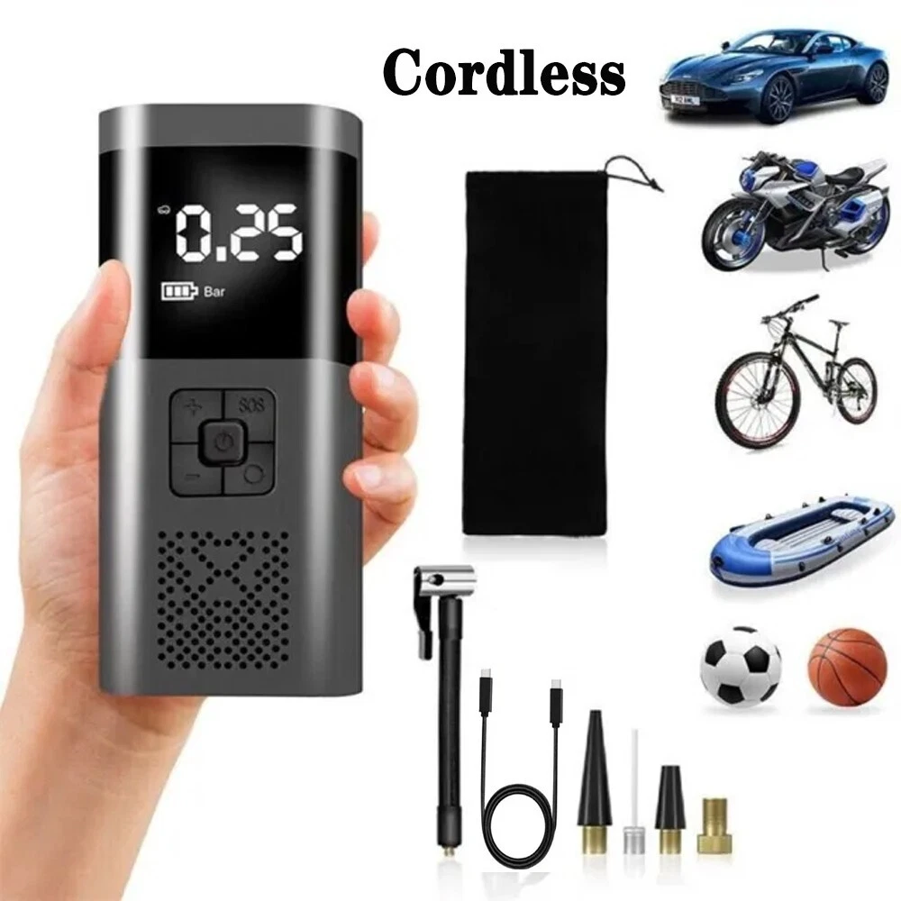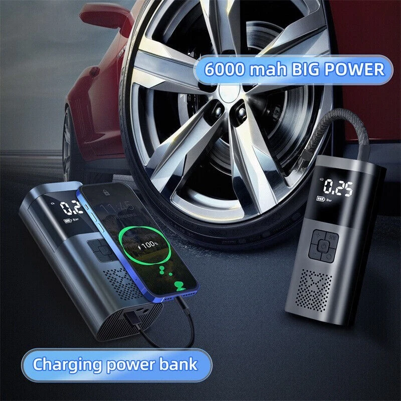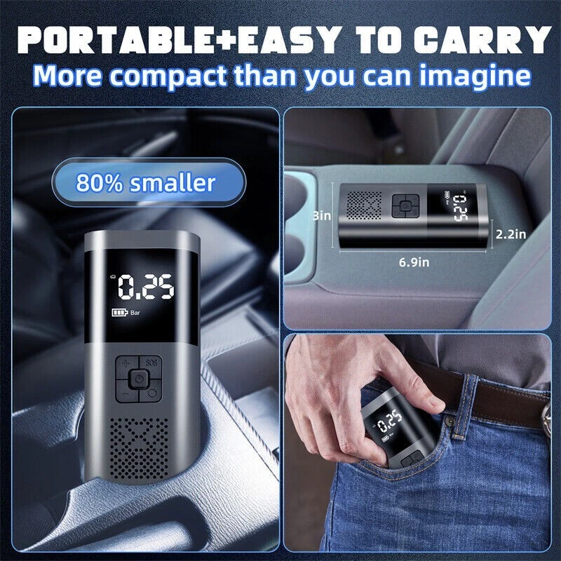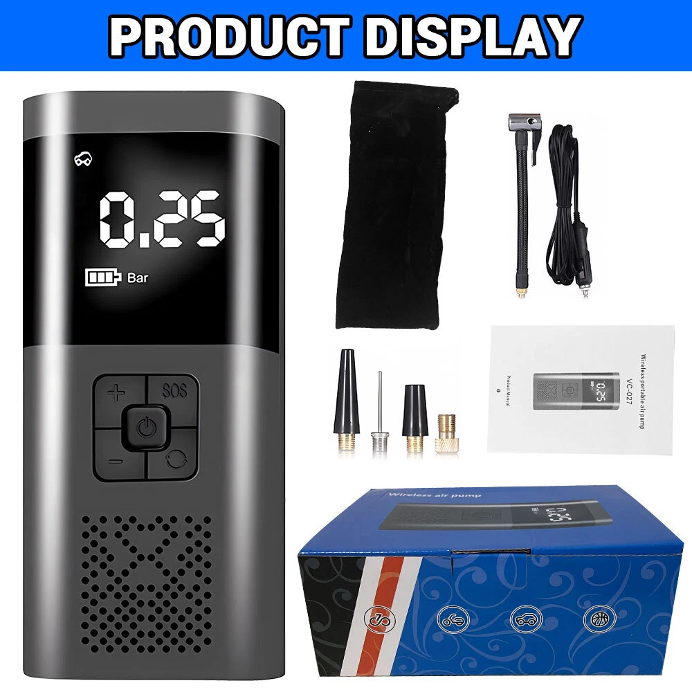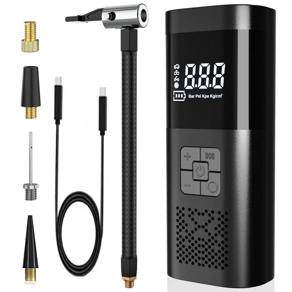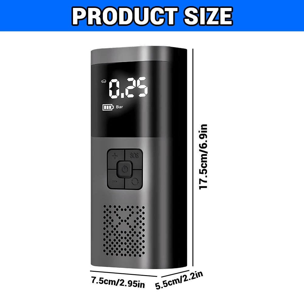 Features. 150PSI Smart Air Pump: This practical electric air pump mini inflator has a 150PSI maximum inflation pressure. Plug it into the 12V power outlet in your car and attach the stem to the tire valve. One simple press on the car air compressor and it will do all the work for you. 4 Inflation Modes & Power Prompt: The LCD digital display panel will display 4 kinds of air pressure units "PSI", "BAR", "KPA", "Kg/m²". The digital display panel will have icons such as motorcycles, cars, and balls for selection. The corresponding safety air pressure has been set by default for the type of product. Multipurpose Nozzles: Comes with four different aeration nozzles that can be replaced to charge bicycles, motorcycles, automobiles, air cushions, basketballs, and other products, simple and very convenient. The wired air pump is connected to the power supply through the attached car power cord. LED Lighting For Night Time: Power tire compressor has 3 LED lighting modes (Ordinary White light & Slow frequency warning light& Hazard warning light) for you to use as an outdoor lighting source. It is a helpful companion for emergency or daily use. Easy to operate: After connecting the tire valve, the current tire pressure is displayed, and the tire pressure can be monitored at any time. When the inflation reaches the preset value, the air pump will automatically stop inflation to avoid over-inflation. Portable & Easy To Carry: Portable tire pump comes with a carrying bag and a well-made mini electric tire inflator is designed to be easily stored in your car. Multipurpose Nozzles: Comes with four different aeration nozzles that can be replaced to charge bicycles, motorcycles, automobiles, air cushions, basketballs, and other products, simple and very convenient. The wired air pump is connected to the power supply through the attached car power cord. Specifications. ▪️ Name: Electric handheld inflatable pump ▪️ Material: poly carbon (pc) ▪️ Color: black ▪️ Display: LCD display ▪️ Maximum working pressure 150 PSI ▪️ Product Size: 175*75*55mm ▪️ Cylinder: 19 single cylinder ▪️ Power: 120W ▪️ Rated voltage: 12V ▪️ Function: Inflatable pump, lighting, warning light, mobile power ▪️ Application: cars, bicycles, electric cars, motorcycles, balls, etc. Package Included 1 x Inflator 1 x Car power cord 1 x inflation tube 4 x Inflatable adapter 1 x Storage bag