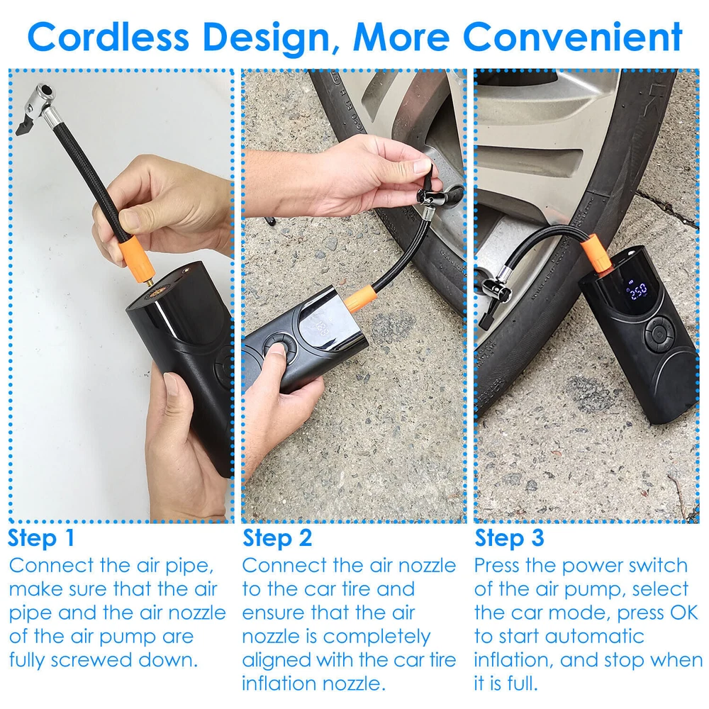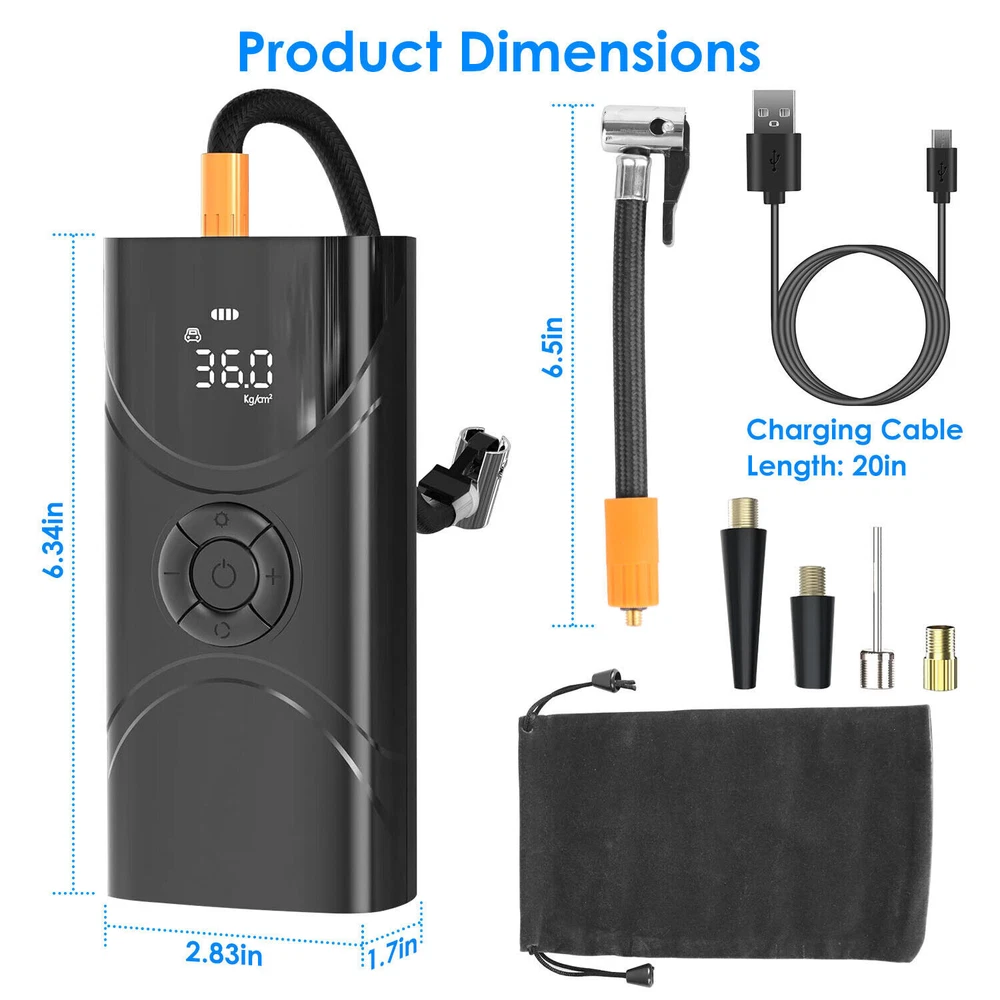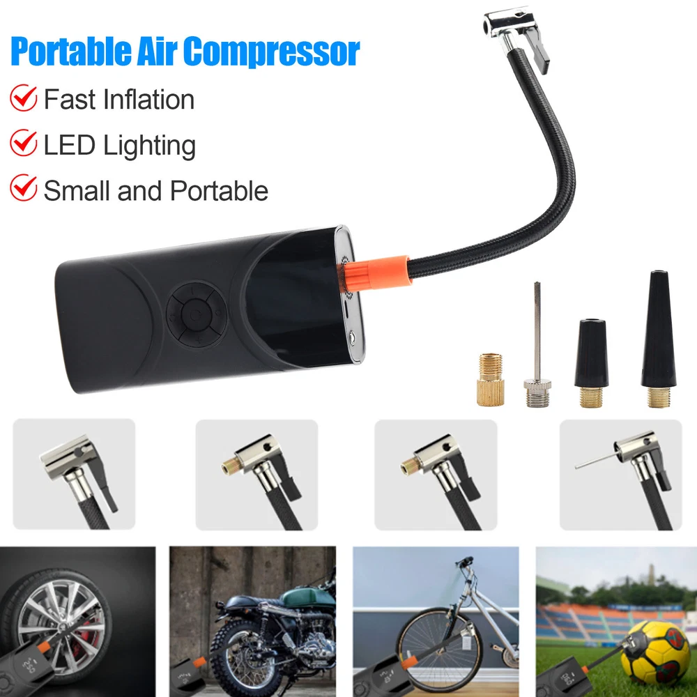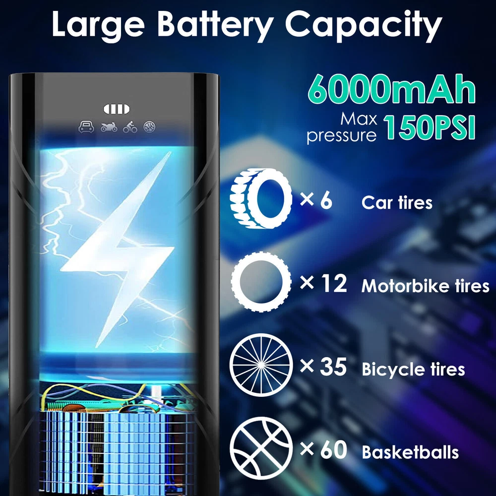 150PSI Air Pump Wireless Air Electric Tire Inflator Car Auto Bike Rechargeable Product Information: Product Type: Car Tire Inflator Color: Black Material: ABS Input: 5V 2A Charging Time: 3Hrs Battery: 7.4V 6000mAh Lithium Inflatable Flow: 20L/min Maximum Pressure: 150PSI Power: 60W Car Tire Inflator Size: 16.1x7.2x4.3cm/6.34x2.83x1.7in Charging Cable Length: 51cm/20in Inflatable Tube Length: 25cm/10.5in Package Size: 19x14x6cm/7.48x5.51x2.36in Description: The tire air pressure is normal or not directly related to the safety of driving and fuel economy. In order to help you keep your vehicle tires in the best condition at all times, we have specially launched this digital display car inflator pump. Feature: 1, The machine applies to 12V car tires, also applies to motorcycles, bicycles, balls, rubber boats, beach pontoon beds, inflatable toys, etc.. 2, Comes with a variety of inflatable nozzle head, suitable for different models of tires, bicycles, sports equipment and other types of inflatable needs, but also in the highway, the field or on the way to work in the case of a sudden leakage of tires to play the role of emergency rescue. 4, the use of advanced digital display technology, to maintain the correct tire pressure, can ensure driving safety, and save fuel consumption, with the car with the wonderful use. 5, with a full set of inflatable nozzles, can be used to inflate tires, dinghies, air mattresses, inflatable toys, ball inflatable and a variety of other uses. Instructions for use: 1, the rubber hose head of the air nozzle directly inserted in the tire valve, when you hear the sound of air leaking out of the tire, said the air has been circulating, continue to tighten the air nozzle, at this time the air is no longer leaking out. 2,Insert it into the DC12V cigarette lighter. 3、When inflating, pre-selected corresponding inflation mode, (general tire pressure of car tires is 223kpa=35PSI), when inflating reaches the preset value, the equipment will automatically stop inflating, take out the plug and nozzle, that is to complete the work. Note: 1, please use the machine equipped with a professional ball needle, plastic nozzle and air nozzle connected to the ball, and other need to inflate the equipment to inflate. 2, can not be used in large and overweight vehicle tire inflation, such as trucks, large trucks, box-type container trucks; 3, the use of the car engine to start to enhance the power, does not consume the car battery power; 4, this machine is limited to use direct current (DC12V) power supply, can not be used for household high-voltage AC (AC220V) power supply; 5, inflatable, please stop the machine for 15 minutes after 5 minutes of continuous work for cooling, to prevent damage to the air pump and accessories, and can extend the life of the motor. 6, general tires in the inflatable, about 3-5 minutes can reach 30PSI normal tire pressure, large tires will be a little longer; such as the beginning of the inflatable air did not enter the tire, this time you need to immediately unplug the nozzle connector, re-operation, otherwise the motor is easy to damage. 7, use people do not leave the body, pay attention to tire pressure at any time, not too saturated; 8, after the use of this machine, the nozzle wrench must be wrenched straight, so as not to fatigue the rubber elasticity inside; 9, the air pump plug fuse, such as the air pump does not start, please open the plug to check and replace (fuse for 10A); 10, the machine should be avoided wet, heavy fall and sand intrusion, avoid children play to avoid damage; 11、Each kind of tire requires different pressure, please refer to the label on the side of the car tire, or ask the car manufacturer to set the best tire pressure. Shipping Policy Payment Method Returns Policy Feedback Contact us Shipping Policy All item will be carefully packaged very well with safe material and shipped to US States. Items will be sent in 2 working days,usually shipped by USPS Priority Mail. It will take about 3-5 days to US addresses. If you would like to ship by other shipment methods,please contact us.( shipping cost will be combined for multiple items you purchase at a time.) Payment Method Only PayPal is acceptable.It is a safe and easy payment method for buyers. Please pay in 48 hours after you win the item(s).If payment cannot be made in five days,your order(s) will be claimed as unpaid case and the item will be relisted. Returns Policy Customer satisfaction is our first priority. 30-days return is available after delivery. However, return shipping and insurance cost will be on buyers. Please email us before returning. Delivery date will be different according to UPS or USPS tracking system, so please inspect your item immediately upon arrival. Money will be return to you after the return item is sent back. We can not refund to you, if your return item is broken or damaged. Please ensure its safety. Feedback Your feedback is very important to us. If you can't leave us a "5-Star" rating and a positive feedback, please contact us without hesitation before leaving feedback. We are eager to work with our customers. We believe in communication. Give us a call or send us an email, we will make things right for our buyers. Positive feedback for our buyers will be left automatically by eBay Seller Manager Pro. Contact us 1. If in doubt, please send us an email. Our customer service team will provide a satisfactory answer What we do is 100% satisfaction for your customers 2. Except for Sundays and festivals all mail is sent and received within 24 hours