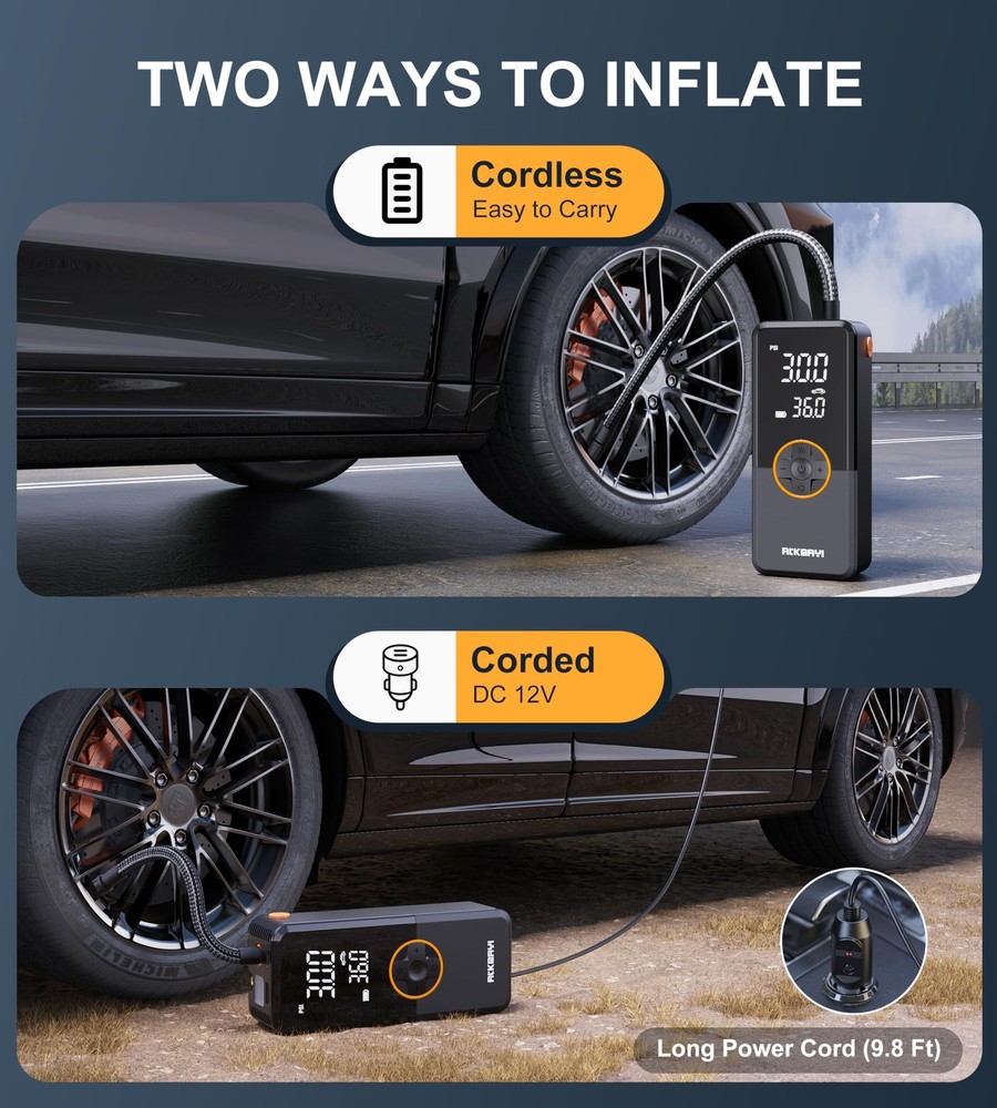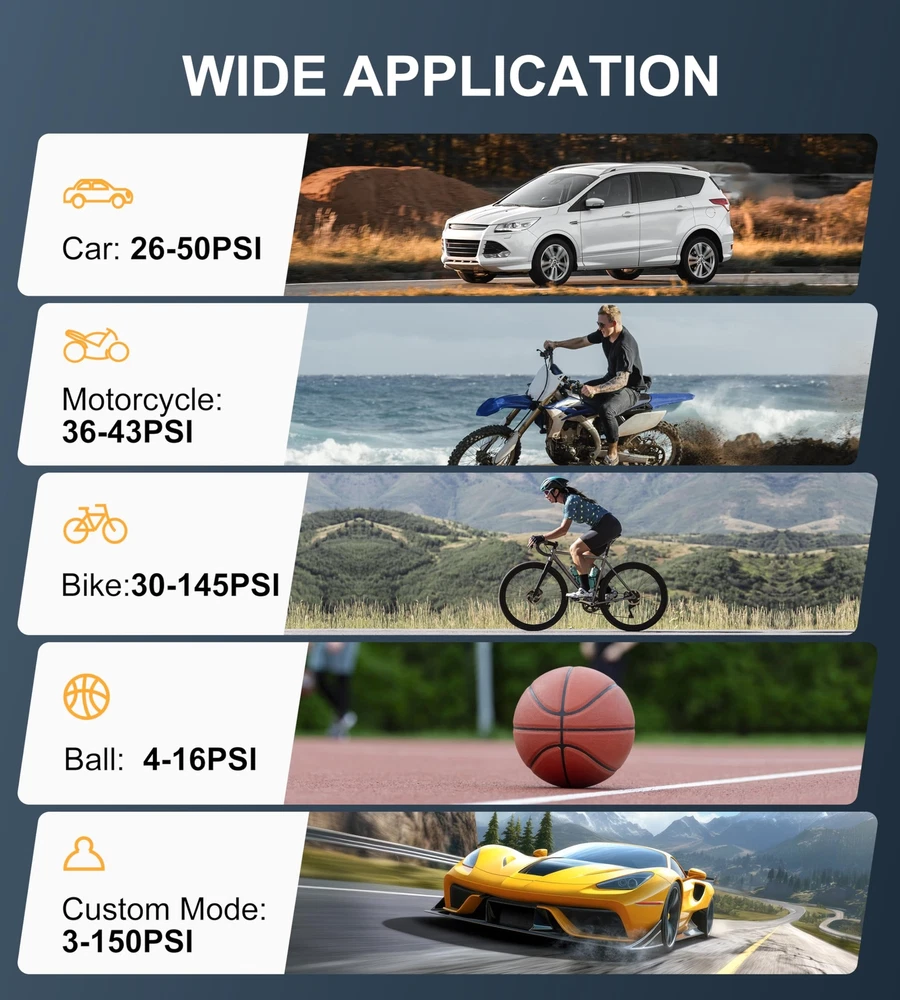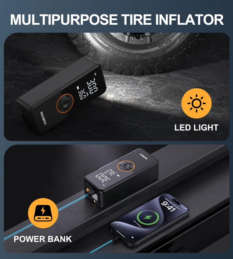 This portable tire inflator is a game-changer! It pumps up my car tires in just 40 seconds and handles bikes, balls, and more with ease. The 150 PSI max pressure and multiple preset modes make inflation effortless. Love the cordless design—super convenient for quick top-ups anywhere. Super fast, reliable, and easy to use!
