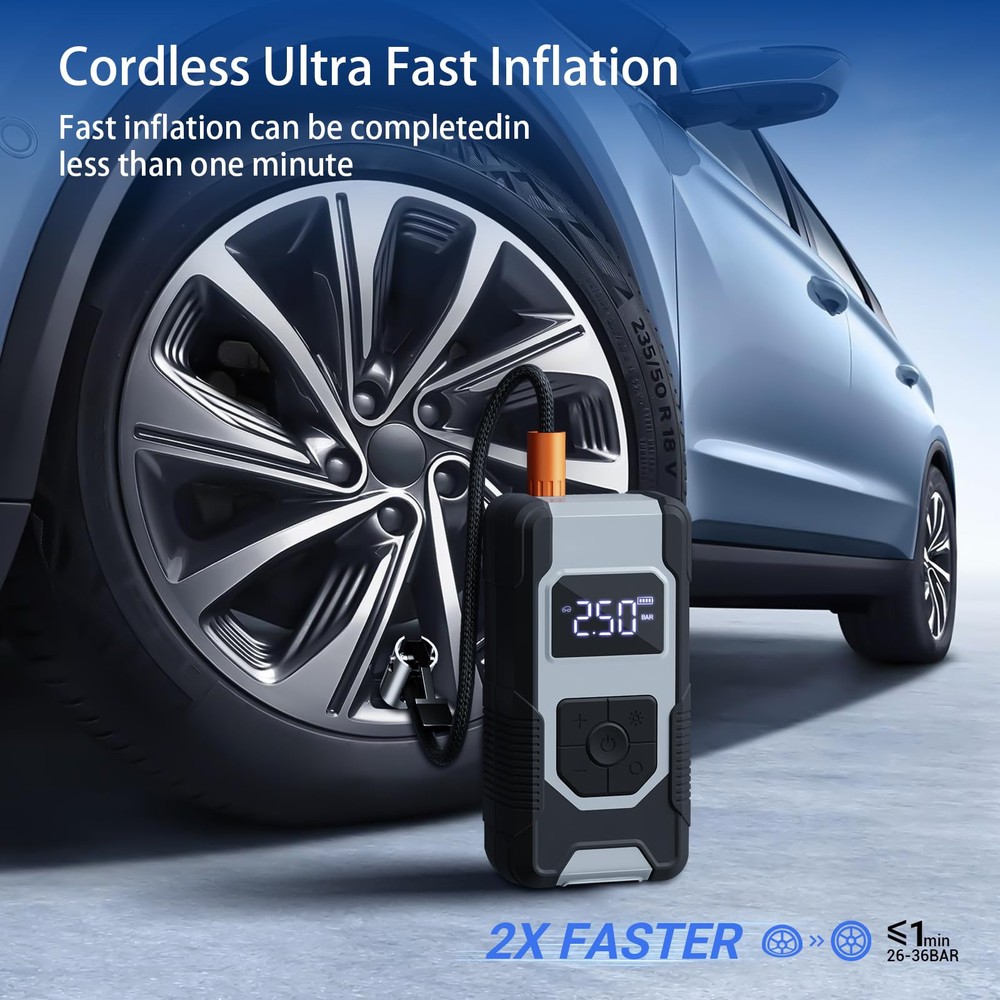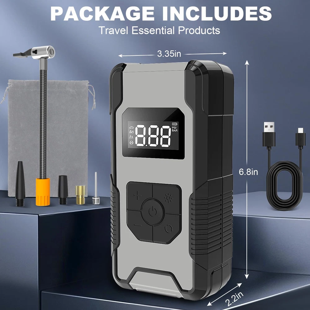⚡【FAST INFLATING】air compressor with portable design is a great solution for emergencies on the way. It can provide up to 150 psi pressure and refill a 185/65/R15 car tire from 0 to 35 psi less in than 6 mins. Besides, the auto-shutoff design also prevents over-inflating, making it safe to use. ⚡【4+N SMART MODES】portable air compressor for car tires is convenient to use with 5 smart modes, easily meeting your various inflating needs! The 4 preset modes are car mode, motorcycle mode, bike mode, and ball mode, which facilitate the operation of the new beginners. Moreover, the manual mode enables you to set the desired pressure from 3-150psi according to different inflatables. ⚡【CORDLESS & EASY-TO 】 No external power supply is needed, portable tire inflator for cars with a rechargeable battery pack can help you inflate most inflatables anytime.And product accessories include 1pc of ball pin, 1pc of short air nozzle, 1pc of long air nozzle, 1pc of French air nozzle connector, 1pc of storage bag, 1pc of USB-A to Type-c charging cable, 1 piece of instruction manual. ⚡【LONG-LASTING POWER】This portable tire inflator is powered by three large-capacity batteries of 2,500mAh that can work continuously for up to 30mins after being fully charged in 3-4 hours., it's recommended to rest for 3-5 minutes after each 10-minute use. ⚡【MULTIPLE ATTACHMENTS】cordless tire inflator is a must-have for drivers, cyclists, and adventurers. With rich accessories included, this portable air pump can not only inflate car tires with width ≤ 245mm and pressure ≤ 50psi, but also refill tires of bikes, motorcycles, balls, and other inflatables!
