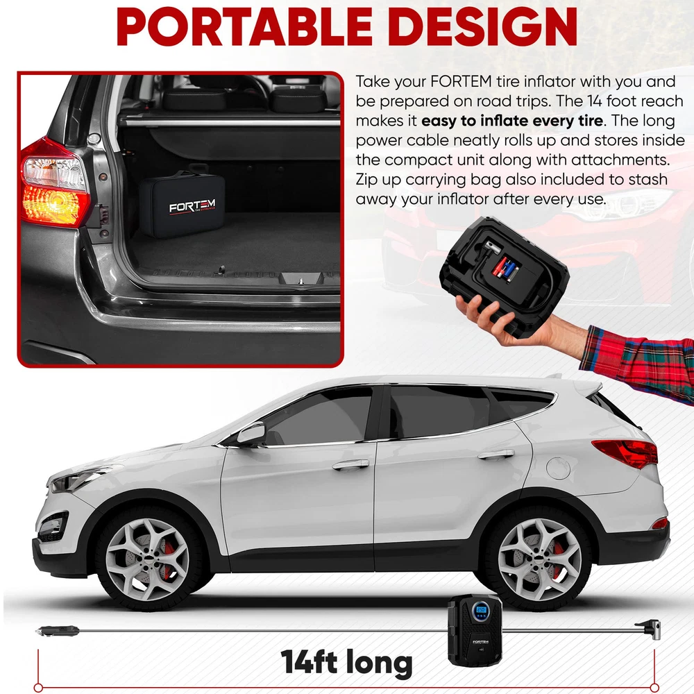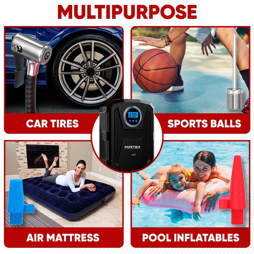 Portable and Compact - Take your air compressor for car with you and be ready for any . The 14ft reach cables are stored inside the small compact unit making air compressors the perfect accessory for automobiles. Multi-purpose - Perfect for car, truck, suv, motorcycle tires. Includes three nozzle attachments for sports balls, air mattress, pool toys and other inflatables. Can also be used as an air pump for bike. with all vehicles with DC-12V cigarette lighter power outlet. Built-In Safety Features- Super bright automatic LED flashlight makes our car air pump suitable for roadside and nighttime use. 12v air compressor is ready whenever you need to inflate a flat tire. Easy To Use – Start car ignition, connect car plug to the DC-12-volt power outlet, set the PSI desired, and wait for the display to stop blinking. Flip switch to on, the inflator then pumps air and turns off automatically once PSI is reached. Year - Made from extremely durable, lightweight plastic. Enjoy daily drives, not worrying about your tire pressure. Your heavy duty portable air pump is covered for a full year!