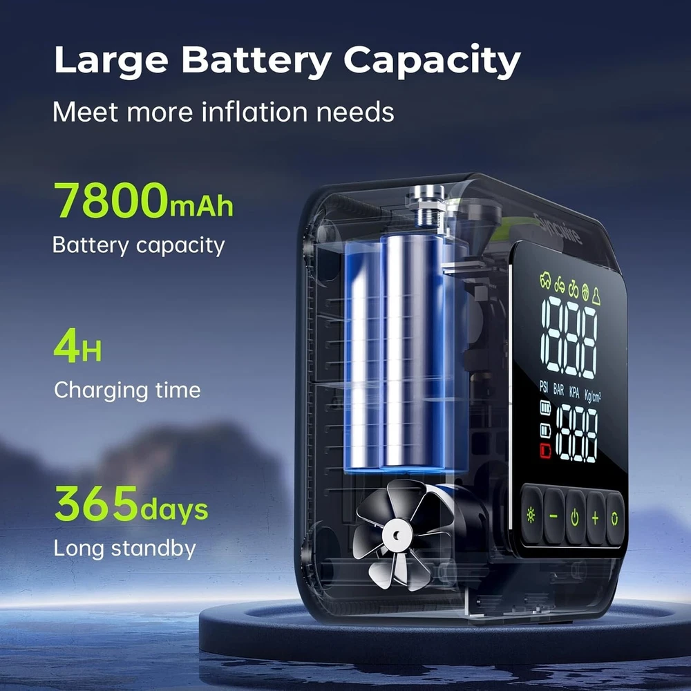 Tire Inflator Portable Air Compressor 150PSI Air Pump for Car Tires [3X Faster] Inflation Electric Smart Tire Pump with Extra-Large LCD Dual Value Display [Free Car Tire Valve Caps], Auto-Off 【Super-Fast Inflator with Extreme Precision】The tire inflator portable air compressor inflates up to 3 times faster than similar competitors. With a rated pressure of up to 150 PSI and a 7800mAh battery, it offers strong airflow and quick speed, making it ideal for inflating car tires, bikes, motorcycles, balls, and more. Inflate a ” tire (28-33 PSI) in just 56 seconds with pinpoint precision of ± PSI. NOTE: Not suitable for large-volume uses like air mattresses or paddle boards. 【Simplified One-Press Setting】- The Tire Inflator Portable Air Compressor comes equipped with 5 inflation modes for cars, motorcycles, bikes, balls, and a customizable setting, along with 4 preset pressure units (PSI, KPA, BAR, KG/CM²). Effortlessly select your required mode and unit with a single press, set it, and start inflating. The air pump will halt automatically once it hits the designated pressure, allowing you to kick back, free from the hassle of constant monitoring. 【Ultra-Large Bright LCD Display】- This portable tire inflator features an extra-large, easy-to-read LCD screen with dual pressure readings, and large buttons, allowing for precise pressure monitoring and easy operation. The top value displays real-time pressure while the bottom shows the preset target, ensuring accurate readings that are clearly visible in both daylight and at night. 【Gifted Car Tire Valve Caps】- air pump comes with a comprehensive set of accessories, including multiple inflation nozzles for various demands. Additionally, we provide a unique bonus of four high-quality aluminum alloy car tire valve caps, which are special and unique in the market. Should you ever misplace the original caps for your vehicle's tires, these supplied tire valve caps serve as an excellent substitute, sparing you the embarrassment of lost valve caps. 【Two Ways of Using】- You can use the air inflator cordlessly with the built-in large battery. However, it also features a DC 12V cigarette lighter power cord. If the battery runs low, it plugs directly into a car's cigarette lighter port and makes it easy to inflate the tires, which is a great emergency solution on the way. Two ways of using enable you to use the portable air inflator in different situations. 【All-in-one Powerful Functions】- Including a long air hose and three versatile nozzle adapters, this inflator effortlessly pumps up tires for cars, motorcycles, and bicycles, sports equipment (like balls), air cushions or pillows, and more. Built-in LED flashlight provides illumination in dimly lit conditions, and the additional USB output port turns the device into an emergency power bank for the s. This multifunction tire inflator makes it a great choice for all your needs. 【Exclusive satisfaction Service】- We provide a 36- satisfaction and support to assist with any inquiries or needs. Perfect choice for you. You will get 1* portable tire inflator, 1* air hose, 4 different air nozzle adapters, 4 car tire valve caps, 1*DC12V cigarette lighter cable, 1* USB-C charge cable, 1* storage bag, 1* user manual, 1* satisfaction policy. Should you encounter any issues, we encourage you to contact me immediately for a swift and satisfying resolution.