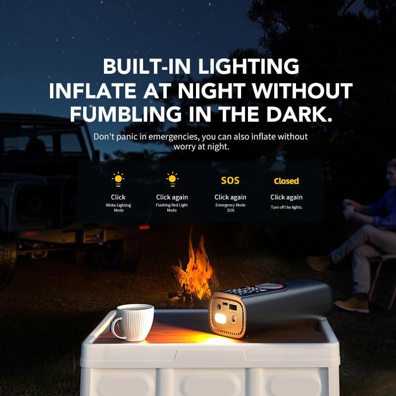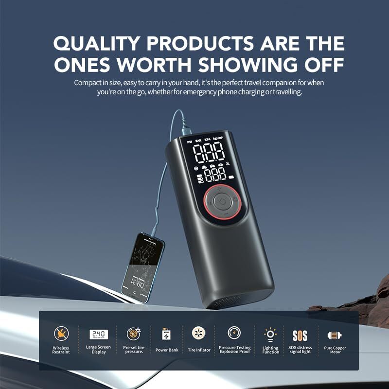This portable tire inflator is a lifesaver! The 150PSI power inflates car, bike, and motorcycle tires in minutes—no more gas station stops. The bright LCD screen shows real-time pressure, and the 10,000mAh battery lasts forever. Super compact, super fast, and so easy to use—just press a button. Total game changer for road trips!