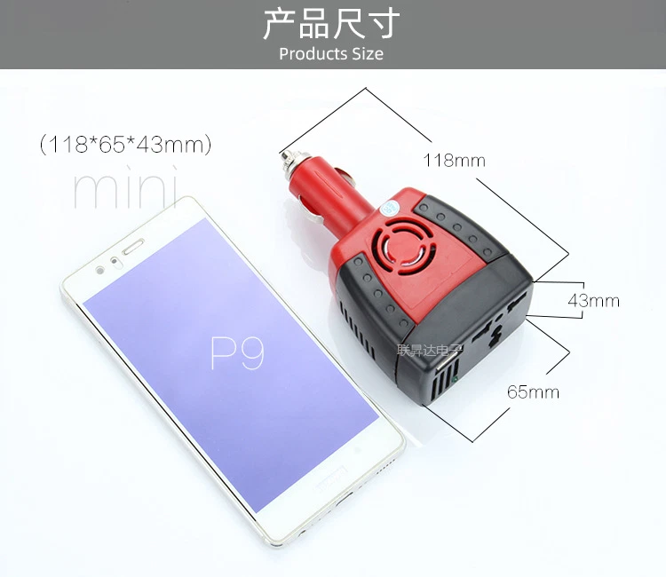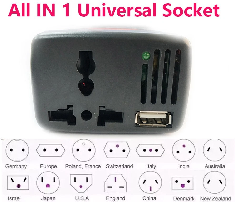 150W Car Power Inverter Laptop Phone Charger DC 12V to AC 110V Adapter + USB 5 V O utput The Socket is ALL IN 1 Universal type,suitable for US,EU,AU etc. to use,pls kindly note this Product introduction The product can convert DC 12V into AC 110V 60HZ and USB output is DC 5V,Rated output power of the product is 150w,which can be widely used in all kinds of electrical equipment,such as moblie phone,TV sets,fanner,digital equipmen.it is the best choice for your self-driver,field work. Usage First,make sure your car cigarette lighter socket output voltage is DC 12V (except medium bus and truck),Almost all the car's cigarette lighter socket output voltage is 12V,Put your electrical equipemnt plug into this product's output socket and maintain a good contact.Be sure of the power of your electrical equipment is below this product rated power.Put cigarette lighter socket and then you will see the indicator lights up,which means the product can start working,if your electrical equipment has the power switch,please switch on. Technical parameters Input Voltage:12V DC Output Voltage:AC 110V 60HZ USB Output:5V 0.5A/2.1A Power Rating:150W Max Power:200W Voltage Protection:Low voltage:10v-11v Over voltage:15V-16V Over-Load Protection:>150w Short-circuit Protection: Yes Shipping Dispatch by USPS first class,just take about 3-5 business days to arrive your place. If you have any questions ,please feel free to contact us by ebay message we will try our best to give you the best solution by communication. Thank you for your bidding and contact!