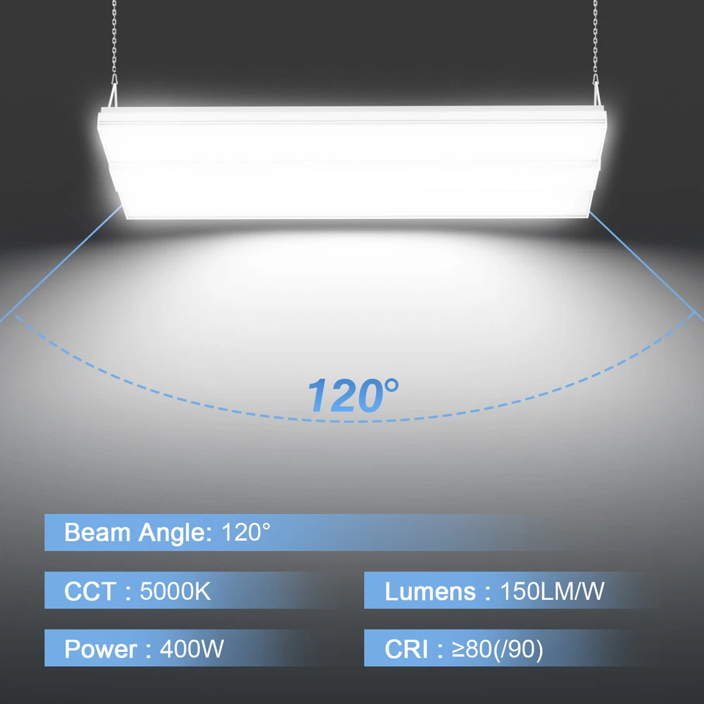 SAFE & SECURE SHOPPING 100% SATISFACTION GUARANTEED FAST SHIPPING 150W LED Linear High Bay Shop Light Commercial Warehouse Workshop Lamp 22500LM Product Description HIGH EFFICIENCY & ENERGY SAVIN - KUKUPPO 150W LED high bay shop light has high light efficiency of 150LM/W, providing 22,500 lumens of brightness at 5000K. 2023 NEW COMPACT DESIGN - The LED linear high bay light is with die-casting aluminum housing feature great heat dissipation, ensuring 50,000 hours lifetime. EASY INSTALLATIO - No Bulbs and No Maintenance Ever! Multiple voltages from 100-277V AC. These LED high bay lights can be easily hung to the ceiling with the included 4FT chains and V-hooks , 4.9FT power cord (No Plug). WIDE APPLICATION - With a beam angle of 120°, CRI>80, and light decay<5%, the high bay shop light fixtures are great for warehouses, garages, workshops, supermarkets, storage yards, gyms, manufacturing spaces, and large retail spaces. 5-YEAR WARRANT - KUKUPPO lights are UL and DLC Listed. They are with commercial grade high quality. We stand behind the quality of our linear led highbay lights with a 5-year warranty. Please contact us for any quality issues. Specifications: Rated Power: 150W Lumens: 22500LM Replacement Wattage: 500W HID/HPS Fixture Input Voltage Range: AC 100-277V CCT: 5000K Daylight LED Type: SMD3030 LED chips with 150Lm/W CRI: >80 Power Factor: >0.9 Waterproof rate: NOT waterproof Beam Angle: 120° Materias: Aluminum & PC Certification: UL&DLC Operation temperature: -40°F (-40°C) - 104°F (40°C) Copyright © 2022 Tongtool