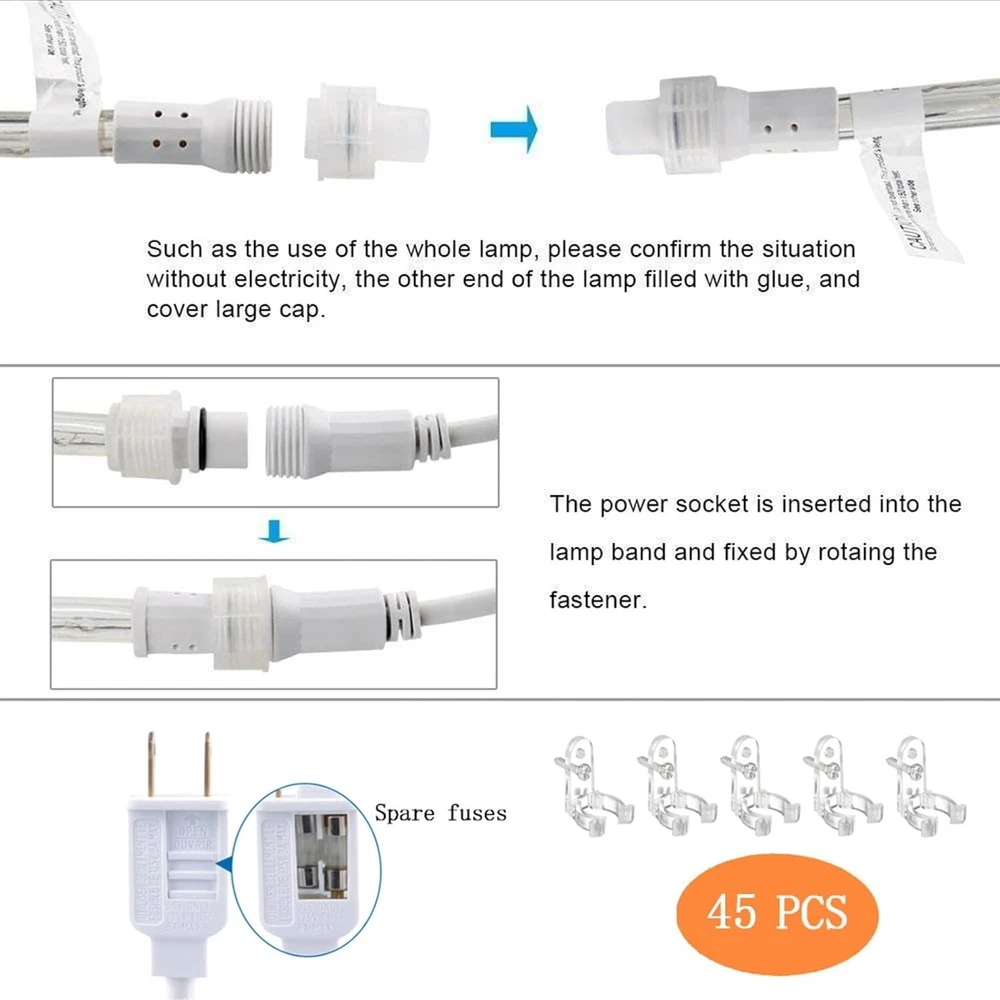150ft LED Rope Lights Outdoor, 1080 LED Connectable and Flexible Tube Lights with 8 Modes, Waterproof LED Rope Lighting for Garden, Patio, Bedroom, Party, Pool, Indoor Outdoor Decoration Warm White Flexible and Connectable Rope Lights: This LED rope light kit use high quality clean tube to protect the fairy lights, which can be bent into various shapes, easy to recycle the next use. End to end connectable, connect up to 2 sets (Total Length: 300ft), long enough to meet your creative lighting decor needs. Auto Timer & Memory Function: Our outdoor rope lights also come with a timer function, The timer keeps 6 hours On and 18 hours Off once activated. Build in Memory chip save your last modes setting and no need to reset mode every day. 8 Modes & Safe to Use: The rope lights for outside have 8 different Modes: Combination, In waves, Sequential, Slo-glo, Chasing/Flash, Slow fade, Twinkle/Flash, Steady on. Press the button on the plug to change the mode. Just enjoy your life with these tube lights, Comes with screws and clamps to fix the led rope lights when hang on the ceiling or wrap around the trees and pillars. Two built-in fuses in the power plug as short circuit protection, more reassuring and reliable. IP 65 Waterproof: The outdoor rope lighting is covered with a transparent and thick round PVC tube that allows 360°full illuminating and is strong and heat-resistant. With waterproof IP65, it is suitable for indoor and outdoor decorations. (NOTE: The plug part is not waterproof). Outdoor Decorative Lights & Widely Used: Great for Christmas, party, and wedding decor, also suitable for daily and holiday use, such as cabinet, bedroom, ceiling, walls, background , Have the led rope light go along the pool deck, wrap up around the awning or other places you want, will add holiday atmosphere for your daily life. Create a festive Christmas! Decorate your home and party with our Christmas lights and share a joyful festive season with your family, beloved, and friends.