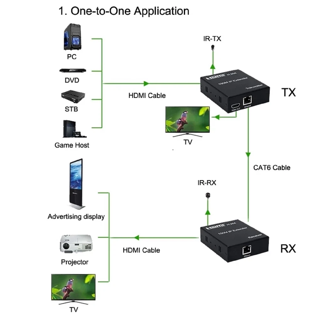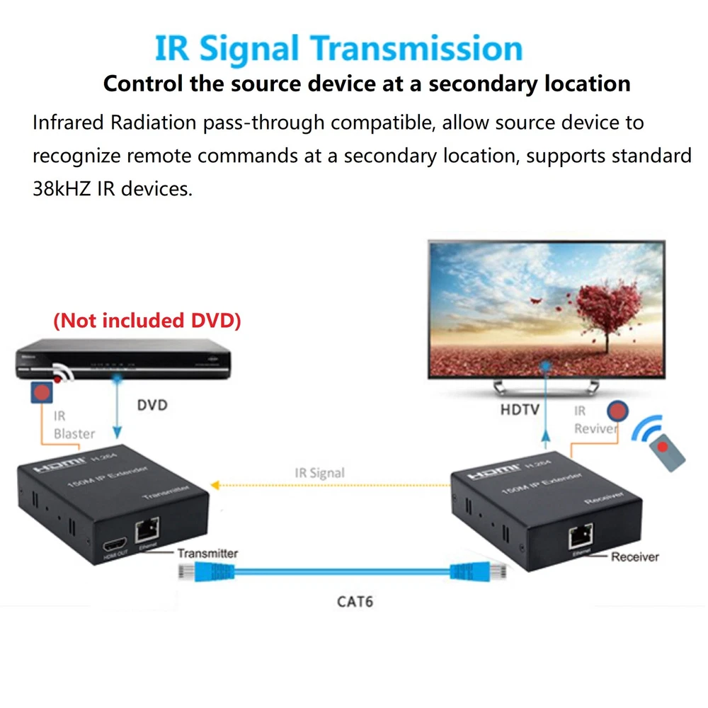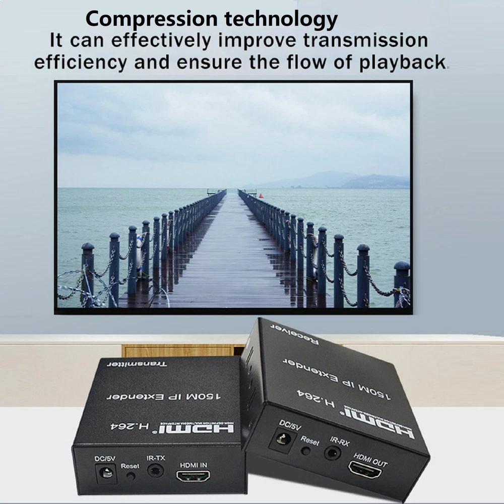 SAFE & SECURE SHOPPING 100% SATISFACTION GUARANTEED FAST SHIPPING Store Categories Store Categories You may also like 150m 1080P HDMI Network Extender Over Single Cable CAT5E/6 Ethernet RJ45 t Product Description 150M IP Hdmi Extender IR Over Cat5e Cat6 Rj45 Ethernet Cable 1080p HDMI Splitter H.264 Transmitter Receiver For HDTV DVD PS3 Specifications: HDMl version: HDMI1.3 Support HDTV Resolutions: 480p,720p,1080p Support max up to Resolution: 1920*1080p@60Hz Audio: Stereo, 32kHz, 44.1kHz, 48kHz lR remote control: 38 KHz, NEC code Power Supply: DC5V/1A The Max Power consumption: HDMl Sender: 3W, HDMl Receiver: 3W Operating Temperature: 0℃-45℃ Operating Humidity: 10%-80%RH(no condensation) Storage Temperature: -10C-70℃ Storage Humidity: 5%-90%RH(no condensation) Size(L-W-H): 93*79*27mm Weight: 228g x 2 Features: 1. Synchronous audio and video transmission 2. Infrared Radiation pass-through compatible, allow source device torecognize remote commands at a secondary location, supports standard38kHZ lR devices. 3. Compression technology: lt can effectively improve transmissionefficiency and ensure the flow of playback. 4. Long distance transmission Smooth and HD Resolution. 5. Wide application range: 150M HDMl extender over IP is used in audio-visual conference, command and controlcenter, ticketing platform, home theater, multi-media teaching, conference system andso on. 6. Support lR remote control. 7. The design of pure hardware, plug and play, no need for additional software. Connection and operation 1. Connect the HDMl source (such as DVD, PS3,STB ) to the "HDMI IN" of transmitter by HDMl cable. 2. Connect the“HDMl out”of Receiver to HDTV display by HDMl cable. 3. Connect the Transmitter and Receiver with one cat5e/6 cable (recommend).the furthest distance is 150M. 4. Connect the "IR receiver " into "IR-RX" port on receiver,and "IR transmitter" into the "IR-TX" on transmitter,and make sure the lR transmitter aim at lR port of the source 5. Connect two pieces of 5V power supply to the transmitter and receiver, and power on the HDTV display and HDMI source. Package contents: 1x Transmitter 1x Receiver 2x 5V/1A Selectable Power adapter 2x lR cable 1x User Manual Shipping Returns Contact Us Payment Shipping We ship most of our orders within 24 hours, and may up to 48 hours. If you want faster shipping way, please contact us before making a payment. Sometimes due to problems with our transportation company system, your shipping information may be delayed to update. We recommend that you try again after 3-4 days. If you still haven't checked the shipping information, you can contact us via ebay message. Returns 1. 30 days warranty from the purchased date. Please contact us via email before returning the defective item. 2.Our warranty does not extended to any product that are physically damaged or that are not under normal operating conditions as result of misuse or improper installation on the buyer/user's part. 3.Return items should include the original packaging and all accessories. buyers MUST contact us for the returning address. 4.In all cases, buyers pay shipping fees at their own cost to return products for exchange or refund. We will be responsible for the postage of replacements. Refund will be made upon receipt of the returned item. Contact Us Pls contact us if you have any problems,we will try our best to solve for you Payment We accept all verified payment from eBay. Copyright © 2022 Tongtool