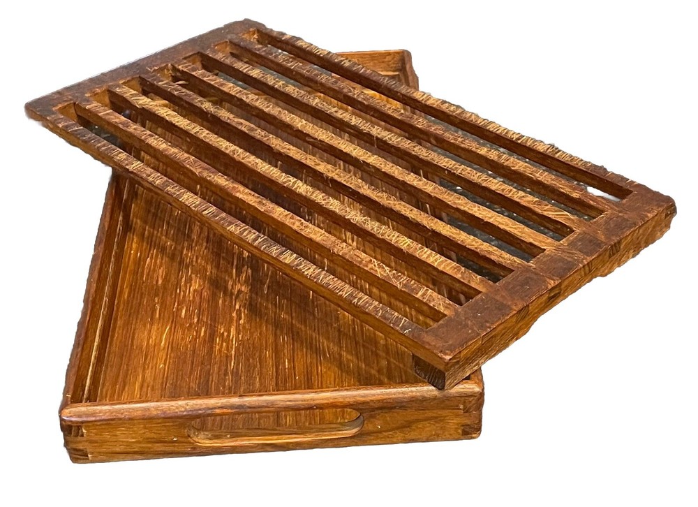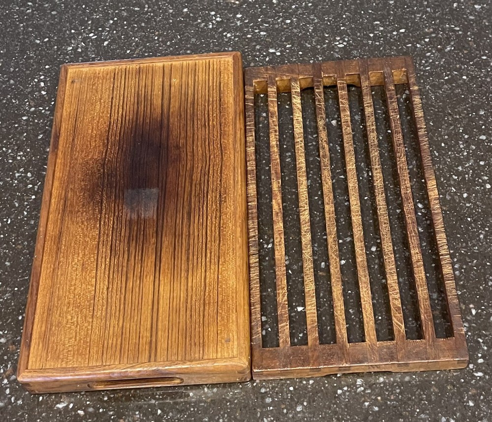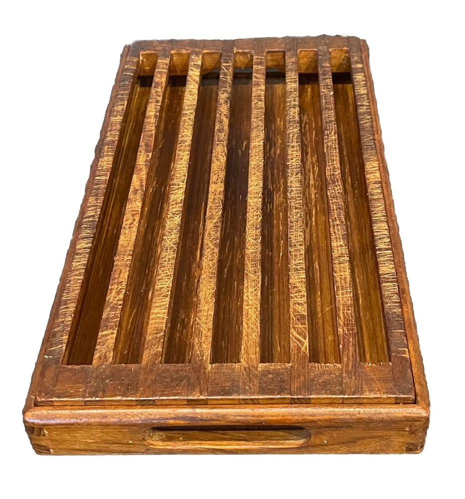 This stylish and functional bread board is designed to effectively contain bread crumbs within the tray portion, preventing them from scattering all around. The top portion doubles as a perfect trivet while the bottom separately provides the additional functionality of a gorgeous tray with convenient handles. As with all wood products, hand-washing with mild soap and warm water is recommended to maintain its beauty and integrity. To preserve the wood's natural luster, occasional oiling with food-grade mineral oil is suggested. This item is in very good used condition with a only a burn mark on the bottom, per pictures. Thanks for shopping with me.