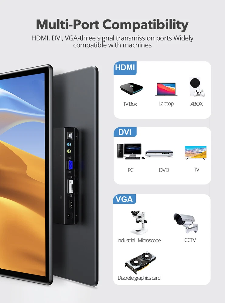 15.6" 16:9 Industry Monitor Touch Display DVI VGA HDMI Portable IPS Screen Used 2024 - 15.6'' 1080P 60Hz Touchsreen Monitor 💝 [Multiple Port Connections]: UPERFECT external monitor is equipped with Standard HDMI, DVI and VGA three interfaces, compatible with laptops, Macs, Raspberry Pi, TV boxes, PS4, Xbox, industrial medical and other equipment to meet the needs of connecting various devices. 💝 [Striking Contrast Ratio 2000:1 ]: UPERFECT touchscreen monitor features astounding 2000:1 contrast ratio,300cd/㎡and 100% sRGB to obtain better daylight contrast and no blacklight bleeding effect in the night time, creates true blacks, bright whites, sharp detail, and crisp text, delivers you excellent brightness and sharpness. 💝 [Precise Capacitive Touch Control]: 15.6 inch Touch Screen with Full HD IPS 1080P is smooth feel, and support swipe, scroll, drag and pinch gestures to help you get tasks done more efficiently. No extra driver needed, just connect the touch cable we provide to your device to achieve the touch function. 🌵NOTE: For mobile phone,game 💝 [Revel in Symmetrical Narrow Border]: A good look everyone will flip for. The symmetrical narrow border, full-screen and rounded edges make UPERFECT monitor body smooth, which looks beautiful and textured. UPERFECT sleek portable display can be for business, for work, for learning, for industry, or you can personalize it. 💝 [VESA Mountable & Complete installation package]: VESA-compatible screws (75mm x 75mm @M3) special package for the monitor has been presented for you to facilitate your installation, and ensure the monitor can be easily mounted to on the wall or desktop with monitor arm or stand, making your space planning more flexible. Speci fication: Screen size: 15.6-inch Panel Type: IPS 170°Full Viewing Angle Resolution: 1920x 1080 Aspect Ratio: 16:9 Brightness: 300 cd/m2 Contrast ratio: 2000:1 Refresh Rate: 60Hz Speakers: Dual Speaker Screen Type: Mirror Color: Black What's In the Box? 1*15.6” Portable Monitor 1*Standard HDMI Cable 1*5.5mm DC Power Cable 1* Micor USB Power Cable 1* Monitor Stand Support Single Type-C Cable For Display & Power Device Model - Mobile Phones Support USB 3.1: For Samsung: Samsung Galaxy S8, S8+, S9, S9+, S10, S10+, S10e,S20,S20+,S20 Ultra,S21,S21+,S21 Ultra,S22,S22+,S22 Ultra, Note 8, Note 9,Note 10 For Huawei: P50 Pocket/40 Pro/40/30/20/10/9 Series, Mate X/Xs/X2/40 Pro/40/30/20/10/9 Series, Honor Note 10,Honor Magic V/3/Pro/Pro+/4/4 Pro/4 Ultimate; For SONY: Xperia 1 / 1 II/1 III/1 IV/5/5 II/5 III/10 III/Pro/Pro-I; For OnePlus: 7/7 Pro/8/8 Pro/9/9R/9 Pro; For OPPO: Find X3 Pro/Reno 10x Zoom/Reno 5G/R17 Pro (OPPO RX17 Pro in Europe); For LG: V60/V50/V40/V35/V30/V30+/V20 Series,G8/G7/G6/G6+(with Dec 2018 update)*functionality has not been tested*/G5 Series,Q8; For HTC: 10/U Ultra/U11/U11+/U12+/U19e,Exodus 1; For ASUS:ROG Phone/Phone II/Phone 3/Phone 5/Phone 5s Series,ZenFone 3 Ultra,ZenFone AR,ZenFone Ares; For Motorola: Edge+/Edge S (China variant)/Moto G100 (global version for European market)/ Edge 20 Pro/30 Pro(global variant)/X30; For Xiaomi: Black Shark 2/3/4; For ZTE: Axon 9 Pro/10 Pro,Nubia Red Magic 6S Pro/7/7 Pro; Others: BlackBerry Key2,BQ Aquaris X2,Essential Phone,Fairphone 4,Lenovo Legion Phone Duel/2 Pro/Duel 2,NOKIA 9 PureView, Microsoft Lumia 950/950 XL, HP Elite x3,Razer Phone/Phone 2,Fairphone 4; *NOTE: If you can not find your devices above, please use IOS/Android to HDMI Adapter for connecting. - Laptops Support Thunderbolt 3 or USB 3.1: For Apple: Apple MacBook Pro (Late 2016) and newer,Apple MacBook Air (Late 2018) and newer ; For Huawei: MateBook D/X/X Pro/E/13, MagicBook; For ASUS: ZenBook, U4100UN, U5100UQ, ROG Series; For HP: EliteBook Folio G1, Spectre 13,ZbookZbook Studio; For Dell: G3/G5/G7 Series, Inspiron 5000/7000 Series, XPS12/13/15; For Lenovo: Thinkpad E580/T470/T470s/T480/T480s/X1 Carbon (2017-2019); For MIUI: Air 12.5"/133.3", Pro 15.6", MI Game NoteBook For Google: ChromeBook Pixels For Razer: Blade Stealth Series (All) For Microsoft: Surface Book 2 Others: Acer Swift 5,MSI GS60 6QE,Gigabyte Aero 15x/15 x9/15 y9; *NOTE: If you can not find your devices above, please use mini HDMI cable instead. Warm Tips: If the screen signal is poor or flickers, make sure you are only operating the monitor with the adapter that came with it. With other adapters, the voltage may be insufficient. If the screen still flickers, please swap the HDMI cable to test. Please check the Type-C port of your PC/Laptop whether it supports the transmission of audio and video signals (Thunderbolt3). If it doesn't, you'll need a "Type-C to HDMI" adapter for signal transmission. If "No Signal" or "Power Saving Mode" appears, please switch the Type-C cable head to another side and reconnect the monitor. The monitor turns on in the default power save mode. (Note: No save function in sleep mode, you need to close it manually.) The E07 portable monitor has no built-in battery,you can't charge it.you cant touch it, just connect and get started. Rounded Edges The frameless, full-screen, and rounded edges make UPERFECT monitor body smooth, which looks beautiful and textured. Symmetrical Narrow Border Symmetrical frames are rare in the market. This is a technological innovation of UPERFECT. The symmetrical frame is more beautiful, making the display look beautiful and textured, and outdoor office makes you more decent. Built-in Dual Speakers UPERFECT adopts customized 2W long lifetime dual stereo speakers produce huge immersive 360-degree sound with deep and accurate Terms of sales Payment Delivery details About us Contact us Terms of sales About OUR's Item ◆ OUR ’s monitor(O r other item ) is our factory products, high quality.If you are satisfied my service, Could you please leave a Positive Feedback to us.Thanks a lot. ◆ OUR ’s monitor is electronic product,new industry, new technology; If there is malfunction or problem in product or service.For example, Unstable Voltage, No