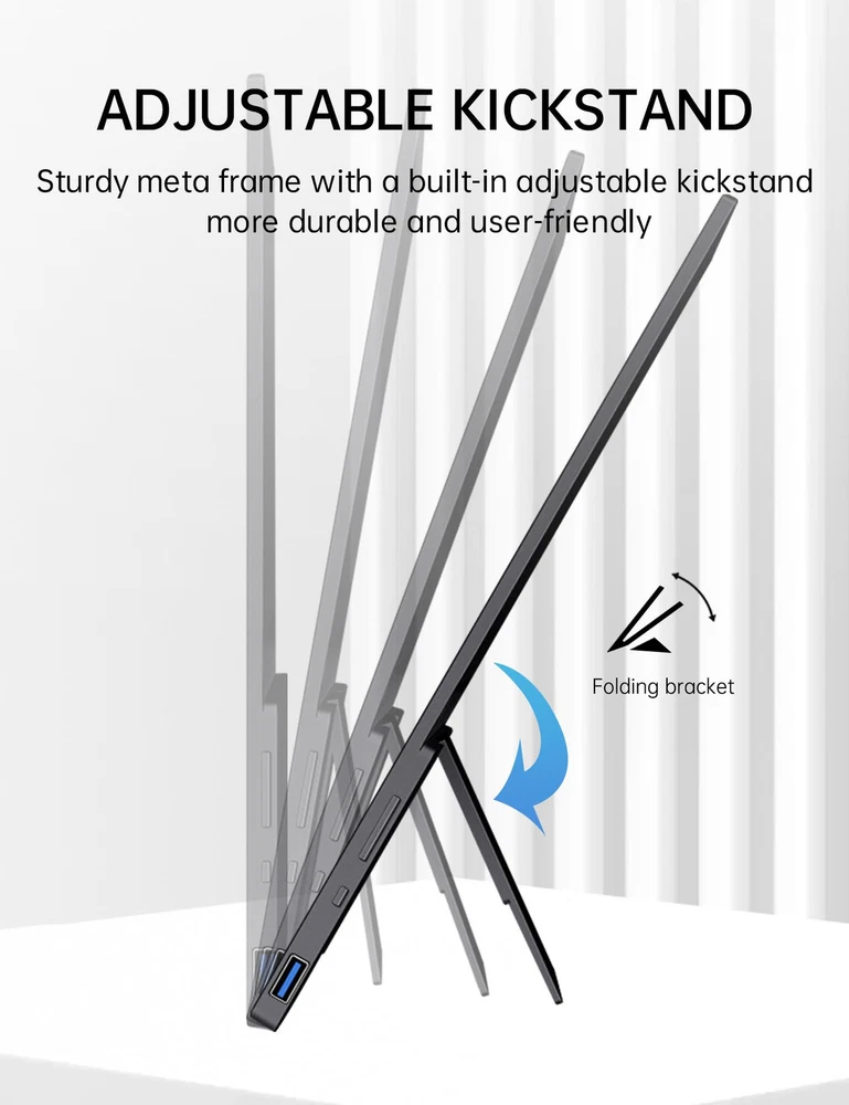 Make Your Devices Touch-enabled: This portable monitor features a 10-point capacitive touch. It is compatible with both Windows and macOS systems, allowing you to add touch functionality to your laptop, including Macbook, by simply connecting it via the Type-C interface. MUST NOTE: For Type-C 3.1 DP ALT-MODE or Thunderbolt 3/4 ports, use USB-C to USB-C cable for power, video, and touch. Use HDMI+USB-C for devices without these ports. No extra drivers required. FHD Portable Monitor: The portable monitor features a 15.6-inch touchscreen with a Full HD resolution of 1920x1080. Its advanced IPS display offers a wide viewing angle of 178°, delivering accurate and vibrant colors that are perfect for gaming and watching videos. Moreover, the monitor is equipped with blue light reduction and flicker-free technology, ensuring a comfortable viewing experience even during long periods of use and reducing eye strain. Lightweight and Portable Travel Monitor: Designed to be ultra-slim and easy to carry. Its compact size makes it a convenient option for people on the go who need a second screen. Whether you're a traveler, student, gamer, engineer, or anyone who needs a portable monitor, this device can easily fit into any suitcase or backpack. It's perfect for those who require a second screen while out and about. Full Size HDMI and USB-C Ports: The monitor has Standard HDMI and USB-C ports, providing versatile connectivity options. You can connect it to a variety of devices, including laptops, desktops, gaming consoles, and mobile phones. Built-in Kickstand and Speakers: The Portable Monitor has a built-in kickstand that allows you to easily prop it up at different angles, making it comfortable to use while sitting or standing. Additionally, it features built-in speakers that deliver clear and immersive audio, enhancing your multimedia experience.
