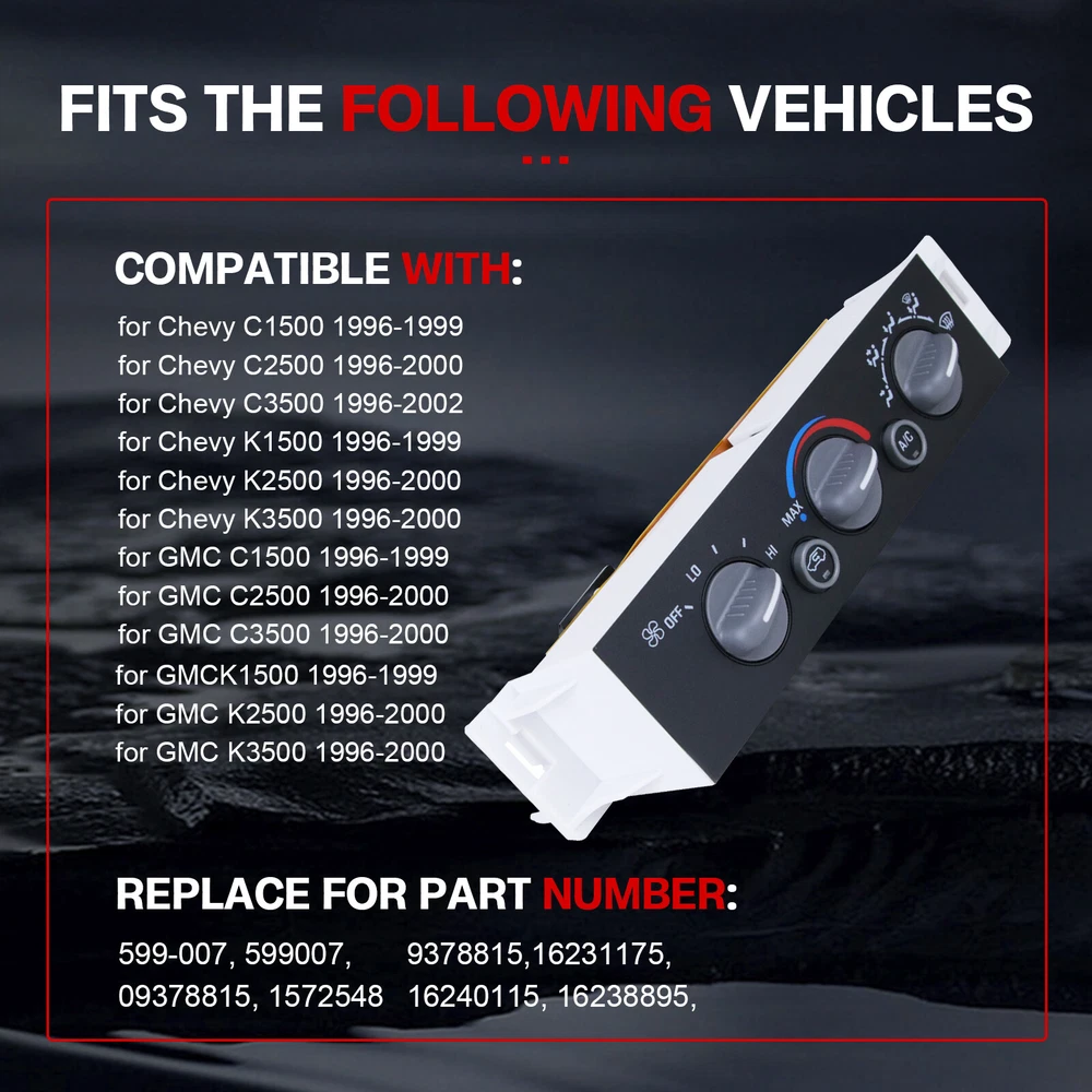 Store Categories Store Categories High Pressure Fuel Pump Liftgate Actuator Struts Oxygen Sensors Rear View Backup Camera Climate Control Panel Tire Press Monitoring System Master Power Window Switch Other For 1996-2000 Chevy GMC 1500 2500 3500 OE: 16231175/16238895/16240115/9378815/599-007/15-72548 Product Description Pa cka g e includes: 1 × A/C Heater Control Panel Fitme nt : (For Reference Only): For 1996-1999 Chevy C1500 Truck For 1996-2000 Chevy C2500 Truck For 1996-2002 Chevy C3500 Truck For 1996-1999 Chevy K1500 Truck For 1996-2000 Chevy K2500 Truck For 1996-2000 Chevy K3500 Truck For 1996-1999 GMC C1500 Truck For 1996-2000 GMC C2500 Truck For 1996-2002 GMC C3500 Truck For 1996-1999 GMC K1500 Truck For 1996-2000 GMC K2500 Truck For 1996-2000 GMC K3500 Truck Features: 100% Brand New. According to o riginal factory specifications, perfect match to original car . Made of high quality material. Parts are from certified professional factory. Specifications: 100% Brand New and High Quality Stable characteristics, high reliability. Fitment Type:Direct Replacement Interchange Part Number:16231175/16238895/16240115/9378815 Other Part Number:599-007/15-72548 Note: Pleas e Check Carefully To Make Sure the OE Number And Picture are Exactly Listed Are The Same As Your Orignal One. If You are Not Sure Whether It Fits, Please send VIN number to us. No Instruction Included, professional installation is highly recommended . Payment Policy Shipping Policy Returns Policy Warranty Payment Policy 1. We accept Paypal, Credit Card, Veno,Goggle Pay,American Express,Discover, Direct Debit, VISA, eCheck, or othe r methods, please kindly check Paypal for more information. 2. For multiple purchases, please add items to your Ebay shopping cart and pay once for entire order. Shipping Policy 1. All items will be shipped to buyer's ebay address. 2. All items will be shipped within 24 working hours upon receipt of payment, and multiple items might be combined shipping. 3. In most cases, delivery takes around 3-7 business days, it's highly depended on the efficiency of the shpping carrier. If your item doesn't arrive on time, please contact us immediately for further assistance. Please note there is no local pickup service available. 4. We do appreciate your purchase here. If you are astisfied with the item as well as our service, please kindly leave us a Positive Feedback to help develop our bu siness. Th ank you in advance. Returns Policy We have a friendly and dedicated customer support teams to handle any problems you come up with our products. Please contact us first via email or message for replacement, refund or technical problem caused by any reason. Warranty 30 Days Free Return and Money Back Guarantee. If you are not satisfied with your purchase, you can return the item with original packaging back to us for full refund, not any re-stock fee. The return cost should be paid by buyer. 5 Year Unl imited Mileage Quality Guarantee If you receive any w rong items, or damage during the transportation or defect items, we will accept the return and pay the return freight. Please noted that the return cost should be prepaid by buyer, we will issue the refund of return cost to buyer after inspecting the faulty item. The full refund or replacement will be available for all faulty items, including the original shipping cost. Please kindly contact us b efore return, our representatives will send you the detailed return instruction. The guarantee will be only for the cost of the item, we will not responsible for installation or other fees like labor expenses, towing expenses, additional repair expenses or other related expenses. Copyright © 2023 Dianxiaomi