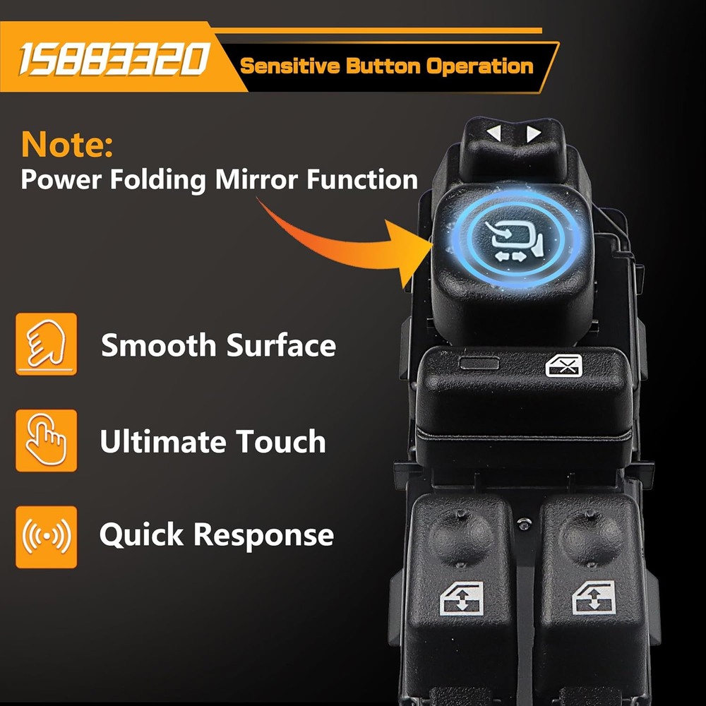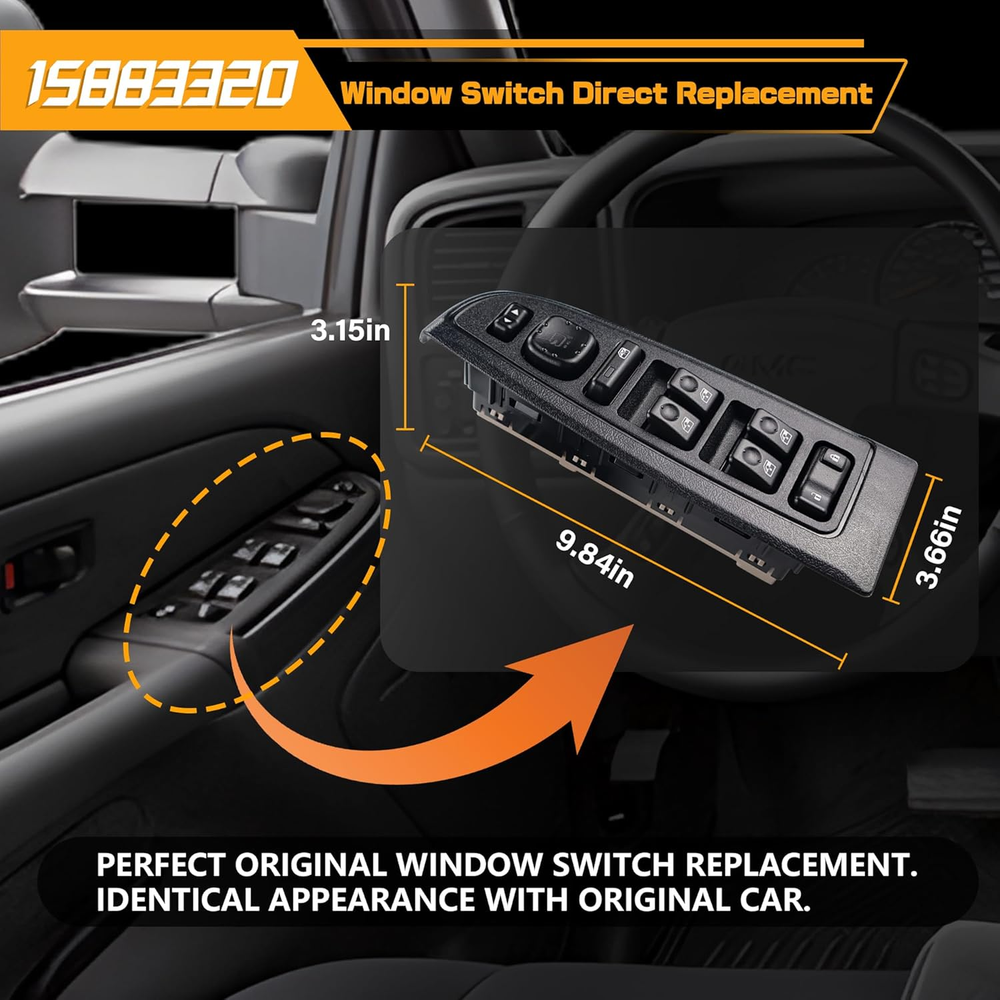 Replace Part Number: 920-020, DWS241, 1S15663, 10398565, 15109668, 15112972, 15125143, 15181223, 15195301, 15202851, 15883320. Please check the part number of original switch before ordering. Vehicle Fitment-1: Compatible with Chevrolet Avalanche 1500/2500 03-06, Silverado 1500 04-06, Silverado 1500 Classic 07, Silverado 1500 HD 03 05 06, Silverado 1500 HD Classic 07, Silverado 2500 04, Silverado 2500 HD 03-06, Silverado 3500 03-06, Silverado 3500 Classic 07, Suburban 1500/2500 03-06, Tahoe 03-06. Vehicle Fitment-2: Compaible with Sierra 1500 04-06, Sierra 1500 Classic 04-07, Sierra 1500 HD 03 05 06, Sierra 1500 HD Classic 07, Sierra 2500 04, Sierra 2500 HD 03-06, Sierra 2500 HD Classic 07, Sierra 3500 03-06, Sierra 3500 Classic 07, Yukon 03-06, Yukon XL 1500 03-06. Compatible with Escalade 03-06, Escalade ESV/EXT 03-06. Precise Design: Perfect original switch replacement, very easy to install, ideal solution for your defective window switch. Premium Quality: This window door switch assembly is made of quality ABS & polycarbonate material to provide better performance and sensitive. Product Description