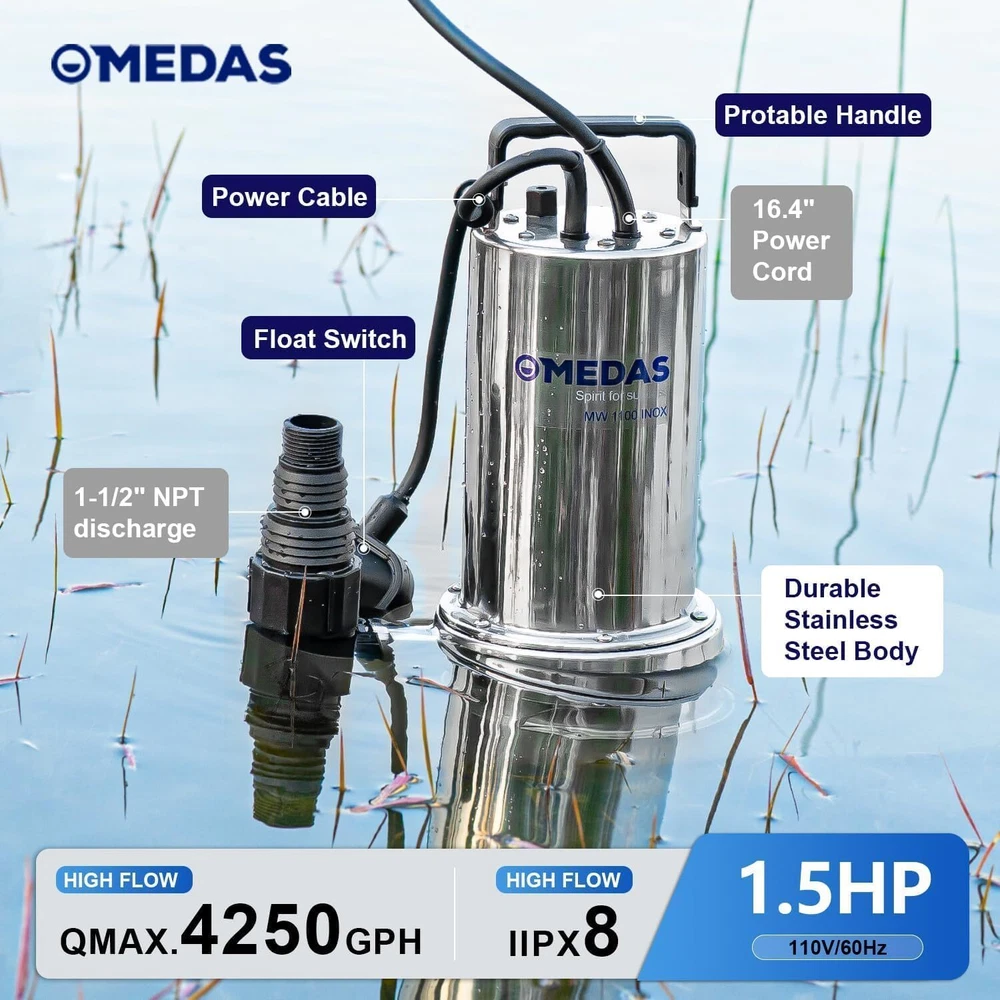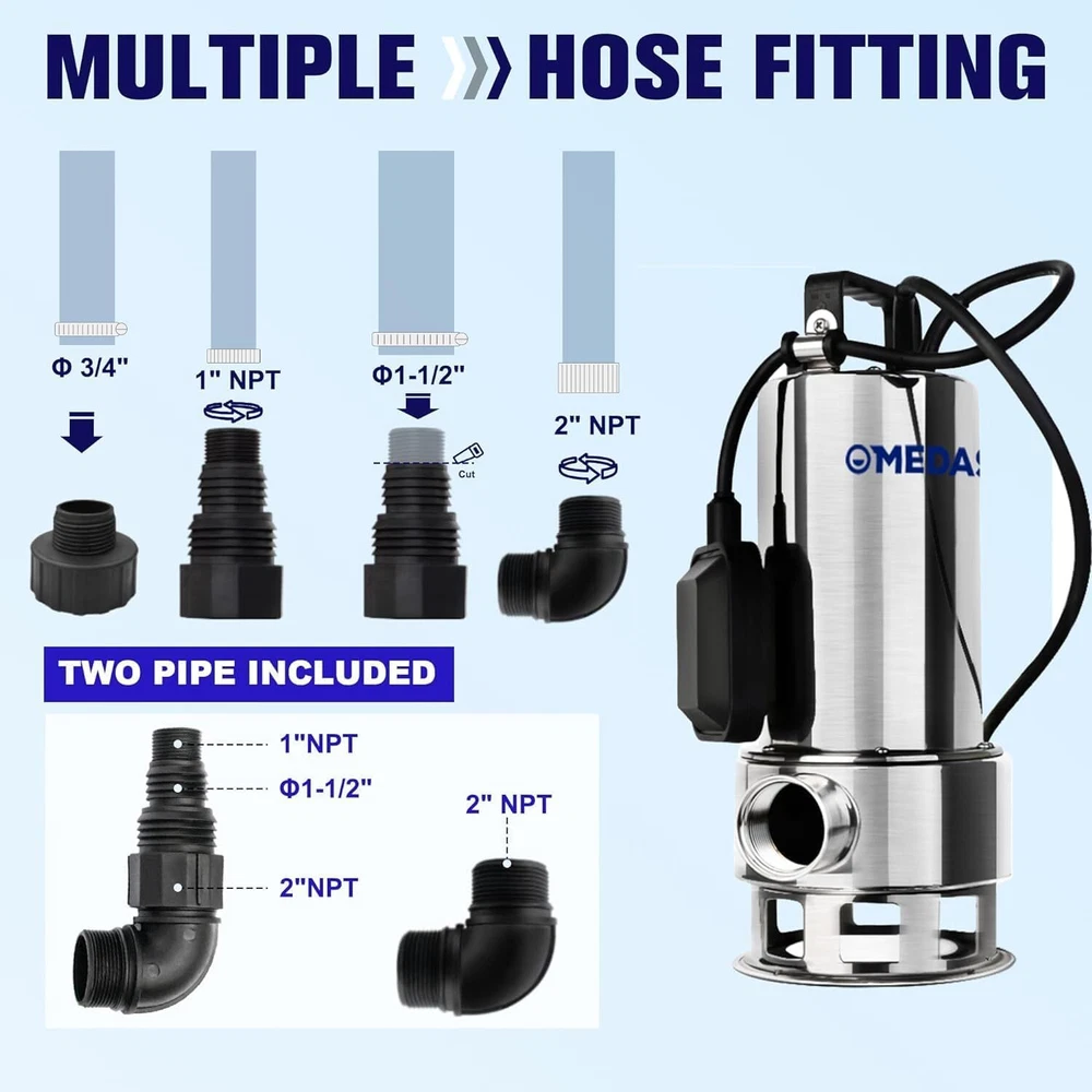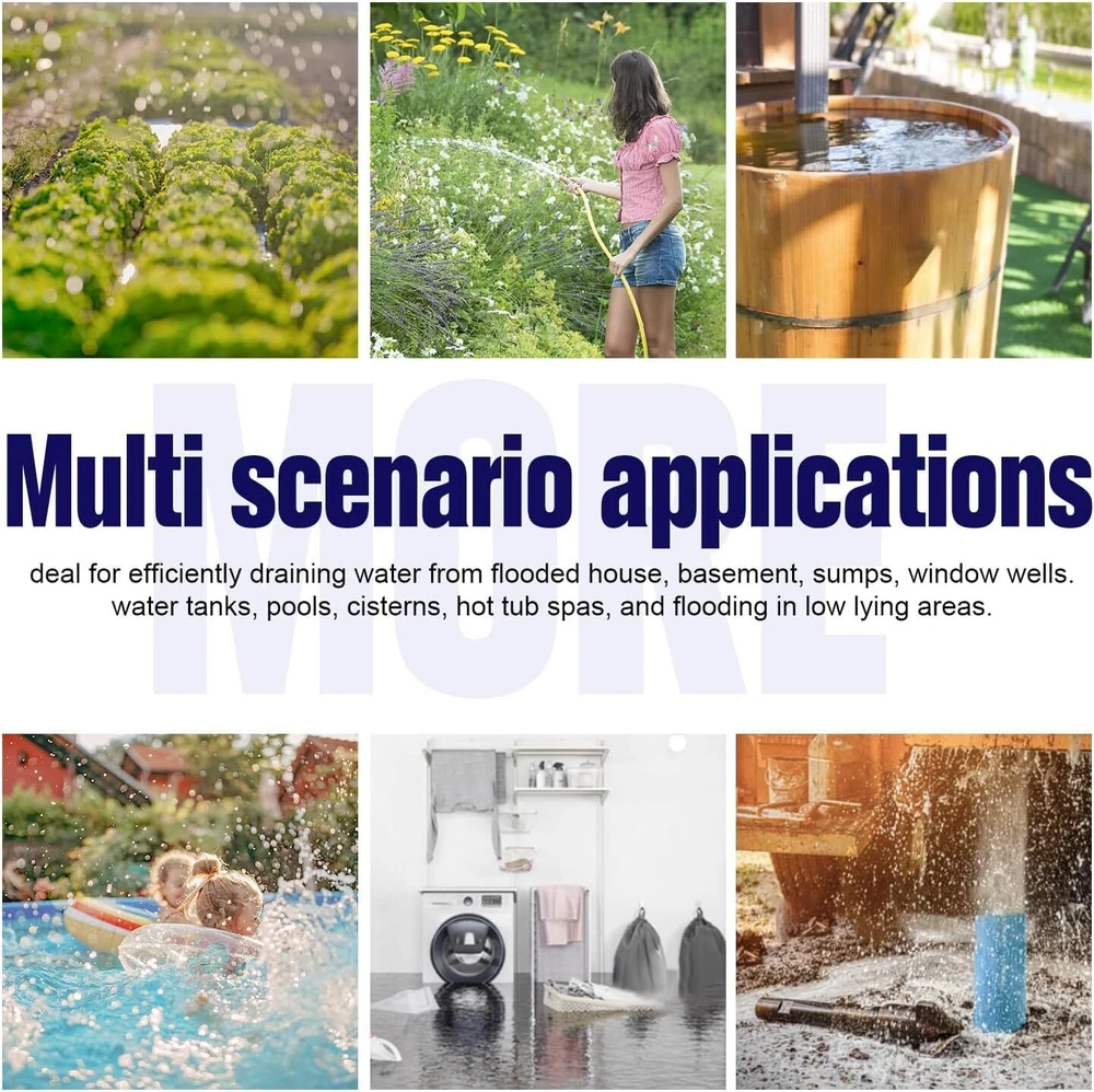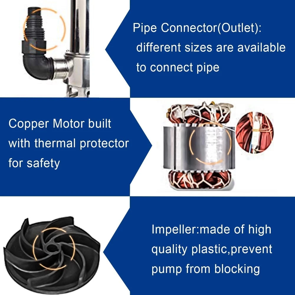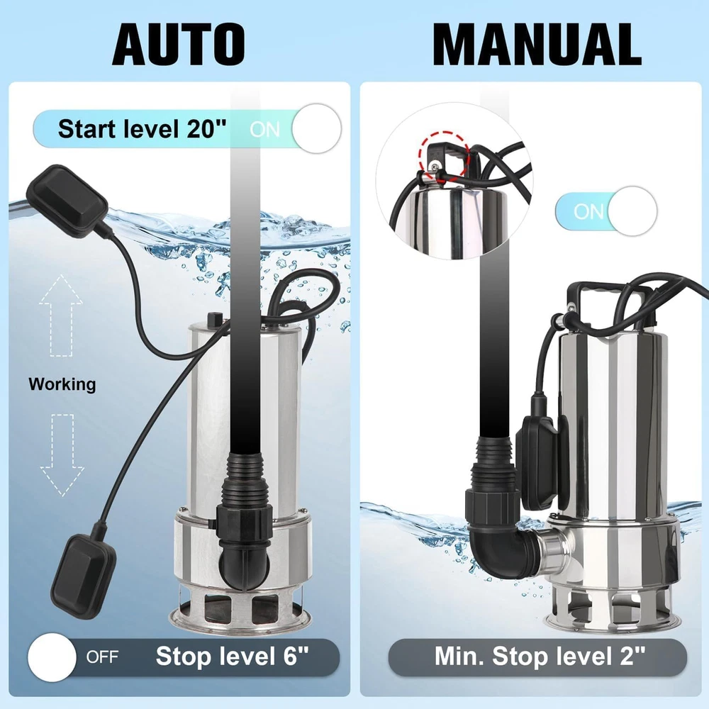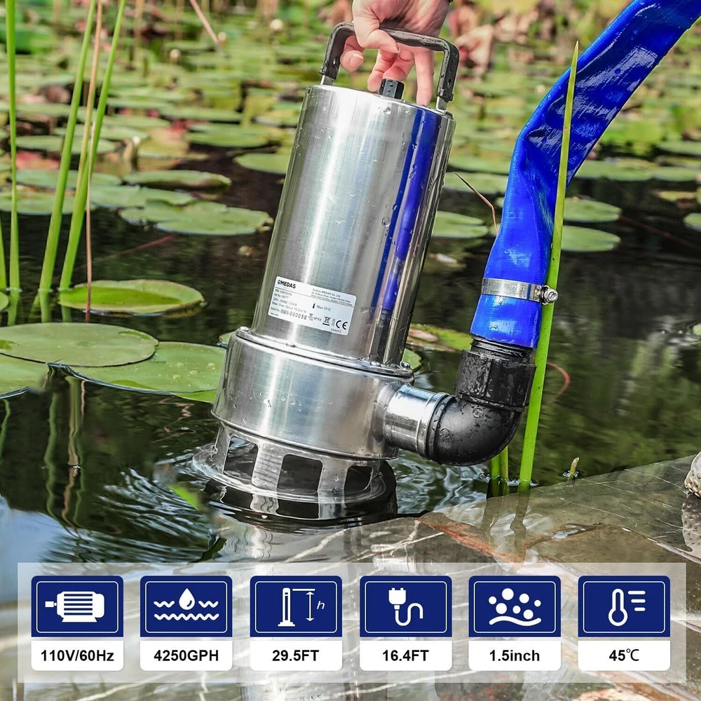 You may also like 12V Water Pressure Diaphragm Pump Self-Priming Pump 55 PSI 3.5 GPM Boat RV 50.57 USD 53.23 USD Free shipping 5% off 1.5HP 4250GPH Full Stainless Steel Water Sump Pump, Clean/Dirty Submersible Pump with Automatic ON/OFF Float Switch, Water Removal for Basement Pool Pond Garden and Hot Tub Color Silver Material Stainless Steel Style Stainless Steel Submersible Pump Power Source Corded Electric Maximum Lifting Height 29.5 Feet High-Performance Motor: Our water pump features a 1.5HP, 1100W powerful motor, delivering exceptional performance with a flow rate of 4250 GPH. It efficiently moves water up to 29.5 feet of vertical height, making it ideal for various draining tasks. The motor's design ensures energy efficiency and quiet operation. Robust Stainless Steel Construction: Crafted with a full stainless steel casing, our pump boasts superior durability and corrosion resistance. This robust construction, combined with excellent cooling capabilities, ensures a long lifespan, even in continuous duty water removal applications. Automatic Float Switch for Easy Operation: The pump includes an automatic float switch, which activates the pump when the water level rises and turns it off when the water level drops. This feature ensures hassle-free operation, particularly in situations where constant monitoring isn't feasible. Versatile Discharge Options: Equipped with a G1-1/2" discharge outlet, our pump is designed to handle high-capacity pumping efficiently. This versatile outlet size is compatible with various hoses, making installation and operation in different scenarios like flooded basements, pools, or tanks effortless. Extended Reach and Reliable Customer Support: The pump comes with a 16.4ft long, grounded, and waterproof power cord, providing ample reach for distant installation sites.