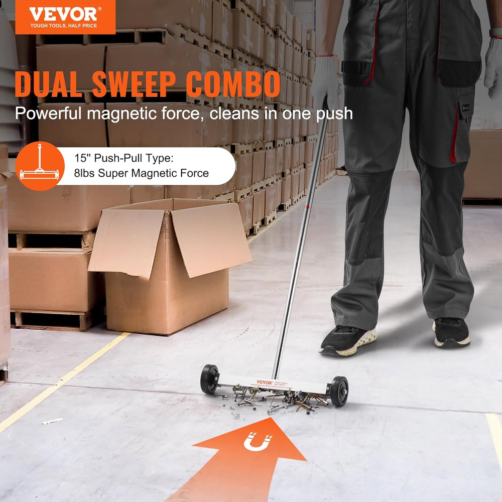 Strong Magnetic Power: This 15'' mini magnetic sweeper maintains a load capacity of up to 8 lbs (3.6 kg), making it easy to quickly collect nails, screws, and black metal debris, protecting you from shards and sharp metals. Lightweight and Portable: The 15-inch rolling magnetic sweeper features an adjustable telescoping handle from 17.52 to 40.94 inches (445-1040 mm) and weighs only 12.37 lbs. It saves space and is perfect for narrow areas, ideal for collecting nails or small metal parts in homes, small spaces, or yards. Easy to Use: The magnet sweeper is designed with an ergonomic rubber handle for a comfortable, prolonged grip. The Ø2.95-inch (75 mm) wheels effortlessly clean over gravel and grass surfaces. It includes a brush for added convenience. Durable Construction: Made from high-quality materials including aluminum, plastic, magnets, and iron, the nail magnet sweeper withstands demanding work environments. Featuring an aluminum alloy shell that's durable and corrosion-resistant. The anti-disassembly screw design ensures stability, while the PP + rubber wheels provide durability and traction. Versatile Application: With a wide cleaning range, the magnetic nail sweeper efficiently picks up damaged nails, screws, and black metal waste, especially useful in garages, roofing projects, or post-automotive or mechanical repairs. Pro tip: After projects, clean floors, lawns, garages, and workshops to prevent injuries. Product Description VEVOR Magnetic Sweeper - Say Goodbye to Metal Debris This 15'' push-pull rolling magnetic sweeper is equipped with magnets capable of pulling up to 8 lbs (3.6 kg), swiftly collecting excess metal debris wherever needed. Compact and lightweight, this magnetic sweeper is easy to carry and store, ensuring efficient workspace organization wherever your job takes you. Easy to use, this magnet sweeper simplifies operation without requiring professional guidance. Follow straightforward steps for effortless cleaning, making it accessible even for beginners. Our nail magnet sweeper features a corrosion-resistant metal base and ergonomic rubber grips for durability and comfort. PP + rubber wheels provide durability and traction, while anti-disassembly screws ensure stability and longevity. With an exceptionally wide cleaning range, the magnetic nail sweeper covers more ground and absorbs more metal, making it suitable for construction sites, factories, warehouses, and more.