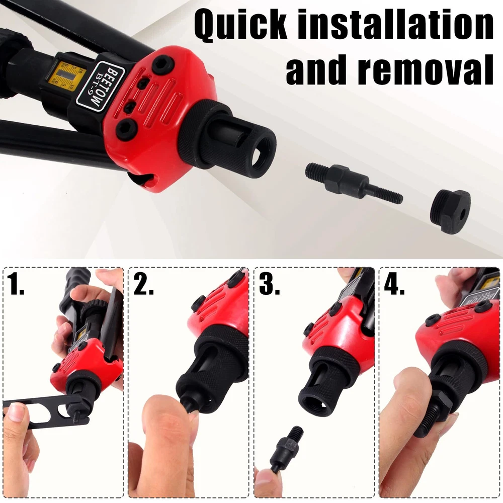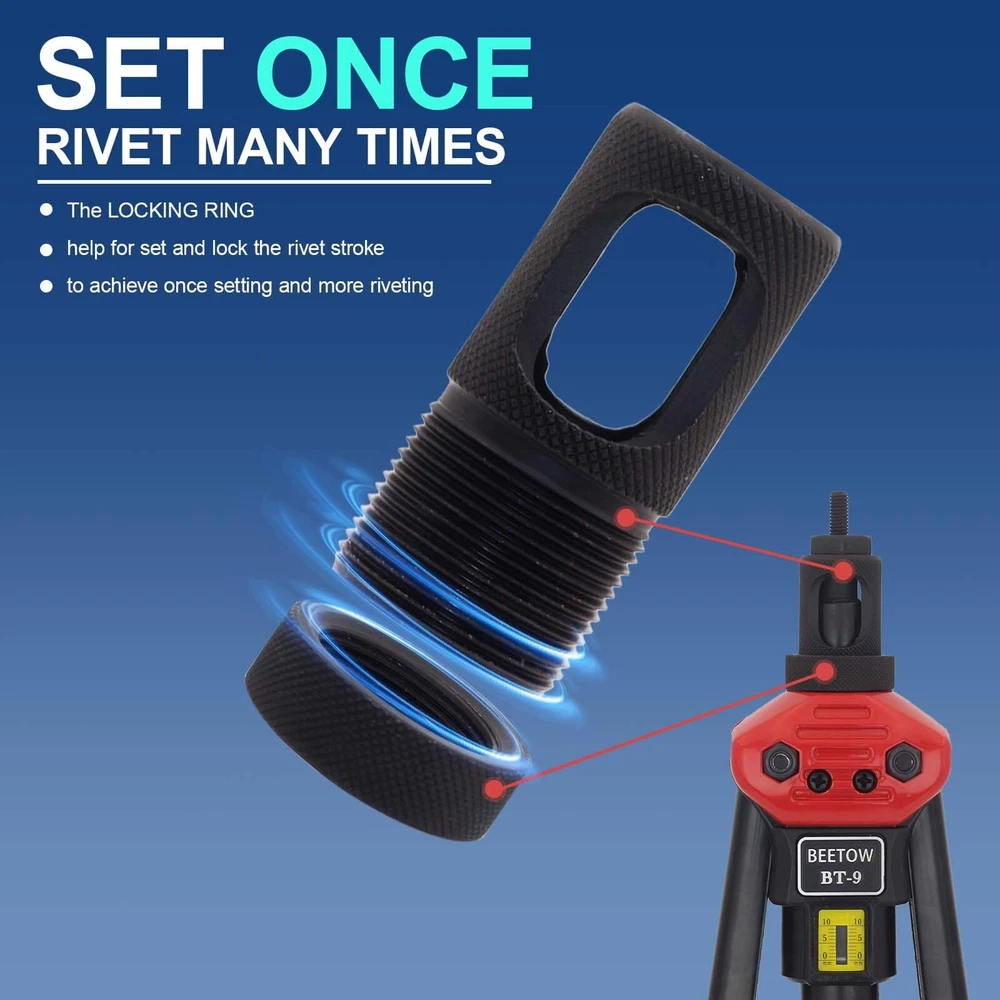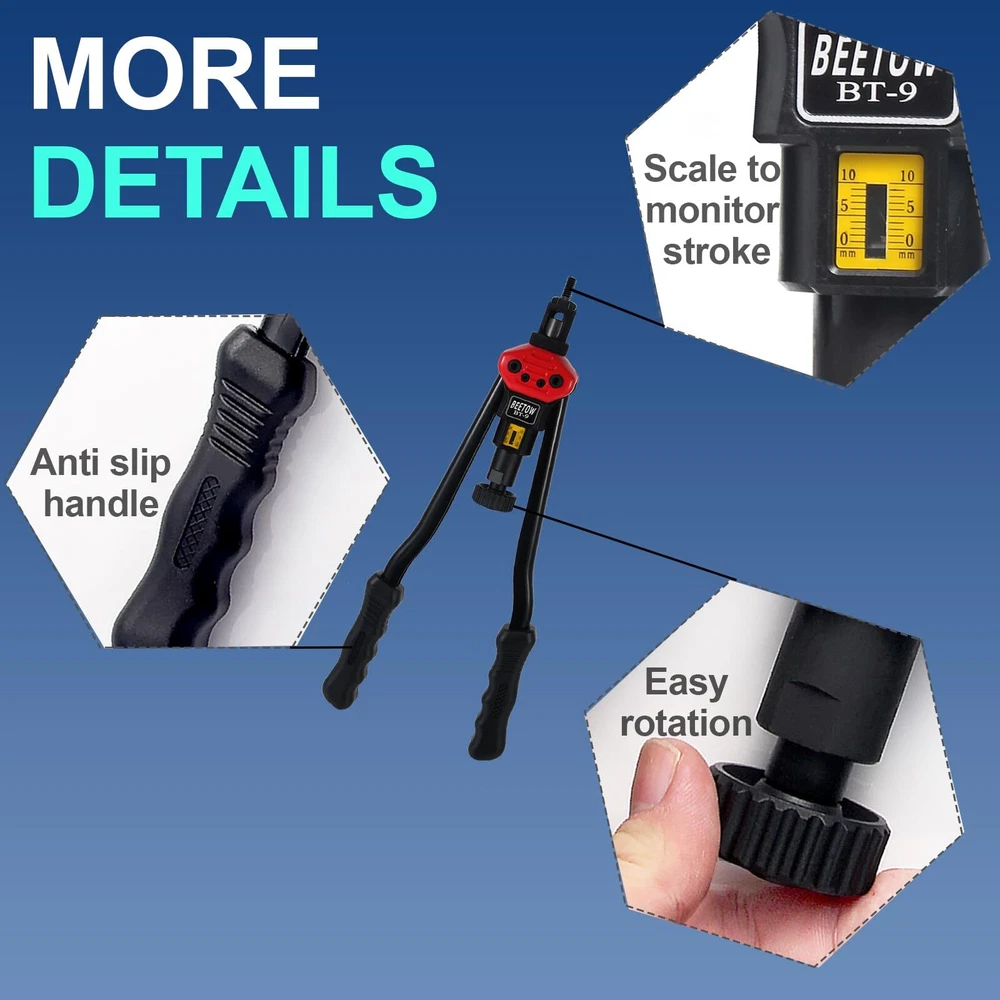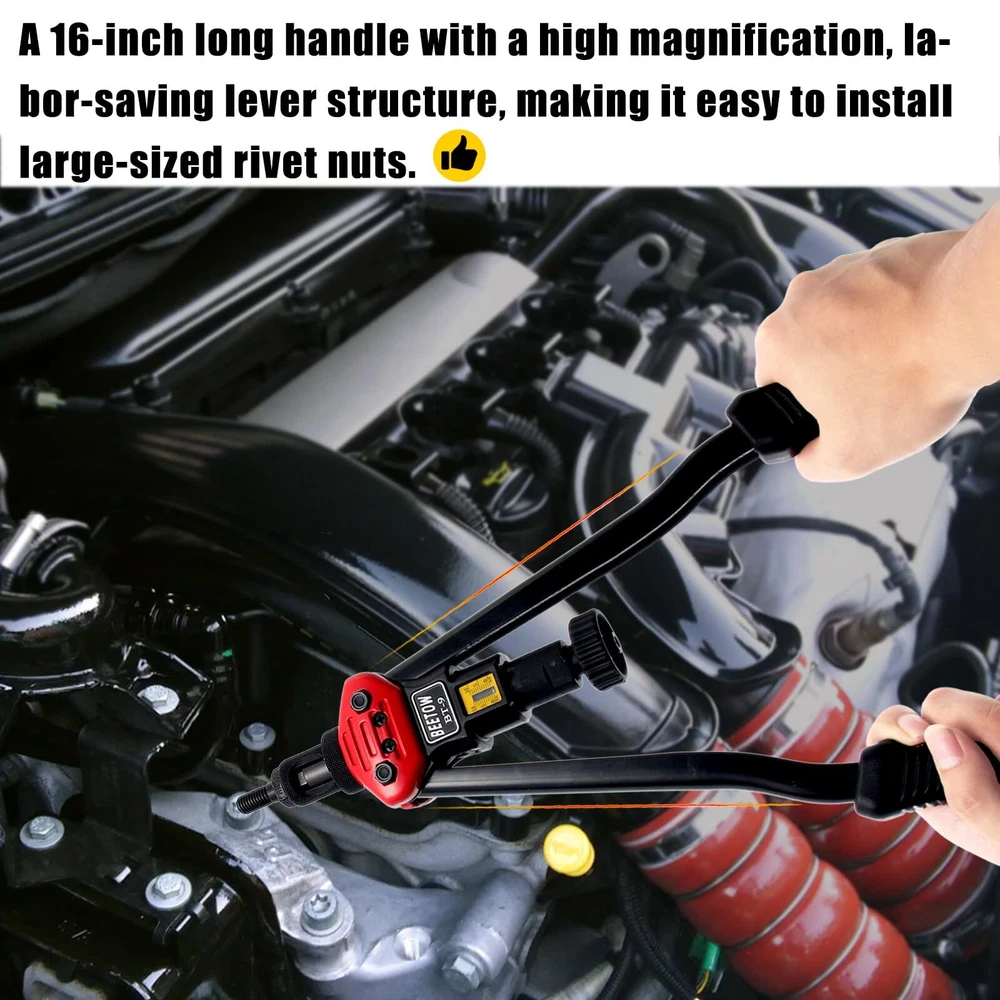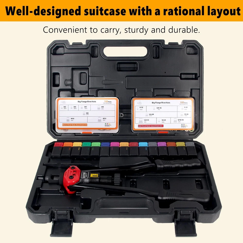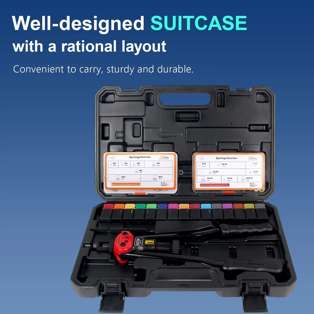 Upgrade your toolbox with our Premium Rivet Nut Tool Set, the ultimate solution for all your riveting needs. Whether you're a professional mechanic, an avid DIYer, or just tackling home repairs, this tool set is built to deliver reliable, long-lasting performance. Rivet Nut Tool makes it easy to insert load-bearing threaded rivet nuts in thin gauge materials such as sheet metal, panels, tubes and extrusions as well as castings and housings. The specialized sliding head exerts consistent leverage to expand the rivet nut flange. The easy-to-change mandrel unit comes with mandrels and nosepieces for SAE and metric rivet nuts Heavy-Duty: 16 Inches Rivet Nut Tool, the unique lever design and low friction of the internal components ensure stability and durability during riveting. Even M12 rivnuts can be easily riveted Not easy to break: Equipped with a stroke window and locking ring, it is designed for thinner mandrels to precisely determine riveting stroke parameters and prevent breakage Set Once, Rivet Many Times:The STROKE WINDOW and LOCKING RING , help for set and lock the rivet stroke, to achieve once setting and multiple riveting More details: Main components is constructed from high-strength alloy steel that has been heat-treated, ensuring exceptional toughness and durability. Equipped with ergonomic plastic handles, these hand riveter are not only non-slip but also provide a comfortable grip Provide: SEVEN Types Metric Mandrels AND EIGHT Types SAE Mandrels (M3 M4 M5 M6 M8 M10 M12) (6-32, 8-32, 10-32, 10-24, 1/4-20, 5/16-18, 3/8-16, 1/2-13) Provide: SEVEN Types Metric Rivet Nuts:M3(20PCS), M4(20PCS), M5(10PCS), M6(33PCS), M8(8PCS), M10(4PCS), M12(5PCS) Provide: EIGHT Types SAE Rivet Nuts:6-32(14PCS), 8-32(10PCS), 10-32(10PCS), 10-24(15PCS), 1/4-20(33PCS), 3/8-16(8PCS), 5/16-18(8PCS), 1/2-13(2PCS)