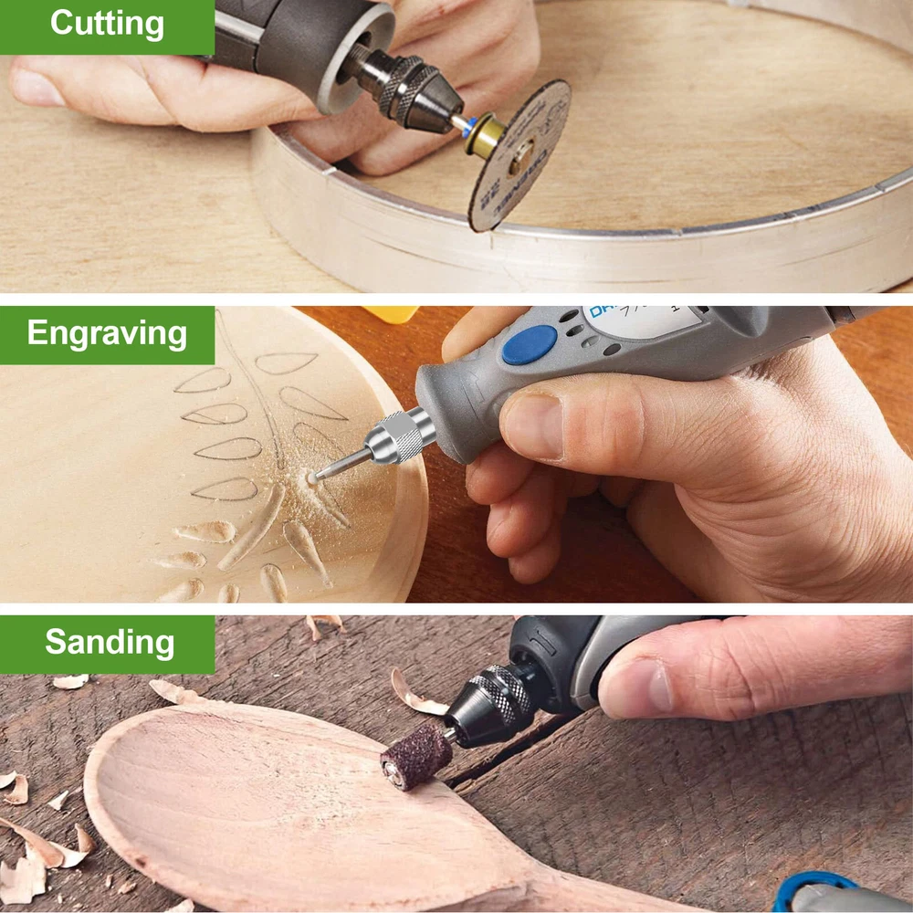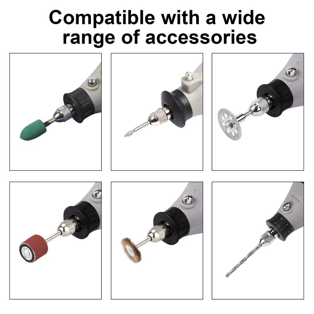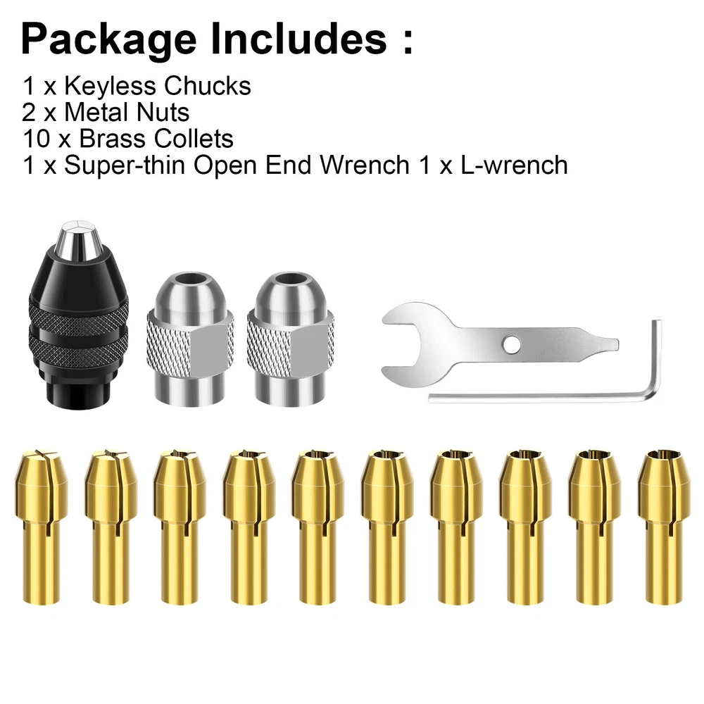 Product Feature ✨ Metal Nut: Made from durable metal, providing sturdiness and stability. Unlike plastic nuts that often break during use, our all-metal nuts offer superior durability and safety. ✨ Brass Collet: Crafted from high-quality brass for excellent wear resistance and durability. The brass collet enhances precision and holds fine bits firmly, maintaining stability at high speeds and boosting efficiency. ✨ Keyless Chuck: A built-in spring ensures secure attachment, preventing accessories from detaching or flying out during use. It accommodates accessories from 1/32" to 1/8" shank sizes. ✨ Wide Application: Compatible with Dremel rotary tools, this drill chuck collet set is perfect for light-duty accessories such as drill bits, sanding drums, polishing wheels, wire brushes, and cut-off wheels. Product Specification Type Drill Chuck Collet Set Material Metal+Brass Clamping Range 0.5mm~3.2mm(0.5, 0.8, 1.0, 1.2, 1.5, 1.8, 2.0, 2.4, 3.0,3.2) Fit for 1/32" to 1/8" shank sizes Package Included 🎁1 x Keyless Chucks 🎁2 x Metal Nuts 🎁10 x Brass Collets 🎁1 x Super-thin Open End Wrench 🎁1 x L-wrench Location Descriptions To improve your buying experience and ensure fast delivery, Your order will be shipped from the warehouse located in either new jersey or california that is closest to your address. If you have any questions, Please contact us. Thank you for your support !