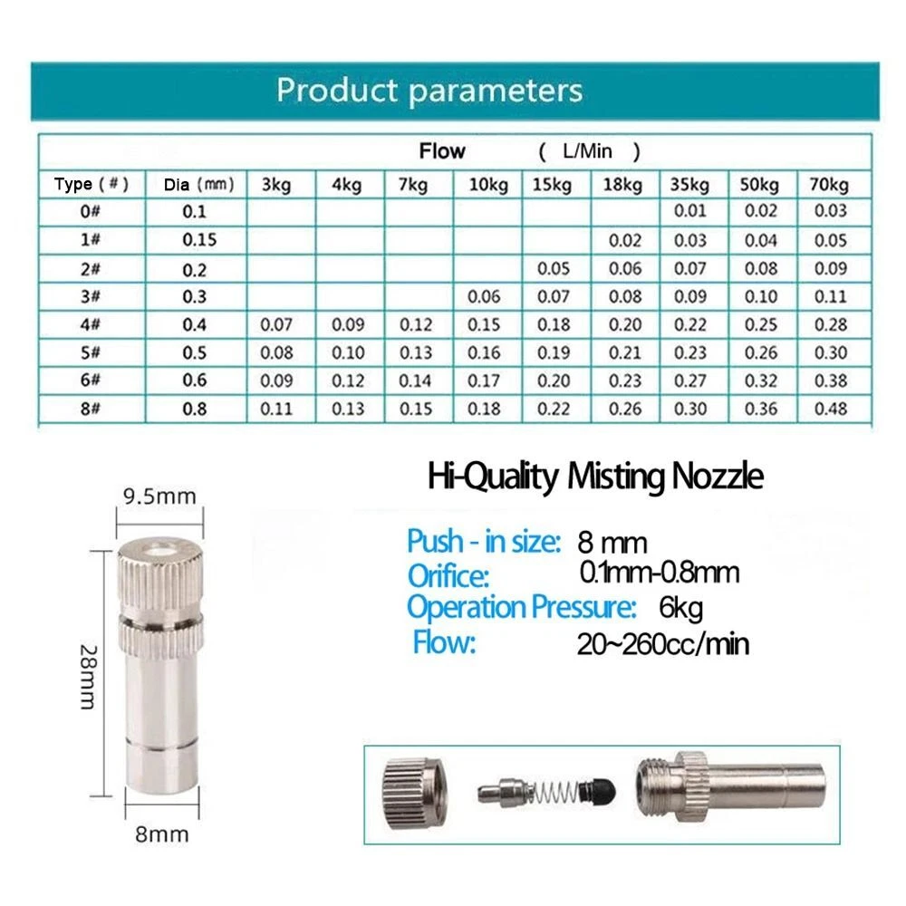 1/5Pcs 8mm Atomizing Misting Nozzle Water Irrigation Sprinkler Spray Nozzles Material: Brass nickel plated + Plastic Brand New and High Quality Quantity: 1Pcs/5Pcs Color: Show as picture Connection size: 8mm Nozzle Size: 0.15mm, 0.2mm, 0.3mm, 0.4mm, 0.5mm, 0.6mm, 0.7mm, 0.8mm Features: - Using high quality materials, high quality manufacturing process, strong and durable, good service life. -This atomizing nozzle adopts a quick-connect design for easy installation and removal. - This sprayer is made of copper and galvanized, so it is durable and not easy to break. This misting nozzle is built to last and is a good choice for replacing worn or damaged ones. - This spray nozzle is designed to spray a fine mist that can water plants and cool greenhouses. Suitable for home gardens, patios, patios, lawns, conservatories and more. Notice: 1. The real color of the item may be slightly different from the pictures shown on the website caused by many factors such as brightness of your monitor and light brightness. 2. Please allow slight manual measurement deviation for the data. Thank for your understanding. 3. 1cm=0.39''. Package Included: 1x/5x Spray Nozzles * Please make payment asap, then we can arrange shipment for you asap * Item will be sent within 1-2 days of payment verification. * We appreciate your patience and allow sufficient time for delivery. Please feel free to contact us if you don't receive your package ! * We will carefully test every item before shipment.The quality is guaranteed! * Any questions, please contact us via eBay message, In our working hours will be resumed within 48 hours. * If you are satisfied with our service, please kindly leave us a positive feedback and give us the Detailed Seller Rating with all "5 stars" in very area. * Our aim is to provide Top Level Customer Service, your recognition will encourage us greatly and serve you better. We strive to keep all our customers satisfy. * We greatly appreciate your POSITIVE feedback. Please do NOT leave negative feedback without asking for help. Thanks! * You can contact us through email , We will reply you as soon as possible !