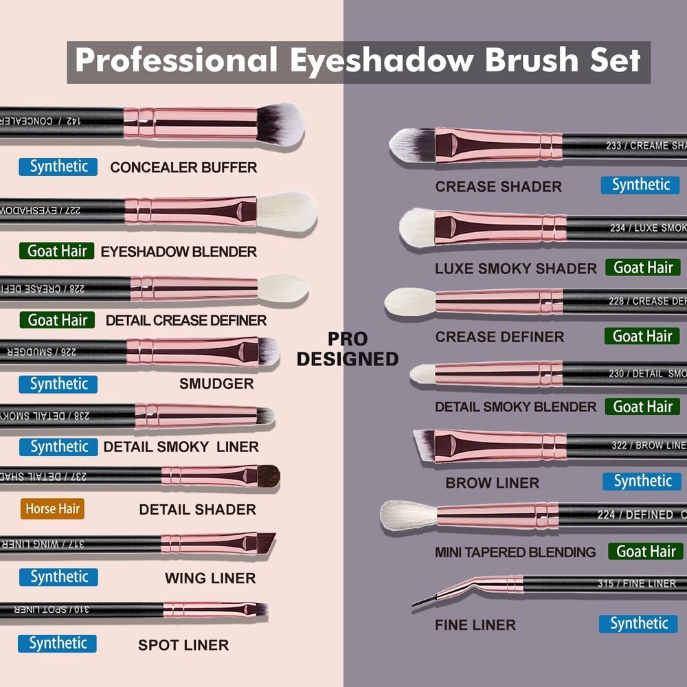 【Professional Grade Quality Designed for makeup artists and professional users 】Crafted with soft, dense, and non-shedding Goat Bristle, Pony hair ,Premium quality synthetic, ensuring smooth and precise makeup application. Experience the luxury of professional-grade tools at an affordable price. 【Essential Comprehensive Eye Brushes Set 】This 15Pcs Pro eye makeup brush set includes essential brushes for pressed powder eyeshadow application, liquid, cream blending, eyeliner smudge, eyebrow grooming, and concealing. 【Comfortable Using Experience 】These brushes effortlessly blend all powder formulas, cream foundation ,Concealer. Delivering a seamless, soft-focus finish. Deliver precise and streak-free results and leaves a silky smooth feeling. 【Waterproof & Durable 】Featuring lightweight wooden handles for comfortable grip, Seamless installation process ensures excellent waterproof performance, Make Sure it is washable and Durability use without Break 【Labeled Eyeshadow Brush Set &Great ideal gift 】Every Brushes are individually named and numbered with it is function on brush handle and Come with Pro User`s Guide book; Brushes set come in a gift-box that is a decent gift for woman and girl(wife, mom, sister, daughter, girlfriend) such as birthday, Christmas Day, Valentine's Day, Thanksgiving Day, Mothers Day, New Year.