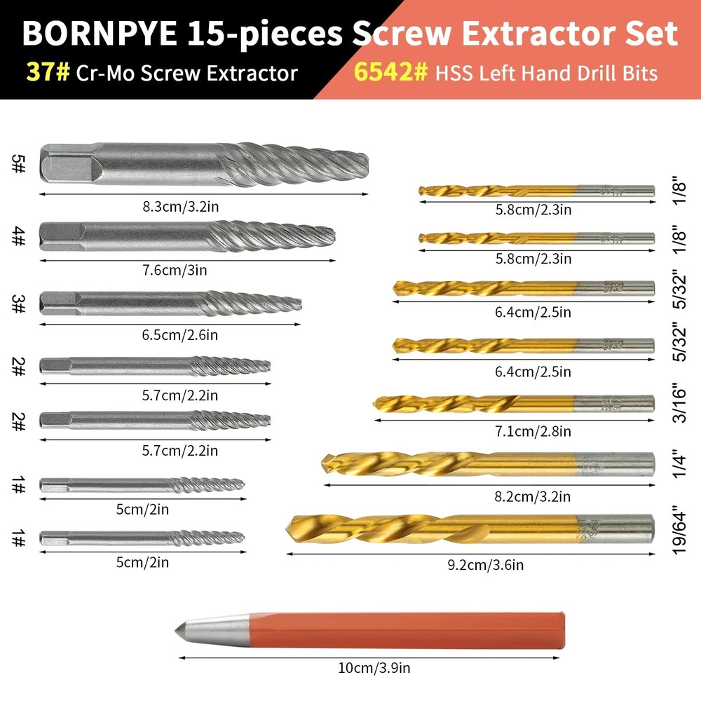 【6542# LEFT-HAND DRILL BIT SET】:Left-hand drill bits are made from cobalt-fortified high-speed steel for increased durability and service life. The 135° angle design of the head makes it easier to touch the fasteners and ensures precise countersinking and hole smooth clean. 【MULTIPLE SIZES】: 7pcs HSS left-hand drill bits and 7 alloy steel bolt extractors. Left-hand bits / reversed drillbits - 1/8", 5/32", 3/16", 1/4", 19/64" and Matching Alloy Extractors (stud outs) - 2×1#, 2×2#, 3#, 4#, 5# in a portable storage case that provides excellent protection and against lost screw extractors. 【SAVE TIME AND EFFORT】: 37# CR-MO Extraction bits easily remove broken screws, studs, bolts and other fittings effectively. Stripped bolt remover and extractor works on seized bolts, broken fasteners, and commonly called an easy out. 【MULTI-PURPOSE】: Bolt extractors that remove broken screws, whether working on wood or metal, are ideal for construction, automotive, home DIY projects, or industrial use. These extractors are excellent for working in a production environment and using screw head bolts. 【PREMIUM SERVICE】:We are committed to providing every customer with the best products and best service. If you have any product questions, you only need to contact us through the Amazon platform. We have a professional team to solve it for you!