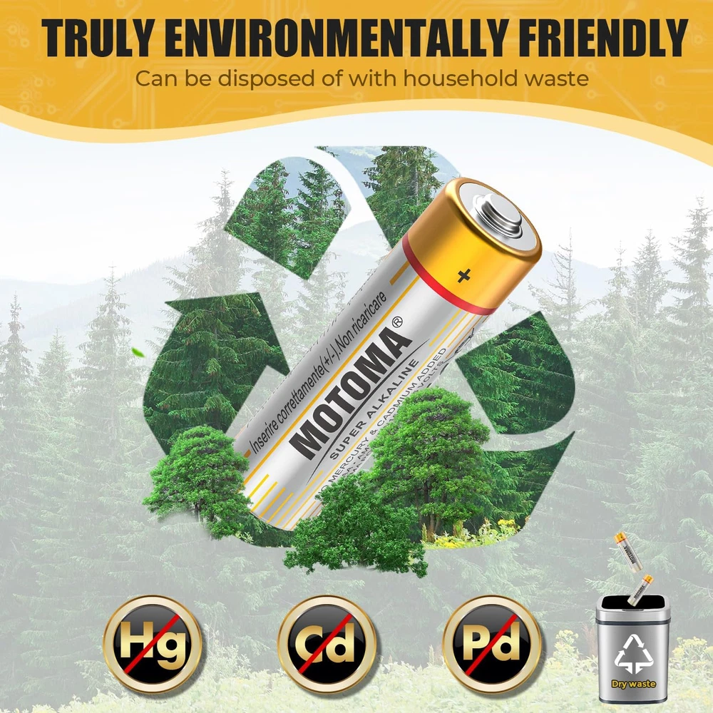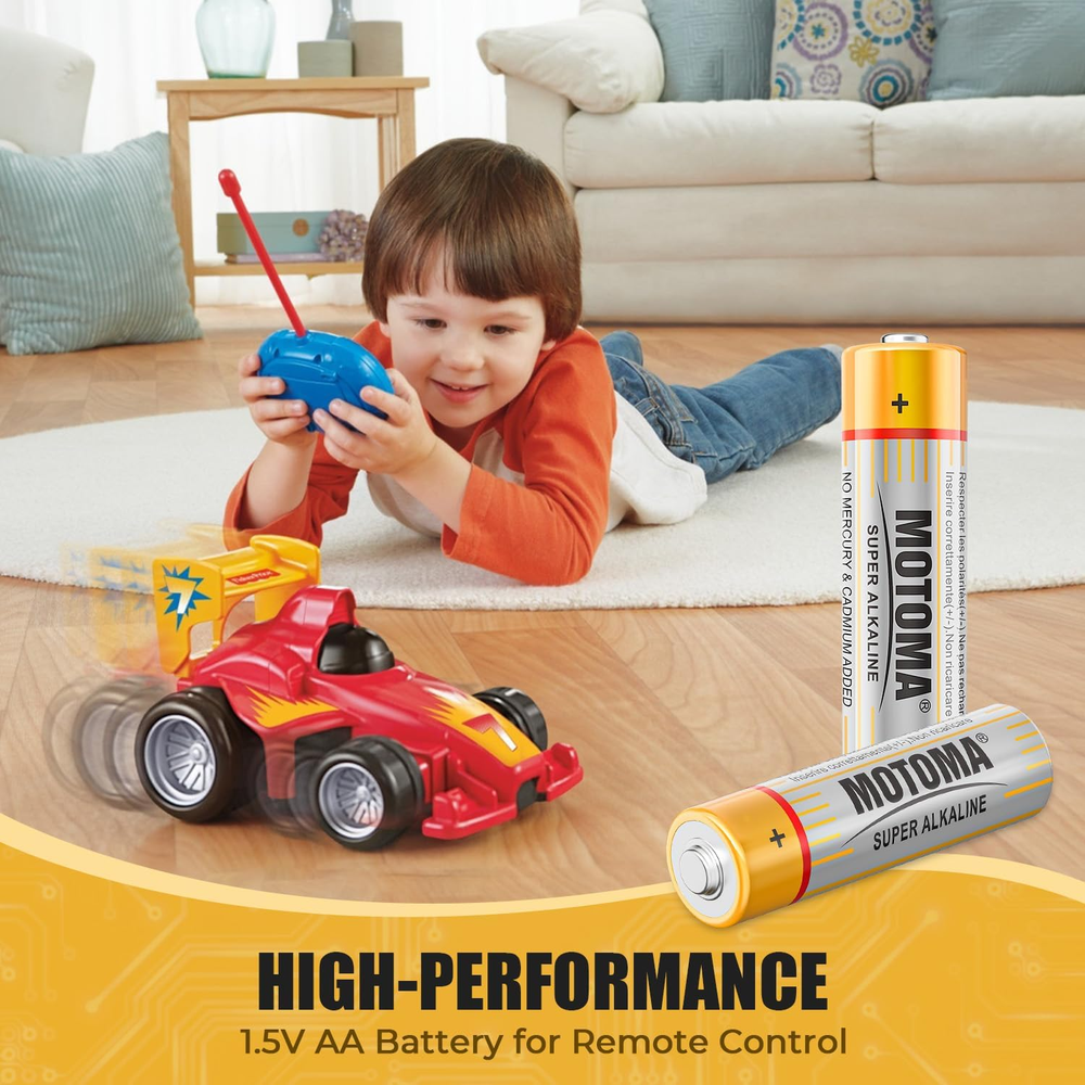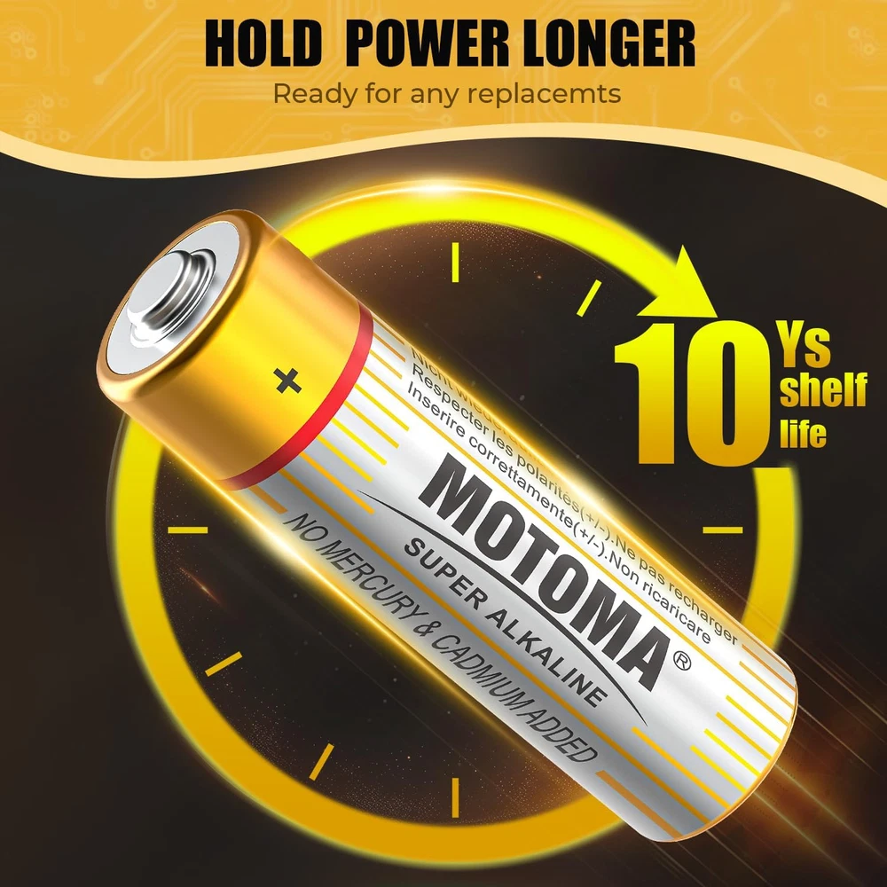 [Long-Lasting Alkaline Batteries] Upgraded second-generation alkaline batteries for stronger power and longer durability. After professional tested, it up to 40% longer battery life compared to MOTOMA carbon batteries. AA batteries 12 pack offers exceptional power output and extended lifespan, ensuring consistent and reliable energy for high-drain devices such as digital cameras, gaming controllers, and wireless headphones [Advanced Leakage Protection] With Triple safety valve, new anticorrosive steel shell, anti-aging sealing ring structure advanced leak-resistant design, effective prevention of liquid leakage. Batteries aa provide peace of mind even when stored for extended periods. The secure seal design minimizes the risk of leakage, protecting your valuable electronic devices from damage and preserving battery life [Fight Against Extreme Environment & Safe Use] Batteries aa perform well in the temperature range from -40℉ to 140℉. Don’t worry about the influence of weather. Double A batteries are made with mercury-free and cadmium added, making them safe for your family and the environment [10 Year Shelf Life & Easy to Store] Do Not Recharge! They are Non-chargeable Alkaline AA Batteries. Batteries aa With super long-lasting 1.5v constant discharge and positive ring fused with fine-conducting graphite,and minimize the need for frequent replacements. With good electrical conductivity, ultra-low loss and 10 year shelf life,you can peace of mind even when stored for extended periods [Widely Used] AA battery is perfectly fit for both high and low drain devices, from remote controls and toys to flashlights and portable speakers. This versatility makes them a must-have for every household, ensuring you always have the right power source at hand with 12 pack aa batteries Product Description The video showcases the product in use. The video guides you through product setup. The video compares multiple products. The video shows the product being unpacked. ALKALINE AA BATTERIES Long Lasting Power for Your Devices Lasts up to 9.9 times longer than regular batteries ALKALINE AAA BATTERIES Long Lasting Power for Your Devices Lasts up to 9.9 times longer than regular batteries