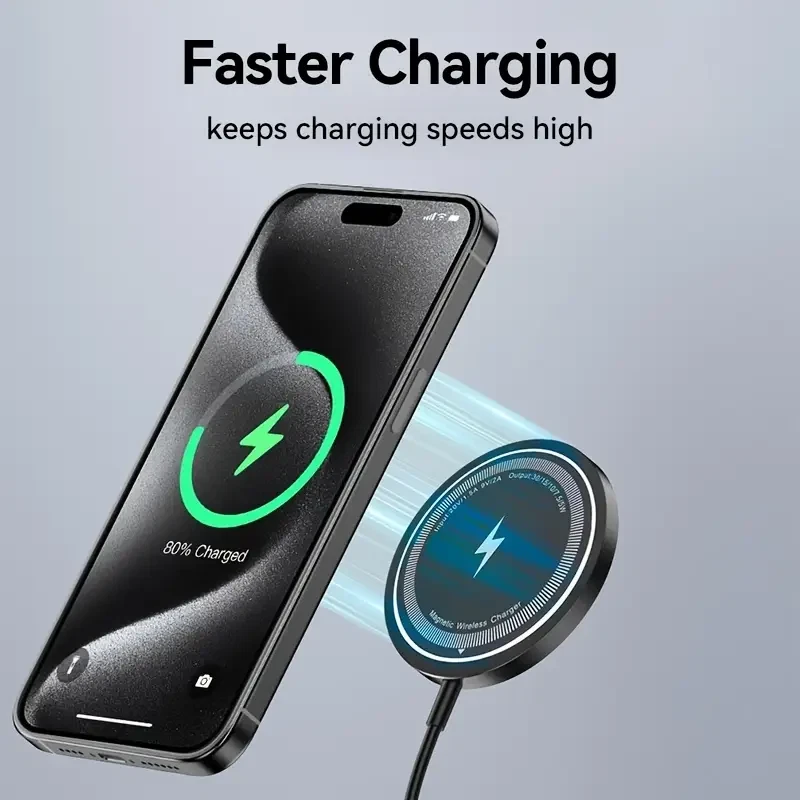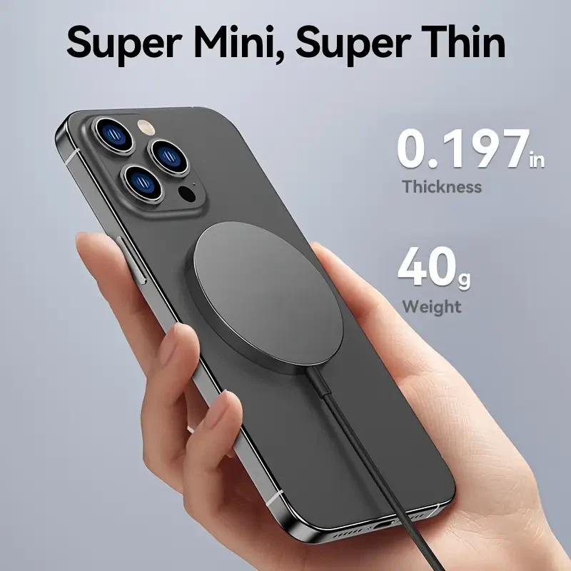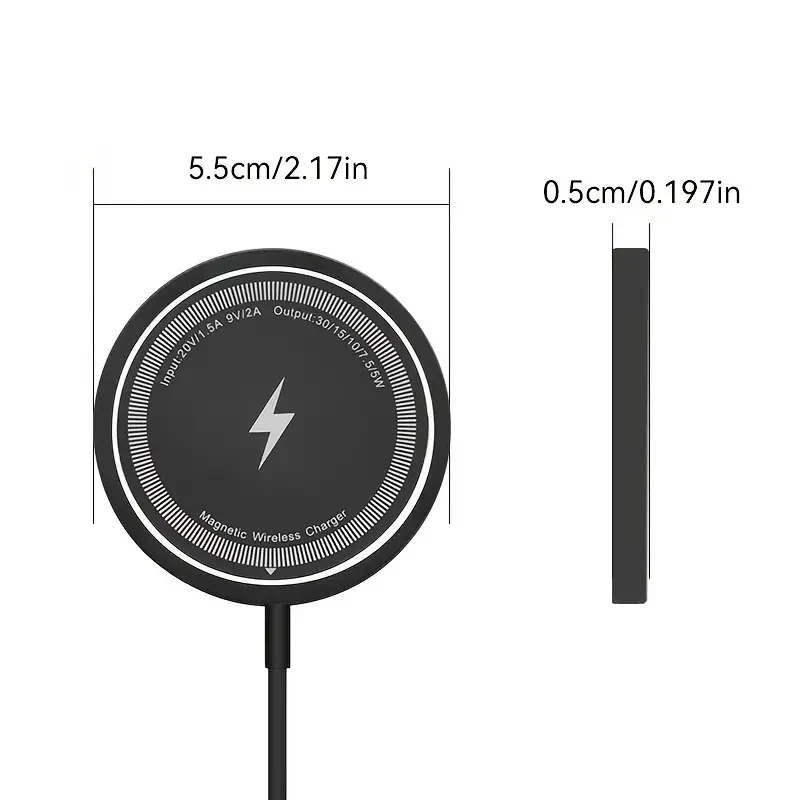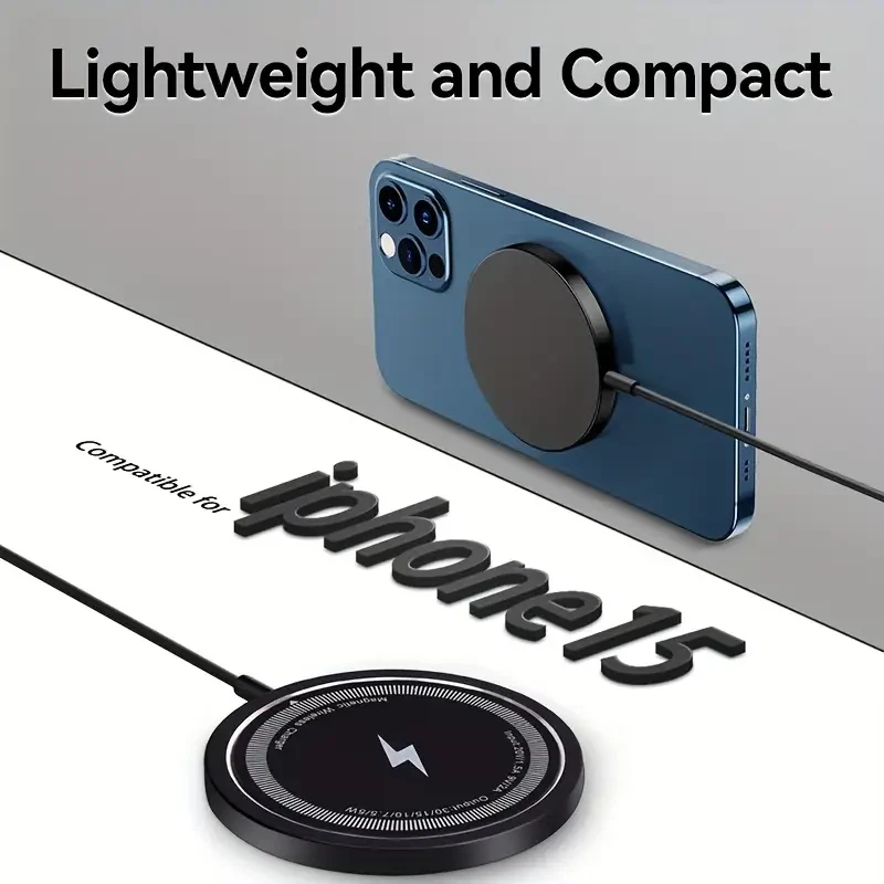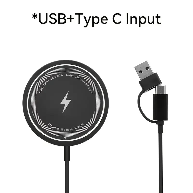 (Dual Ports Input) This magnetic charging pad has dual input ports, one Type-C port and one USB-A port. Compatible with the regular wall charger you own, so you don't have to worry too much. You can choose a suitable wall charger for use. NOTE: Please use QC3.0 or higher power adapters. [NO WALL CHARGER INCLUDED] (Intelligent Protection)As with MacSafe Charger, your iPhone magnetic wireless charger might get slightly warmer while your iPhone charges. To extend the lifespan of your battery, if the battery gets too warm, software might limit charging above 80 percent. (Metal & Portable Design) The high-quality metal material exhibits a unique luster, avoids scratches or fingerprints, not only keeps perfect appearance, but also is more durable. Only 0.23 inch thin, just like the smallest & lightest wireless magsafe charger with the 1m long cable. Free up more space, it can be put into backpacks, pockets or bags. Specifications Type: 15W Magnetic Wireless Charger Phone Output: 5W/7.5W/10W/15W Interface: TYPE-C/USB A Charging Distance: Less Than 6mm Charging Efficiency: 80 Percent Input voltage/current: 9V-2A/12V-2A In order to ensure fast charging, please use QC3.0 Power adapter for charging. Feedback: 1) Your Feedback is really important to us,please take a few seconds to leave great feedback if you are satisfied with our product or service, thank you so much! 2) We always offer the lowest price for best goods and service to you. 3) Please contact us before leaving neutral(3 stars) or negative(1-2 stars) feedback. We will try our best to solve the problem and leave you a happy shopping mood here. Thank you!