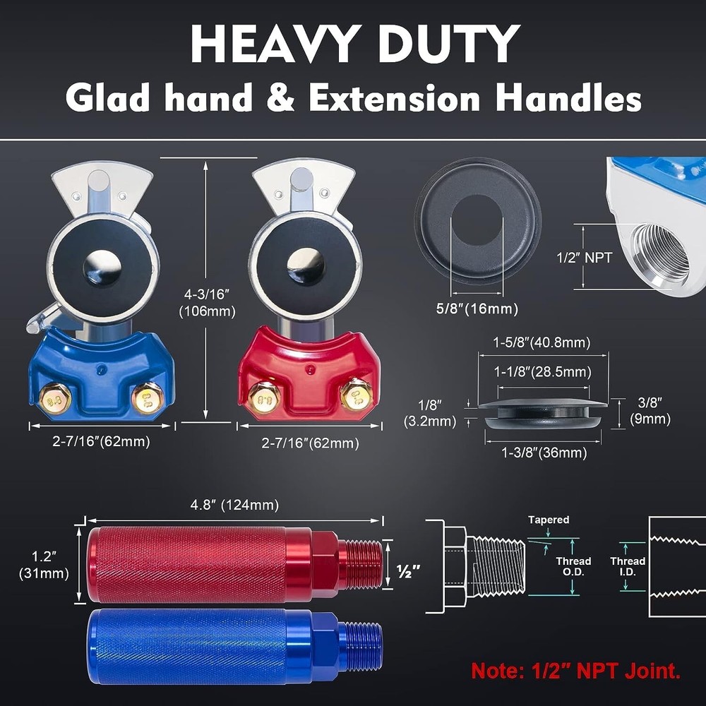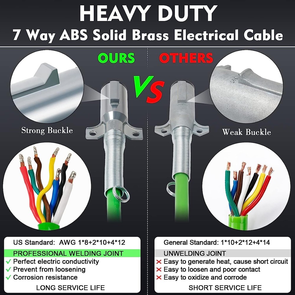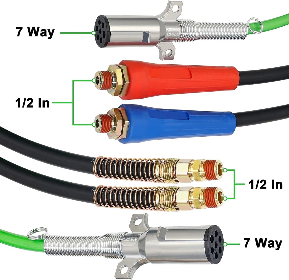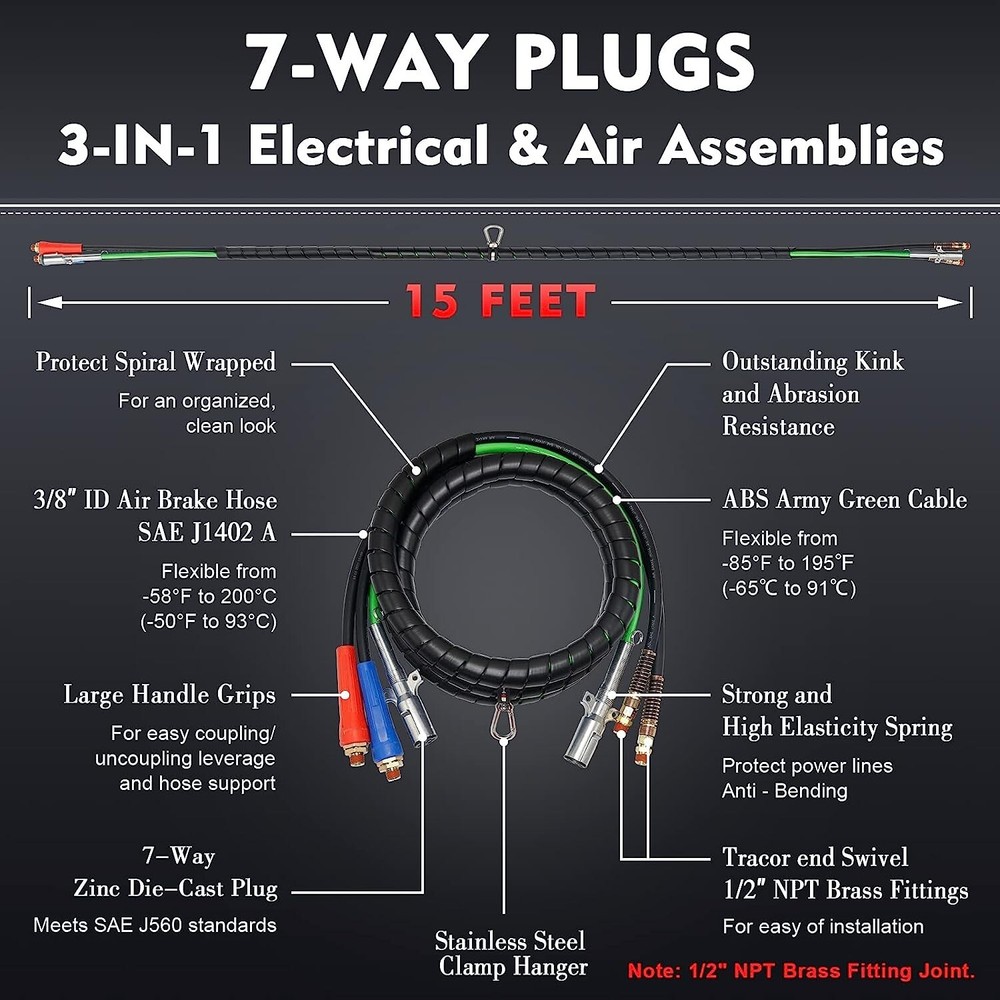 Shipping & Delivery Ships from the U.S.: All orders are shipped from our U.S. warehouse. Processing Time: Orders are processed and shipped within 3 business days (excluding weekends and holidays) after receiving your order. Delivery Time: Packages typically arrive within 3-4 business days, excluding remote areas. 【3-in-1 Kit Include】- 15 feet 3 in 1 Heavy duty ABS cable & air brake hose wrap cord assembly + 1 pairs of Aluminum Gladhands-Service & Emergency + 1 pair Extension Handles + 2 pcs rubber glad hand seals + 1 of stainless steel hanger bracket with clips + 1 of teflon tape(raw material belt). Cables are premium spiral wrapped for an organized and clean look. 【Perfect Air Line Kit with Grip】- Heavy duty aluminum knurled ANTI-SLIP gladhand grips provide strong Leverage for coupling/uncoupling glad hand. Large rubber color-coded glad hand handles for easy identification. The extension handle could support air hose. End plug of the semi truck trailer copper electrical cable is die-casted by high quality zinc alloy. Semi air hose have swivel brass fittings at tractor end for easy of installation( 1/2" NPT brass fitting joint ). 【Say Goodbye with Mess and Danger】- The 3-in-1 ABS air line kit has rubber molded weatherseal sleeves near the ends of each plug to protect you from accidental shock during installation or repair. Air lines for tractor trailer have outstanding kinking, abrasion resistance, durable and long-lasting. It resists abrasions from dirt, ice, or debris. All-in-One design prevents lines from snagging during turns, tangling, and being damaged by abrasion and impact. 【Replaces】- Tectran 169157, Tectran 169127, Tectran 13S15401, Tremec Sloan 451098, Philips 30-2171, Philips 30-2151, Philips 11-8115, OTR6818, Peterbilt PE13050, Peterbilt PE13000, Tremec Sloan 451097, OTR6814,etc. 【CERTIFICATION】- SAE J2394 specifications - AWG 4/12-2/10-1/8, low temperature (-65°C/-85°F) for ABS Cable (Army Green). DOT SAE J1402 A 10mm(3/8") for Air Brake Hoses (Black). SAE J560 standard for Plug. 3-in-1 ABS Pack meets DOT standard(semi trailer,truck, tractor accessories).