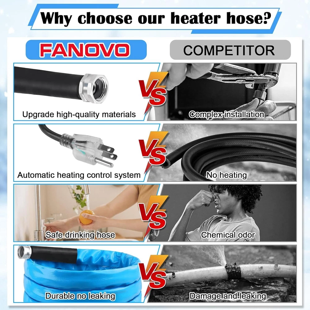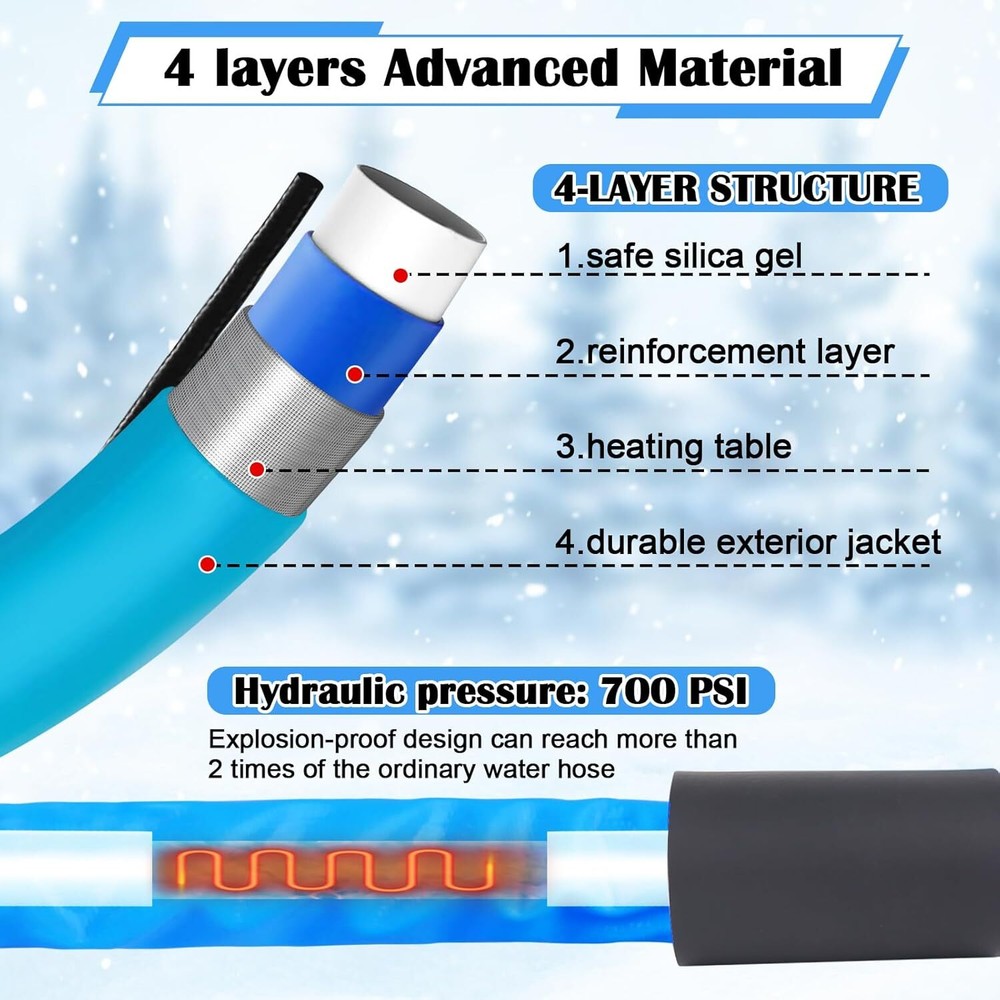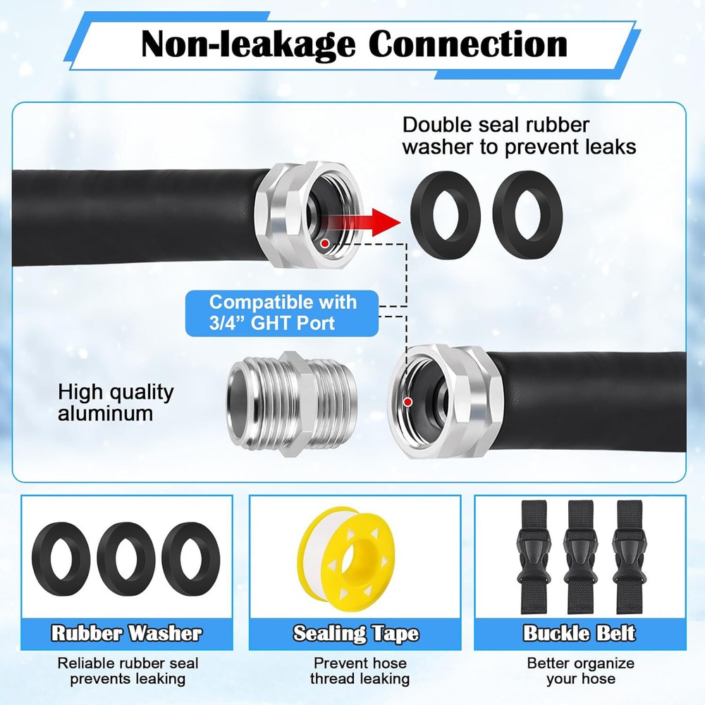Product Details Material Brass, Plastic Color Blue Total Length: 15 FT Inside Diameter: 5/8” (16 mm) Outside Dimater: 7/8” (22 mm) Operates on: 120 VAC Hydraulic pressure: 7O0 PSl Package: 15FT heated water hose x 1 Instructions x 1 3/4" adapter x 1 Waterproof tape x 1 Rubber ring x 3 (Prevent water leakage) Buckle straps x 3 (for easy storage) Anti-freeze insulation sleeve x 2 About this item ENERGY SAVING HEAT SYSTEM - Built-in smart self regulating thermostat, the Heated water hose ensure your RV water hose working under low temperature down to -45℉, the heated system is certificated by UL and ETL, double low temperature tested, safety guaranteed, enjoy your travel in winter without water water frozen LEAKAGE FREE - Premium 3/4 brass adapter fitting with nickel plating, rust-free and lead-free tested, with washers, teploon tapes and anti-freeze covers prevent the heated hose connectors from leaking BPA-FREE & DURABLE HEATED HOSE - The heated drinking water hose is made of food-class material, won't leave your water tasting like plastic or any harmful particles into water. Durable exterior jacket protects water hose and electrical components from damage or exposure EASY INSTALL - 3/4'' adapters to different size of connectors fits American RVs and garden hoses, compatibles with all US water supply. It’s a great ideal to apply this heated water hose to your RV, camping, garden, home Product Details Material Brass, Plastic Color Blue Total Length: 15 FT Inside Diameter: 5/8” (16 mm) Outside Dimater: 7/8” (22 mm) Operates on: 120 VAC Hydraulic pressure: 7O0 PSl Package: 15FT heated water hose x 1 Instructions x 1 3/4" adapter x 1 Waterproof tape x 1 Rubber ring x 3 (Prevent water leakage) Buckle straps x 3 (for easy storage) Anti-freeze insulation sleeve x 2 VEVOR is a leading brand that specializes in equipment and tools. Along with thousands of motivated employees, VEVOR is dedicated to providing our customers with tough equipment & tools at incredibly low prices. Today, VEVOR's products are sold in more than 200 countries and regions with 10 million plus members worldwide. Features & Details Stay Flowing in Low Temps: Even when winter nights drop to -45°F/-42.7℃, our heated RV water hose ensures steady water flow, preventing freezing and providing reliable water access. Available in 15, 25, 30, 50, and 100 ft lengths, it's perfect for RVs, trailers, boats, garden hoses, plant watering, and car washing in winter. Even Heating & Low Energy Consumption: The indicator light turns on when heating is in progress. The built-in heating element inside the water hose is 0.6" / 14 mm wide, wrapped in a textured outer layer that expands the heating surface for more even heat distribution. As the hose warms up, power consumption gradually decreases. Healthy Drinking Water: Besides preventing freezing, safety in water usage is essential. The inner RV winter water hose is made from drinking water-safe materials, free of lead and BPA, ensuring safe for washing fruits and vegetables and bathing. Leak-Proof Hose Connectors: Equipped with a 3/4" (1.9 cm) GHT aluminum connector, compatible with most US water sources. Fits garden and outdoor hoses, making it a versatile accessory. Includes waterproof rubber rings and thread seal tape for enhanced sealing. Smooth Water Flow: Designed with a kink-free structure to prevent slow or blocked water flow. The 5/8" I.D. supports high water flow. Suitable for water pressure below 4 MPa/600 PSI, with a durable corrugated PVC outer layer that resists road gravel and ice. SHIPPING Array PAYMENT RETURNS CONTACT WARRANTY