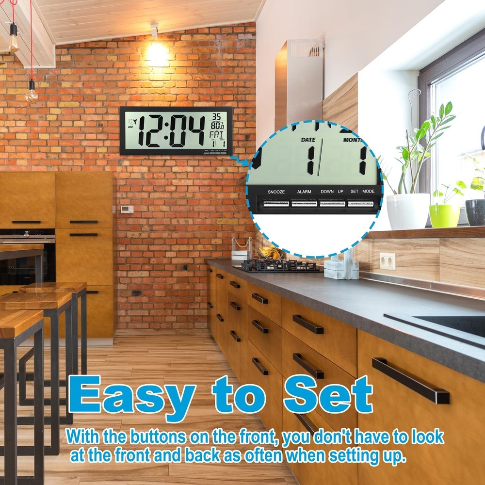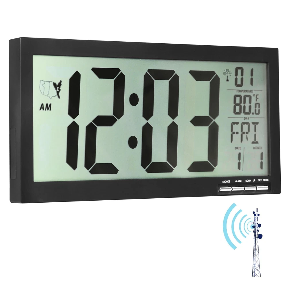 16" Atomic Clock Large Digital Wall Clock Battery Operated Large Display with Big Numbers,Temperature and Date - Easy to Read and Set,Auto DST Product Details Color: Black Brand: Crosstime MPN: Digital16Black UPC: Does not apply EAN: Does not apply Brand: Crosstime Color: Black Display Type: Digital Style: Modern Special Feature: Large Display, Temperature Display, Alarm, Daylight Saving, Radio Product Dimensions: 14.5"W x 6.3"H Power Source: Battery Powered Age Range (Description): Adult Room Type: Kitchen, Living Room, Bedroom, Classroom, Home Office Shape: Rectangular Brand: Crosstime Color: Black Display Type: Digital Style: Modern Special Feature: Large Display, Temperature Display, Alarm, Daylight Saving, Radio Product Dimensions: 14.5"W x 6.3"H Power Source: Battery Powered Age Range (Description): Adult Room Type: Kitchen, Living Room, Bedroom, Classroom, Home Office Shape: Rectangular Indoor/Outdoor Usage: Indoor Material: Acrylonitrile Butadiene Styrene (ABS) Theme: Atomic Clock, Radio Controlled Frame Material: Acrylonitrile Butadiene Styrene Are Batteries Included: No Mounting Type: Wall Mount & Tabletop Item Weight: 1.3 Pounds Alarm Clock: No Watch Movement: Digital Number of Items: 1 Operation Mode: Electrical Clock Form: Multi Display Manufacturer: Crosstime Item Weight: 1.3 pounds Country of Origin: China Item model number: Digital16Black Date First Available: August 30, 2024 High Precision Atomic Clock Atomic clock has a built-in receiver that automatically synchronizes itself with the WWVB 60kHz radio broadcast by the National Institute of Standards and Technology (NIST) in Fort Collins, Colorado. The Atomic Clock will always be accurate to within one second as it receives daily WWVB updates. Large Display / Easy to Read - Size:14.6" H x 6.3" L x 0.9" W,about 16" LCD, time numberal size: 4.1 X2". Easy viewing great for the elderly, people with poor eyesight. Easy to Use/Set After installing the battery it will automatically receive the radio signal WWVB (60k Hz), after receiving the signal then press the [UP] button to select 4 time zones and you are done. Note: In the process of receiving the radio, except for the [DOWN] key (forced to exit the reception) other buttons do not work temporarily, the reception process for a maximum of 7 minutes.(Powered by 3 x AAA batteries,Not included) Multifunctional 4 time zone to choose (PST, MST, CST, EST); auto daylight saving time (DST); temperature display,12/24 Hour time formats,clear second minute hour and week display,calendar display,dual alarm,snooze,wall mount / tabletop,folderable,etc. Great Gift Idea - It's suitable for living room,bedroom,kitchen,school,classroom,office,gym,library,hospital decor.You can gift it on various occasions such as Thanksgiving Day, Christmas, Halloween, birthdays,House warming etc.Also great gifts for mom,dad,family,elderly,friends.