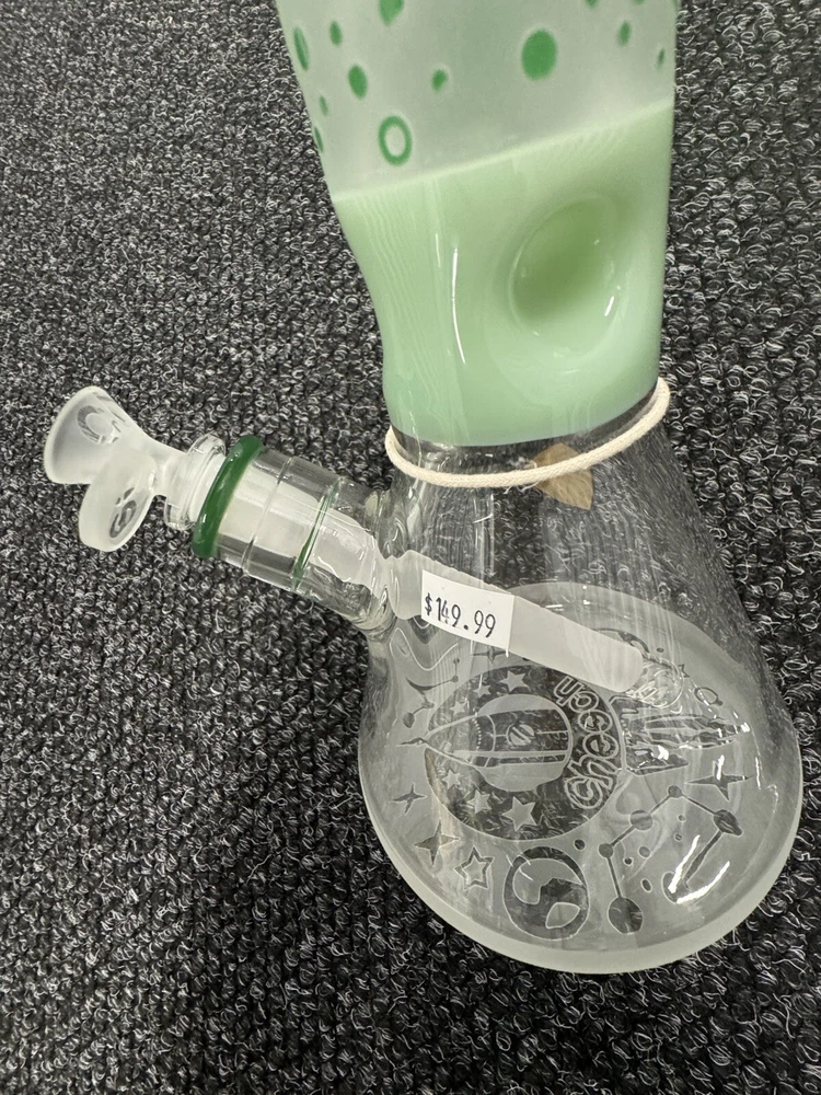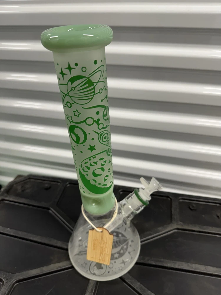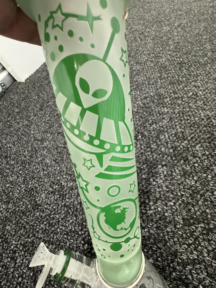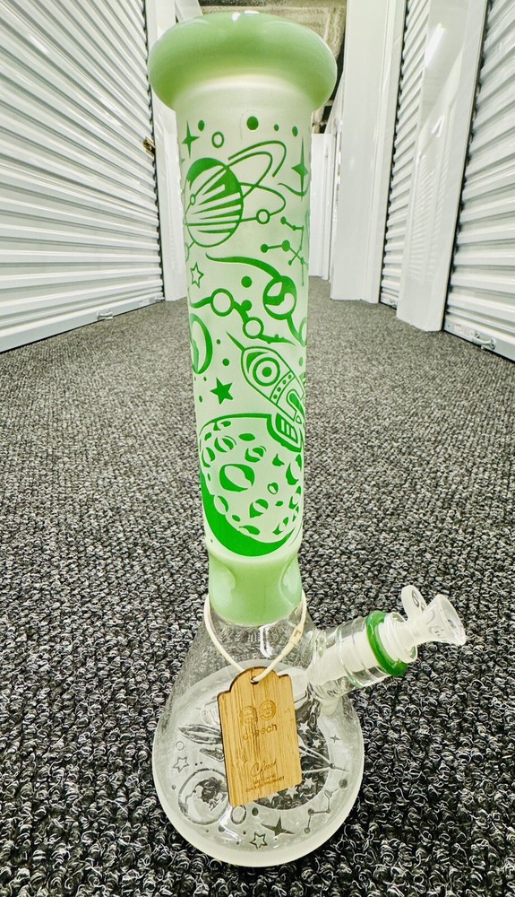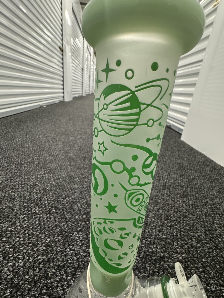 Features: High-quality glass construction Sandblasted design Space ship with planets and alien design Available in 3 colors: clear with red and black, blue, green Laser-etched Cheech logo on the bottom Cheech Glass bowl and down stem The sandblasted pattern on this water pipe creates a visually captivating texture, accentuating its space-themed design elements. Detailed depictions of a spaceship, planets, and an alien flying through the galaxy bring the design to life with remarkable intricacy. With three striking color options to choose from – clear with red and black accents, blue, or green – each variation offers its own distinct charm, allowing you to select the perfect style to suit your preferences. At the base of the water pipe, you’ll find a laser-etched Cheech logo, showcasing the meticulous craftsmanship and attention to detail. Complete with a Cheech Glass bowl and downstem, this water pipe ensures a seamless and enjoyable experience