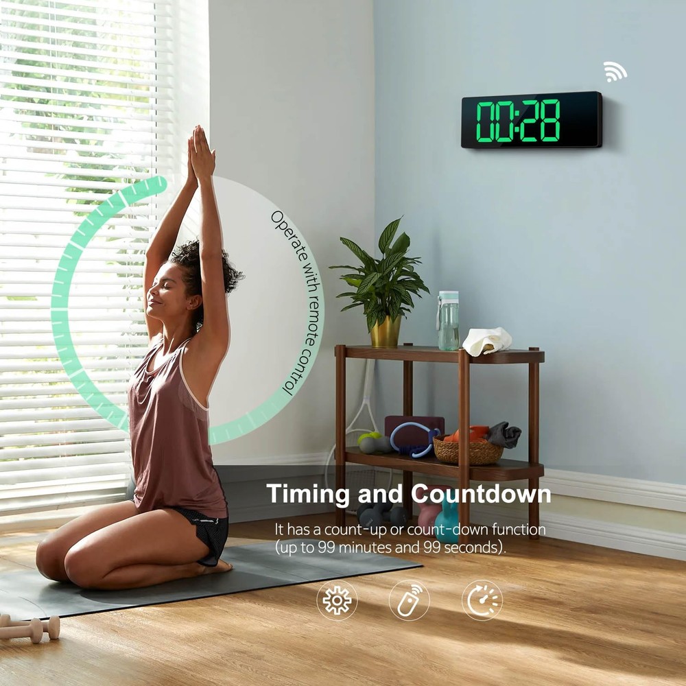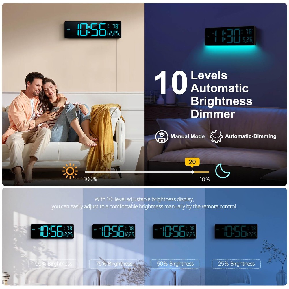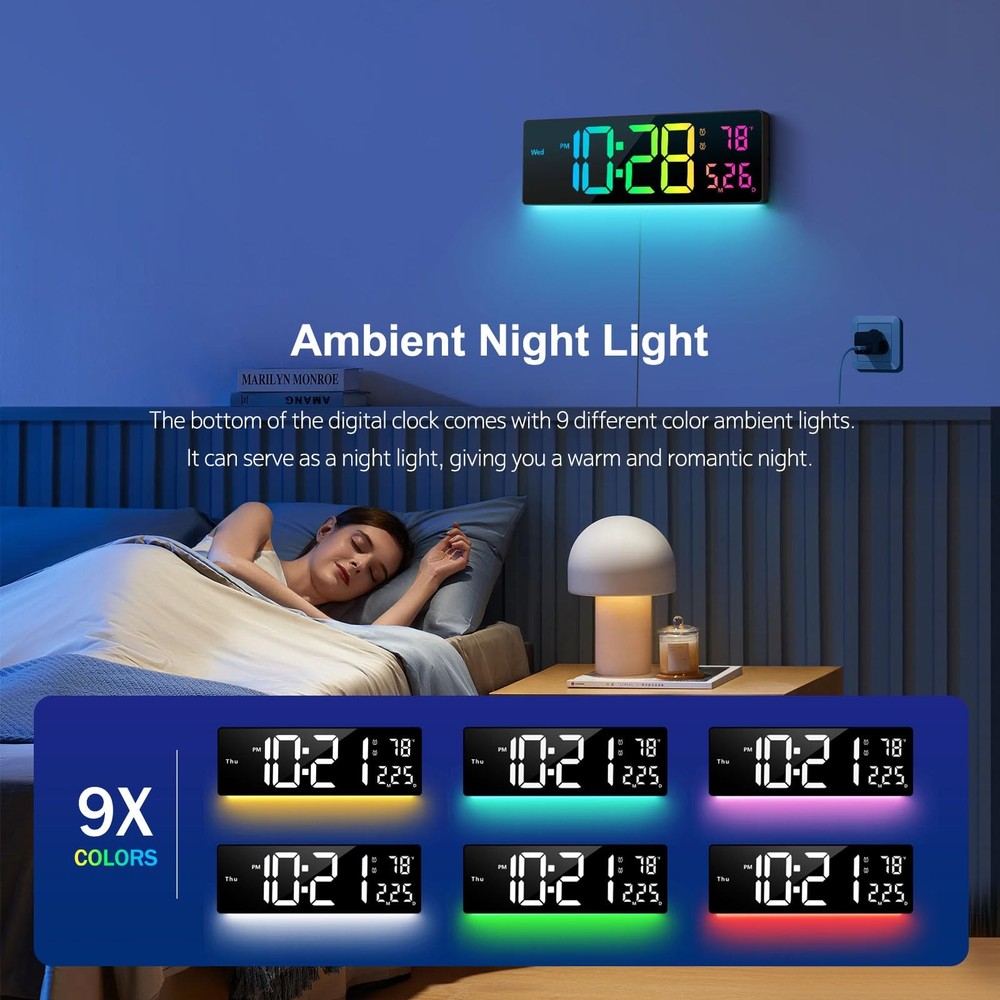 【Convert 11 Colors Freely】16" High definition LED large screen display, the digital wall clock can change 11 colors of jumbo digits with remote control. You can read the wall clock clearly, even in the distance or corner. ATTENTION: Must be plugged in to work. Not battery operated. 【Ambient Night Light】The bottom of the alarm clock comes with 9 different color ambient lights. It can serve as a night light, giving you a warm and romantic night. It is a simple and elegant artwork that decorates your room. 【10 Levels Automatic Brightness Dimmer】With 10-level adjustable brightness display, you can easily adjust to a comfortable brightness manually by the remote control. The LED clock has a built-in automatic dimming sensor, which can also automatically adjust the brightness as the light changes, smart to provide you with the needs. 【Memory Function】There is a built-in memory function, even if the power is disconnected, the time data will not be lost, no need to reset. And this large wall clock has a count-up or count-down function (up to 99 minutes and 99 seconds). 【Remote Control】All the settings and operations of the big wall clock do not need to be removed, but can be easily done with the remote control. Note: If you don't find the remote control and USB cable, be sure to open the other end of the box to check it. 【Beautiful and Functional】This wall clocks is suitable for living room, kitchen, garage, farmhouse, office, warehouse, classroom, gym, , nursery. And it is also the best gift for friends, partner and the elderly. Attention: It needs to be plugged in to work. The battery power only works for storing the clock setting in the case of main power outage.