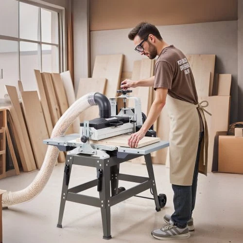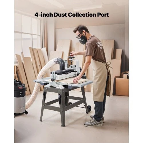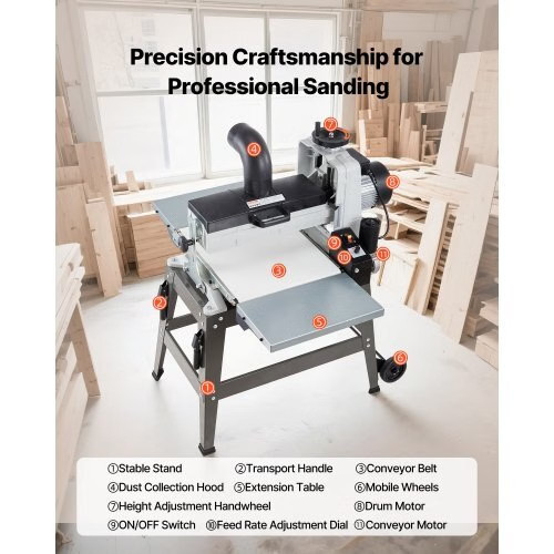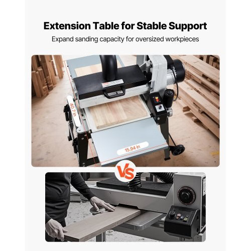 VEVOR 16" Drum Sander with Stand & Extension Tables, 1.5HP 1720RPMDual Motor Drum Sander for Woodworking - Variable Speed ConveyorBelt, 4" Dust Collection Port for Cabinet & Furniture Finishing Uniform Sanding, Less Rework Convenient & Easy to Use Easy Installation Wide Applications Aluminum Drum 4-inch Dust Collection Port Max Workpiece Width: 16-inch / 405 mm ,Conveyor Speed: 0 - 3.5m/min ,Drum Size: 16 inch ,Drum Material: Aluminum ,SuitableWorkpiece Thickness: 1/32" - 3" ,Overall Dimensions: 42.9" x 40.7"x 45.3" / 1090 x 1035 x 1150 mm,Voltage/Frequency: AC 110V, 60Hz,High Speed: 1720 RPM ,Item Model Number: MS3140,Motor Power: 1.5HP ,Frame Dimensions: 31.3" x 20" x 23.8" / 795 x 505 x 605 mm,DustPort Size: 4-inch / 100 mm,Net Weight: 87.7 kg / 193.4 lbs