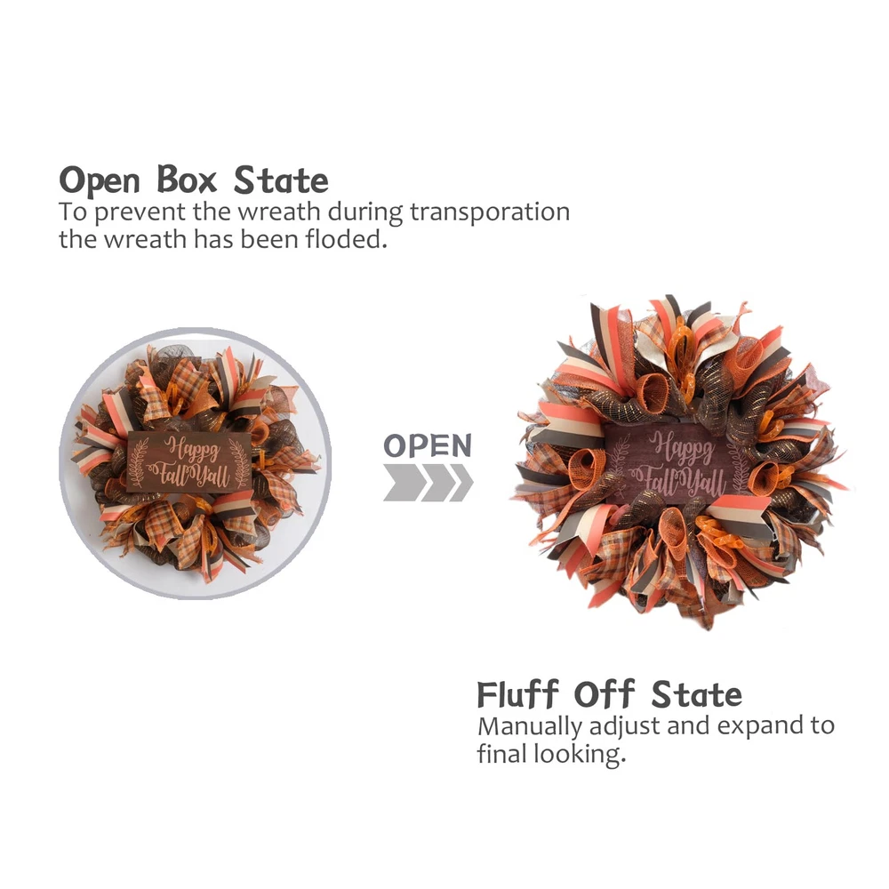 [Fall Mesh Door Wreath] If you like lovely mesh deco wreath and would like to give your front door a special wreath this fall, this full autumn mesh wreath with wood sign “Happy Fall” must be a good choice for you, and also this will be a valuable wreath for your to choice. [16 Inch Wood Sign Door Wreath] The outer diameter of this autumn wood sign wreath is about 16 inch, it can be well suitable for hanging on your front door, porch doors, inside and outside home decor, windows, wall, fireplace, yards and also can be hanged on your work place and good for decorating in this fall. [Thanksgiving Day & Harvest Wreath] This beautiful fall mesh ribbon wreath well the atmosphere of the fall, the harvest, thanksgiving day. If you are thinking about planning an fall home party or change your home decor theme or select a gift to your friends and family, this wreath will be really a good choice. [Autumn Wreath For Indoor And Outdoor] This orange color mesh wreath can be easily fitted into your whole home decor theme, and this orange plain ribbon and burlap ribbon has a strong style of rustic and farmhouse, this wreath will give your home a special fall sense. [Tips] 1.Fluff off the wreath and shape the ribbon bows to a get a perfect status wreath before hanging. 2.Please indoor use and covered outdoor use to keep the wreath long-lasting. [Fall Mesh Door Wreath] If you like lovely mesh deco wreath and would like to give your front door a special wreath this fall, this full autumn mesh wreath with wood sign “Happy Fall” must be a good choice for you, and also this will be a valuable wreath for your to choice. [16 Inch Wood Sign Door Wreath] The outer diameter of this autumn wood sign wreath is about 16 inch, it can be well suitable for hanging on your front door, porch doors, inside and outside home decor, windows, wall, fireplace, yards and also can be hanged on your work place and good for decorating in this fall. [Thanksgiving Day & Harvest Wreath] This beautiful fall mesh ribbon wreath well the atmosphere of the fall, the harvest, thanksgiving day. If you are thinking about planning an fall home party or change your home decor theme or select a gift to your friends and family, this wreath will be really a good choice. [Autumn Wreath For Indoor And Outdoor] This orange color mesh wreath can be easily fitted into your whole home decor theme, and this orange plain ribbon and burlap ribbon has a strong style of rustic and farmhouse, this wreath will give your home a special fall sense. [Tips] 1.Fluff off the wreath and shape the ribbon bows to a get a perfect status wreath before hanging. 2.Please indoor use and covered outdoor use to keep the wreath long-lasting.