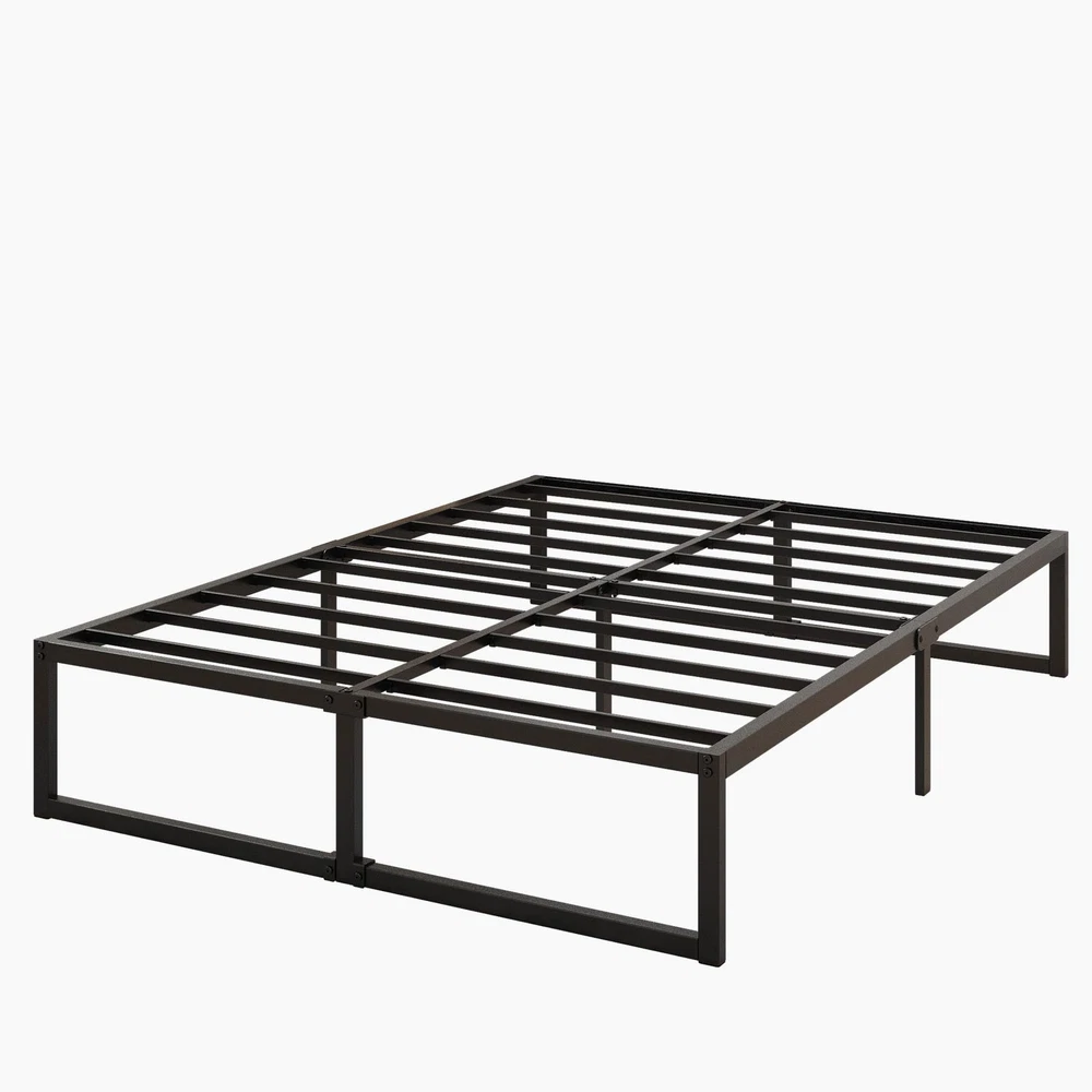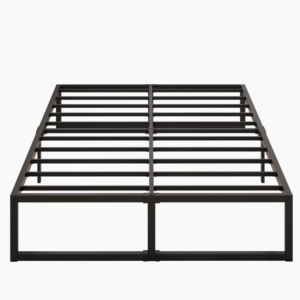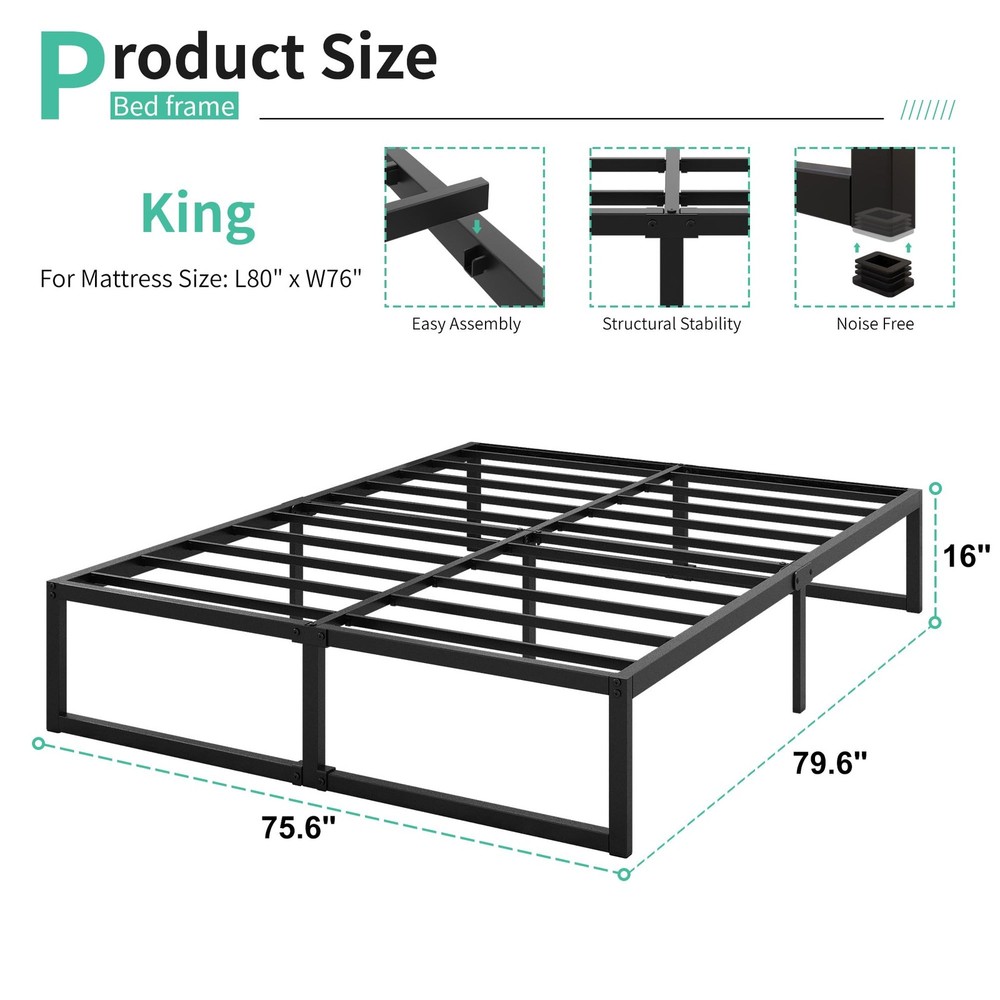 16 inch Metal Bed Frame Come with Steel Slats The bed frame is easy to assemble and all requiry parts, tool and hardare are included. These sturdy metal platform bed frame with heavy duty steel slats do not need any plywood or box spring and non-slip foot design will provide you a better sleep time on the bed. NO BOX SPRING NEEDED: Metal slats support foundation will extend the life of your spring mattess, lstex and memory foam without a box spring. Steel slats are spaced 7.44 inches apart to better catch the mattress. EASY ASSEMBLY: Bed frame parts, required hardware and clear installation instructions are all packed in the box, you can install this king metal bed frame in 20-30 minutes. MINIMALIST STYLE: This modern king bed frame with simple structure design, also come with classic will go well with your bedroom and bend with any furniture in your room. STURDY AND STABLE: We choose high quality metal materials and use the reinforced legs to prevent the whole bed frame structure twisting. Maximum weight recommendation: 1500 pounds NOISE FREE DESIGN: Square frame structure will make the whole bed frame more stable and reduce the noise from unstable and friction with mattress. The bed frame also come with anti-scratch foot cover to better protcet your floor from scratching.