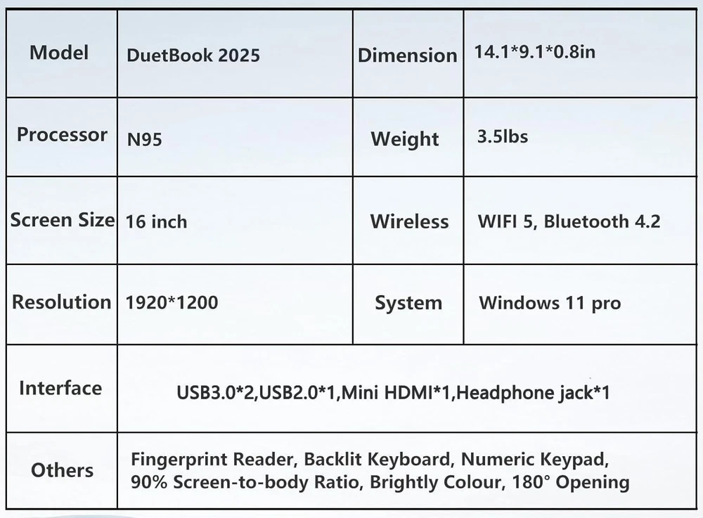 16 Inch Laptop Computer, Gaming Laptop, 8GB RAM 25 ‹ › ‹ › ‹ › ‹ › ‹ › ‹ › ‹ › ‹ › ‹ › ‹ › ‹ › 16 Inch Laptop Computer - Gaming Laptop Specifications: RAM: 8GB Storage: 256GB SSD Unmatched Performance Powered by the 12th generation Celeron N95 processor, boasting 4 cores and 4 threads, this laptop ensures seamless operations at speeds of up to 3.4 GHz. Whether for work or play, you can enjoy an unparalleled performance that meets your demands with ease. Upgraded Battery Responding to our customer feedback, we’ve enhanced the battery capacity from 5000mAh to 6000mAh. Enjoy an improved battery life of up to 6 hours, allowing you to stay connected and productive without interruption. Immersive Full HD Display Experience stunning visuals on the 16-inch FHD IPS display with a remarkable 1920x1200 resolution. The 0.2 inch micro bezel and an incredible 90% screen-to-body ratio guarantee an immersive and visually captivating viewing experience. Ultra-Portable Design Weighing only 3.5 pounds and with a sleek 0.8 inch thickness, this laptop is perfectly designed for life on the go. Enjoy unparalleled mobility without sacrificing screen size or performance, carrying your world effortlessly wherever you venture. Backlit Keyboard and Fingerprint Unlocking The ergonomic backlit keyboard with comfortable keystroke allows you to express your thoughts quickly and efficiently. With fingerprint unlocking, your device secures in moments, ensuring both quick access and enhanced security. Effortless Multitasking With 8GB RAM and a lightning-fast 256GB SSD, this laptop seamlessly manages multiple programs simultaneously, catering to all your data needs without compromise or lag. Enhanced Windows 11 Pro Experience Harness the latest in operating system technology with Windows 11 Pro. Experience enhanced speed, security, and efficiency, streamlining your tasks and empowering you to achieve more in less time. Peace of Mind Your satisfaction is our priority. Enjoy worry-free usage with a 1- and around-the-clock customer service. We are dedicated to providing continuous support, ensuring your experience with this gaming laptop is smooth and reliable. Why choose our 16 Inch Laptop? Elevate your computing experience with a laptop that combines power, performance, and portability. Perfect for gamers, professionals, or anyone on the go, this laptop meets all your demands with elegance and efficiency. Don’t miss the chance to enhance your digital life—order your 16 Inch Gaming Laptop today! Shipping Free & Fast Shipping - We offer free shipping to most of the USA with a normal delivery time of 3-10 business days. However, due to various situations, additional delivery time (up to 3 weeks) may be required for some items. Alternative Carriers - We may use alternative carriers (e.g. USPS, FedEx, UPS, etc.) to ensure your package arrives safely and on time. Due to the use of multiple carriers, we are unable to provide a tracking number automatically. Handling Time - Orders are processed and shipped within 1-5 business days of receiving cleared payment. Shipping Restrictions - Shipping to Alaska, Hawaii, Puerto Rico, Guam, and other US territories may incur shipping charges or delivery restrictions. Please contact us before ordering, or your order can be refunded/cancelled. State Restrictions - There may be restrictions based on your state of purchase. For example, certain items may not be shipped to California due to state regulations. Contact for Tracking Updates - If you require tracking updates or have any concerns about the delivery of your order, please feel free to contact us, and we will be happy to assist you. Return 30-Day Hassle-Free Returns - We want you to be completely satisfied with your purchase. If you are not, you can return the item within 30 days of receiving it for a full refund or exchange. Easy Return Process - To start a return, simply contact us and we will provide you with a prepaid return shipping label and detailed instructions. Restocking Fee - There are no restocking fees for returns. However, the buyer is responsible for return shipping costs if the return is not due to a seller's error. Refund Processing Time - Refunds will be processed within 5 business days of receiving the returned item in its condition. Payment We accept all major credit cards, PayPal, and Apple Pay for your convenience. Your payment information is secure and encrypted to ensure a safe and seamless transaction. Please complete your payment within 3 days of purchase to avoid any delays in shipping. Feedback Your feedback is extremely important to us. We strive to provide the best products and customer service possible. If you are satisfied with your purchase, please take a moment to leave us a positive review. If you have any concerns or issues with your order, please contact us before leaving negative feedback. We are committed to resolving any problems and ensuring your satisfaction. Contact Us If you have any questions or concerns, please feel free to out to our customer support team. You can contact us through the eBay messaging system. We are available Monday to Friday, 9:00 am to 5:00 pm EST, and we will do our best to respond to your inquiry within 24 hours. Buy it now and enjoy a pleasant shopping experience! Unit Quantity: 1 Item Weight: 3.5 lb Features: Backlit Keyboard,Fingerprint Unlock,180 Angle Opening Most Suitable For: Casual Computing,Gaming Connectivity: HDMI,USB 2.0,USB 3.0 Screen Size: 16 in Processor: Intel Celeron N Operating System: Windows 11 Pro SSD Capacity: 256 GB Type: Notebook/Laptop Hard Drive Capacity: 256 GB GPU: Intel UHD Graphics Storage Type: SSD (Solid State Drive) Color: Gray Maximum Resolution: 1920 x 1200 Processor Speed: 2.50-2.99 GHz Series: Duetbook RAM Size: 8 GB