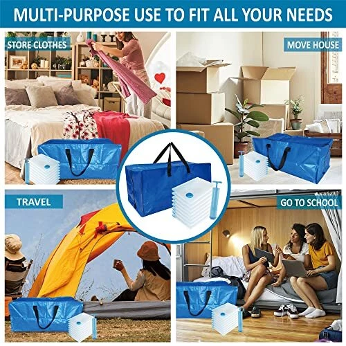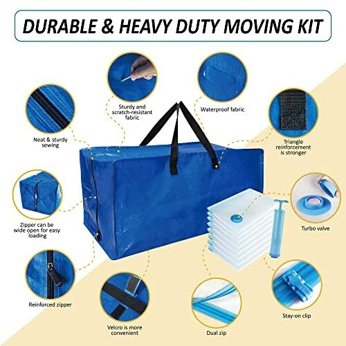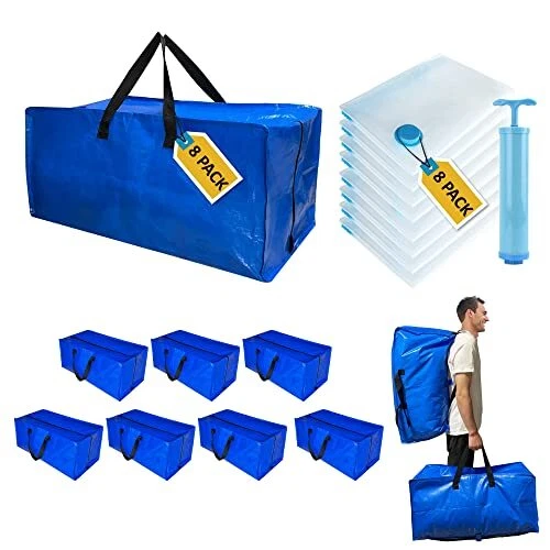 Return Policy Fast Delivery Trusted seller 16 Pack Heavy Duty Extra Large Moving Bags with Backpack Straps & Large Vacuum Storage Bags Moving Supply Combo, Moving Totes with Handles & Zippers for Space Saving, Fold Flat, Includes Vacuum Bags Product Description DURABLE & HEAVY DUTY MOVING BAGS COMBO: Includes 8 extra large storage totes (each can hold up to 65 lbs) and 8 large vacuum storage bags. Our extra large moving bags & vacuum bags combo is your must-have essential for moving, storage and organization. EXTRA LARGE SIZE & SPACE SAVING: Each moving bag is 29.1" W X 13" H X 14.2" D - 94 liters (25 gallons) volume. Use the large vacuum storage bags in the pack to create up to 80% more space. Plenty of space to store and protect just any of your items. STURDY & EASY TO CARRY: 3-layer reinforced stitches and dual zipper design enhance the load-bearing of our packing bags. With long carry handles & strong backpack straps, you can carry the bag like a tote or backpack with freeing hands. FOLDABLE & REUSABLE: Our large storage bags can be folded flat and into small size for easy storage in a drawer, closet, car or luggage. Mobile, lightweight and great economical alternative to moving boxes. Can be used multiple times. MULTI-USE: These heavy duty bags can store clothes, shoes, towels, pillows, comforters, blankets, toys, holiday decor and more! Perfect for moving in and out of college dorms, travel, hiking, camping and more. Shipping Returns Payment Shipping Shipping is FREE to all addresses other than APO/PO boxes in the lower 48 states. All our stock ships from US-based warehouses. Shipped via USPS or UPS (depending on location and package weight) Unless stated otherwise, all orders will ship within 24-72 hours of your payment being processed. Check our feedback to see the great reviews of FAST shipping we offer. Returns Seller does not accept returns Payment We currently accept payment via eBay managed payments only. Once payment is cleared, we will dispatch your shipment within 1-3 business days. Please refer to the "Shipping" tab for more information regarding shipping speed to your destination.
