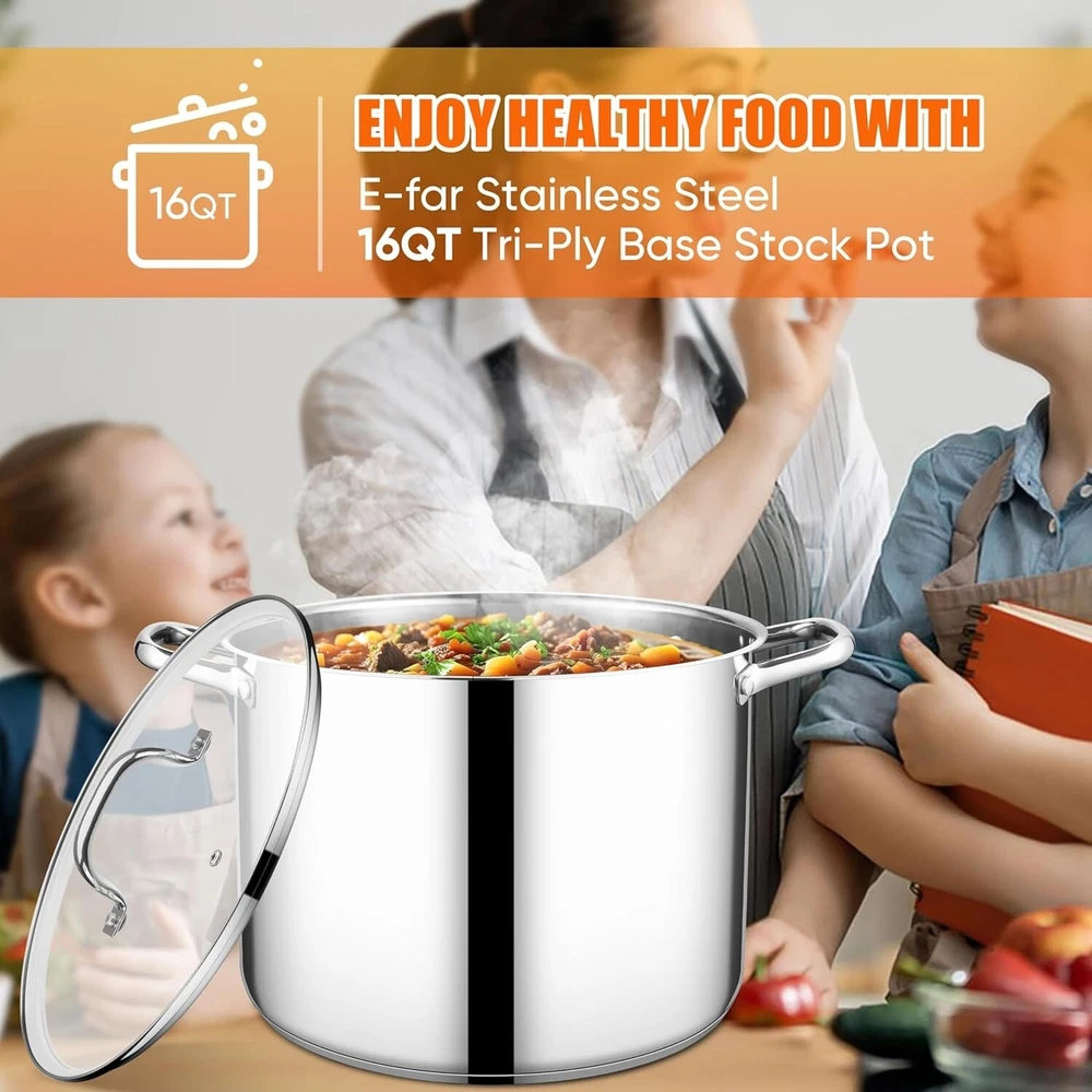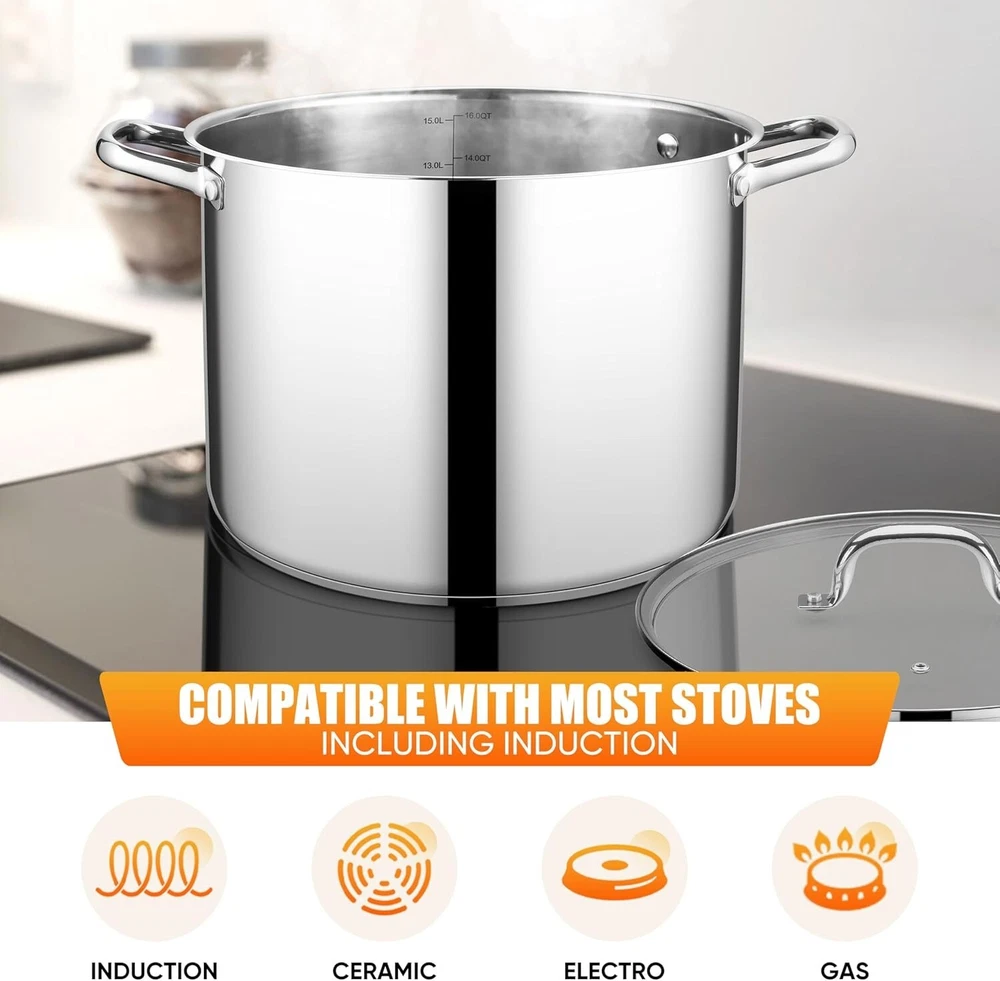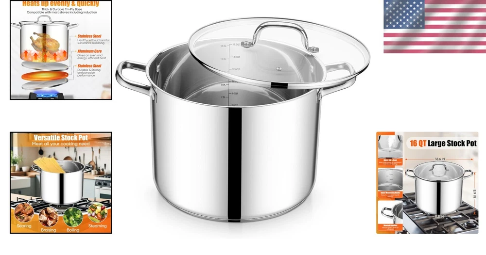 16 Quart Heavy Duty Stainless Steel Stock Pot with Glass Lid - Perfect for Soups ‹ › ‹ › ‹ › ‹ › ‹ › ‹ › ‹ › ‹ › ‹ › 16 Quart Heavy Duty Stainless Steel Stock Pot with Glass Lid Perfect for Soups, Stews, and More! Features: Made of food-grade stainless steel; no coating for healthy cooking. Flat tri-ply bottom and thick-walled construction for durability and shape retention. Even and fast heat distribution with aluminum core between stainless steel layers. Compatible with most stovetops, including induction. Tempered glass lid for easy monitoring without losing heat or moisture. Large hollow riveted handles for comfortable grip; minimize heat transfer. Oven and dishwasher safe for ultimate convenience. 16-quart capacity with measurement scale for precision cooking. Benefits: Durable stainless steel construction ensures long-lasting performance. Cook healthier meals with even heat distribution and no hot spots. Effortless cleaning; retains its shine wash after wash. Perfect size for large gatherings, special events, or meal prep. Measuring lines for easy portioning and managing leftovers. Why choose our Stainless Steel Stock Pot? Elevate your cooking experience with our 16 Quart Heavy Duty Stainless Steel Stock Pot, designed for the serious chef. Crafted from durable, food-grade stainless steel, this pot not only withstands high-heat cooking but also ensures your meals are healthy and flavorful. With its innovative tri-ply construction for superior heat retention, you can create everything from hearty soups to rich bone broth with confidence. The transparent tempered glass lid allows you to monitor your culinary creations without losing precious heat, while the easy-to-clean design and wide rims make it a breeze to serve your delicious meals. Perfect for family gatherings, holiday feasts, or everyday use—including oven and dishwasher safe for a hassle-free experience. Choose quality and performance; choose our stainless steel stock pot and enjoy endless culinary possibilities! Shipping Free & Fast Shipping - We offer free shipping to most of the USA with a normal delivery time of 3-7 days. However, due to the current situation, additional delivery time (up to 3 weeks) may be required for some items. Alternative Carriers - We may use alternative carriers (e.g. USPS, FedEx, UPS, etc.) to ensure your package arrives safely and on time. Due to the use of multiple carriers, we are unable to provide a tracking number automatically. Handling Time - Orders are processed and shipped within 1-2 business days of receiving cleared payment. Shipping Restrictions - Shipping to Alaska, Hawaii, Puerto Rico, Guam, and other US territories may incur shipping charges or delivery restrictions. Please contact us before ordering, or your order can be refunded/cancelled. State Restrictions - There may be restrictions based on your state of purchase. For example, certain items may not be shipped to California due to state regulations. Contact for Tracking Updates - If you require tracking updates or have any concerns about the delivery of your order, please feel free to contact us, and we will be happy to assist you. Return 30-Day Hassle-Free Returns - We want you to be completely satisfied with your purchase. If you are not, you can return the item within 30 days of receiving it for a full refund or exchange. Easy Return Process - To start a return, simply contact us and we will provide you with a prepaid return shipping label and detailed instructions. Restocking Fee - There are no restocking fees for returns. However, the buyer is responsible for return shipping costs if the return is not due to a seller's error. Refund Processing Time - Refunds will be processed within 5 business days of receiving the returned item in its original condition. Payment We accept all major credit cards, PayPal, and Apple Pay for your convenience. Your payment information is secure and encrypted to ensure a safe and seamless transaction. Please complete your payment within 3 days of purchase to avoid any delays in shipping. Feedback Your feedback is extremely important to us. We strive to provide the best products and customer service possible. If you are satisfied with your purchase, please take a moment to leave us a positive review. If you have any concerns or issues with your order, please contact us before leaving negative feedback. We are committed to resolving any problems and ensuring your satisfaction. Contact Us If you have any questions or concerns, please feel free to reach out to our customer support team. You can contact us through the eBay messaging system. We are available Monday to Friday, 9:00 am to 5:00 pm EST, and we will do our best to respond to your inquiry within 24 hours. Buy it now and enjoy a pleasant shopping experience! UPC: Not Set Unit Quantity: 16 qt Stove Type Compatibility: Electric,Gas,Induction Material: Stainless Steel Set Includes: Tempered Glass Lid Features: Dishwasher Safe,Easy Clean,Oven-Safe,Scratch-Resistant,With Lid Type of Oven: Electric,Gas,Induction,Microwave Oven,Oven Brand: Unbranded Surface Coating: Stainless Steel Capacity: 16 qt Type: Stockpot Color: Silver Item Width: Not Set Item Length: Not Set Item Diameter: 11.8 in MPN: Not Set Country/Region of Manufacture: Not Set Shape: Round Manufacturer Warranty: Not Set Item Height: Not Set Item Depth: 11 in Model: Not Set Number of Items in Set: One-Piece Item Weight: 6 lb Heat Resistance: 450°F Unit Type: lb