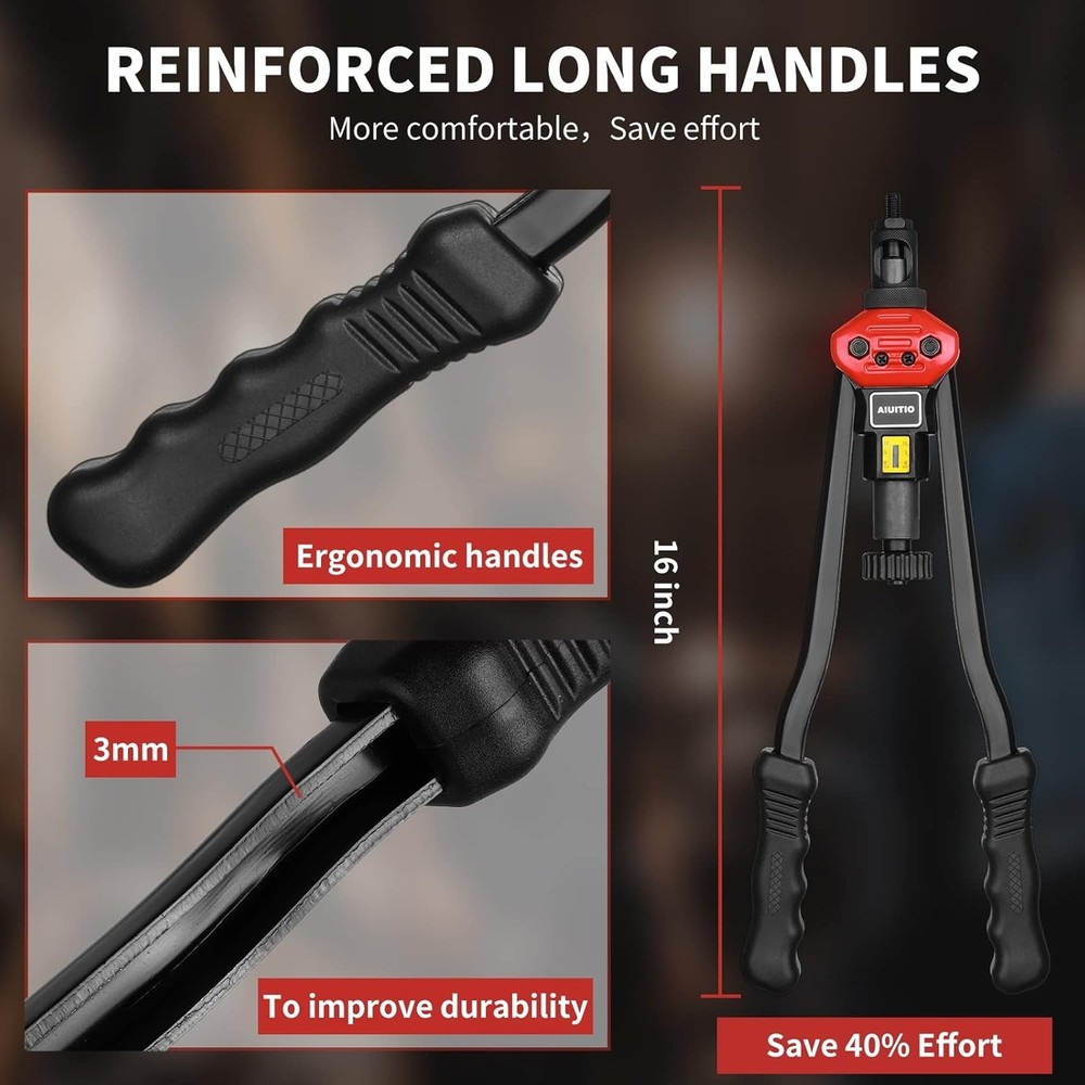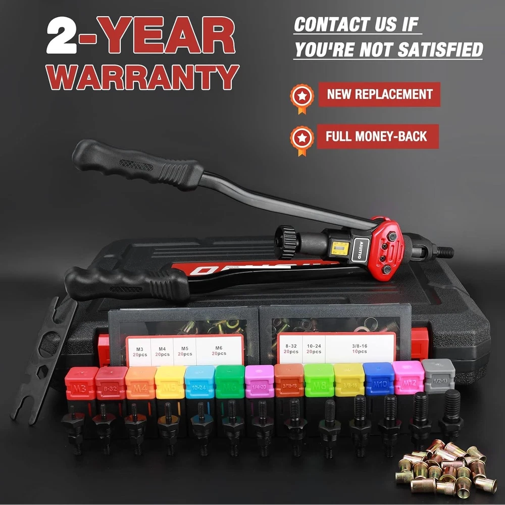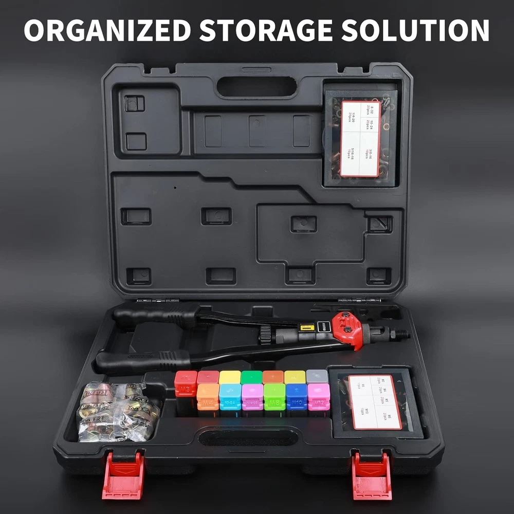 Fast Friday Store ✿✿✿✿✿ 16" Rivet Nut Tool, Rivnut Tool Hand Riveter, 13 Metric & SAE Mandrels w/ Case ☛ Size: 16 inch rivet nut tool ☛ EASY TO USE- New "Toolless Quick-Change Head" design allows for easy changing of mandrels and nose pieces by hand ☛ STRONG AND DURABLE - The 16" rivet nut tool is made from thick carbon steel with heat treated, and black phosphating finishing protects against corrosion. U cross-section of arm is of high reliability to prevent getting bent. With designed structure and tough materiels it is sturdy and durable enough for long life performance. ☛ VARIOUS USE-CASE SCENARIOS - It provides professional solution for all kinds of riveting cases such as metal plate, plastic piece, riveting workpiece, bicycle attachments, car attachments, decorations etc. ☛ COMPLETE ACCESSORIES & SOLID CARRYING CASE - Equipped with 13pc interchangeable mandrels(Metric M3 M4 M5 M6 M8 M10 M12; SAE 8-32,10-24,1/4-20,5/16-18,3/8-16,1/2-13) and 200pc rivet nuts (20 rivet nuts each for M3,M4,M5,M6;8-32,10-24, 1/4-20, 10 rivet nuts each for M8,M10,M12; 5/16-18, 3/8-16,1/2-13.)Please note that the M8 mandrel was installed in the gun, so the small box of M8 is empty.All pieces are packed in a rugged, compact carrying case for storage and portability. ➤ ➤ WARM TIPS: ◾ ◽ The tool is capable of oversetting small rivnuts like M3,M4 and 10-24 etc. When setting small rivnut, please apply less power on the handles and the arms of the tool do not need to come very close to each other, or the small mandrel can be damaged. ◾ ◽ The mandrels are consumable. Frequent or improper use would consume the useful life of them, and even damage them. ◾ ◽ Please be noted that the M8 mandrel is already installed on the tool, so the small box of M8 is empty. ➤ ➤ What's in the box ◾ ✓ 1 x 16”Hand Rivet Nut Tool ◾ ✓ 7 x Metric and 6 x SAE Mandrels ◾ ✓ 200 x Rivet Nuts ◾ ✓ 1 x Versatile Spanner ;1 x Detailed User Manual ◾ ✓ 1 x Rugged Tool Case