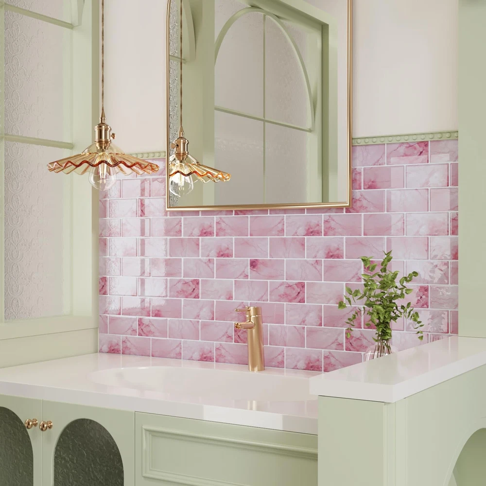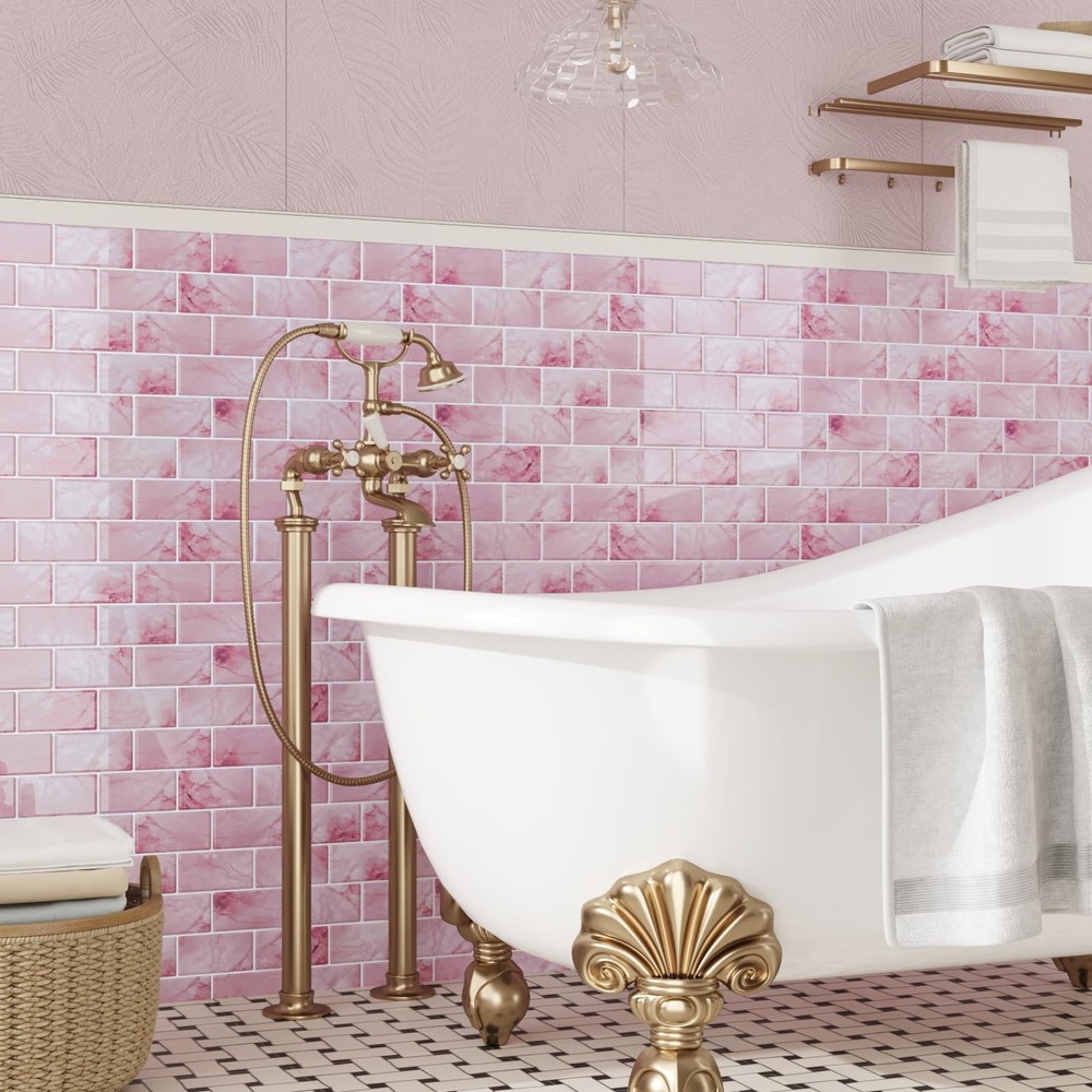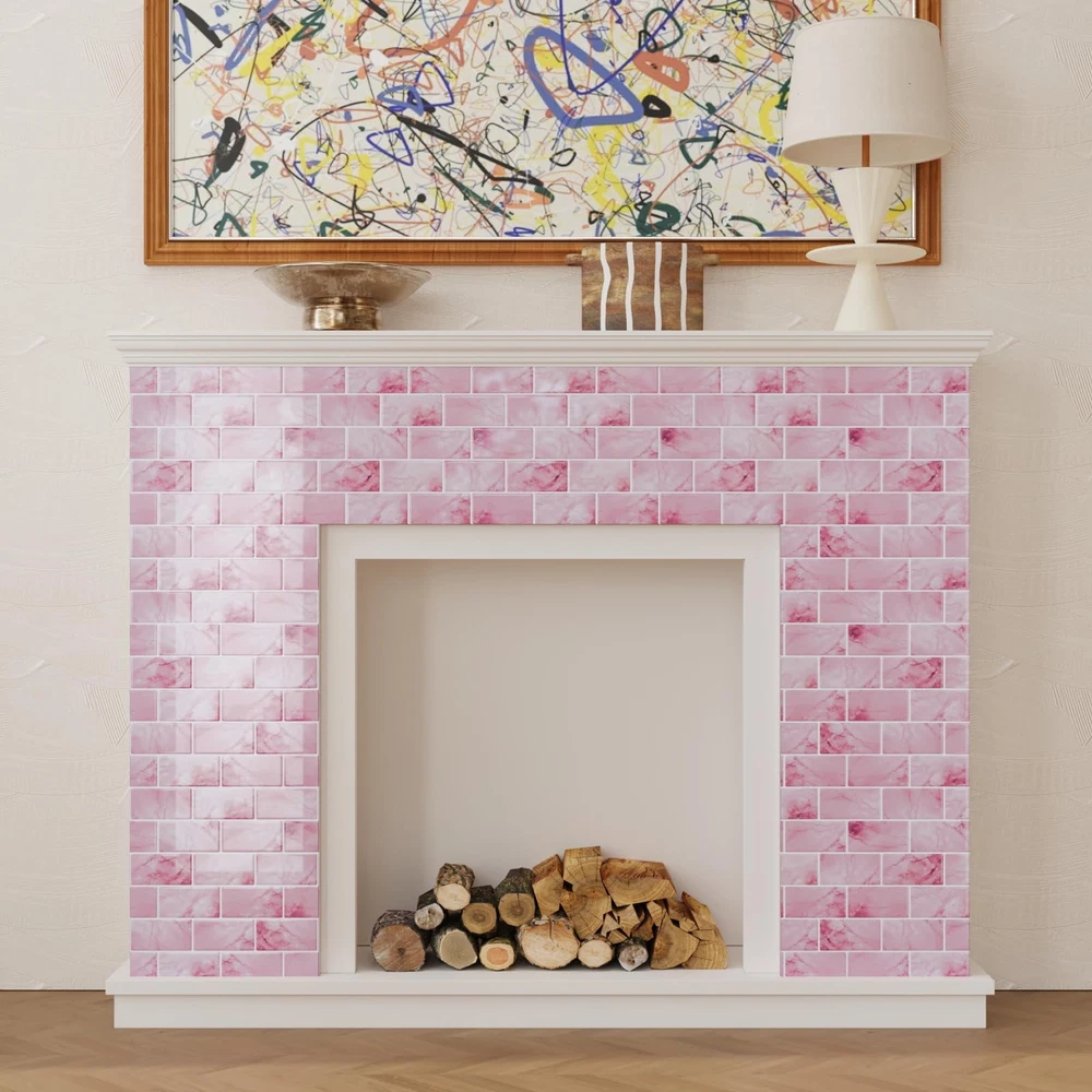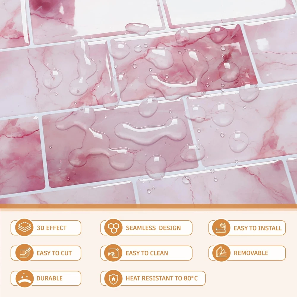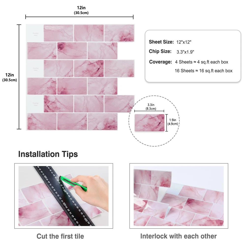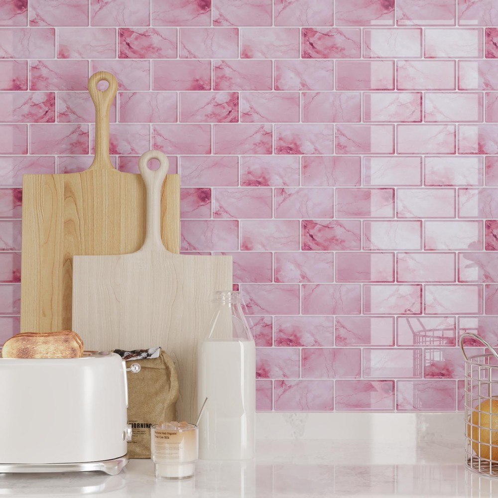 pink peel and stick backsplash for kitchen subway tile pink marble peel and stick tile for bathroom back splash stick on tile stickers waterproof 3D Subway Tile: Kitchen backsplash peel and stick, pink marble tile stickers, with white grout lines, glossy finish. Sheet size is 12"x12"x0.05", chip size is 3.3"x1.9", each box of 16 sheets covers 16 square feet Features: Peel and stick subway tile backsplash, made of durable PU glue and PET backing paper, no yellowing, color loss or cracking with long-term use, waterproof, oil-proof, easy to clean, impact-resistant, heat-resistant (from -30°C to 80°C) Easy to Install: Kitchen backsplash tiles peel and stick, self adhesive, no grout, no glue, no mess, easy to cut, lightweight, flexible, bends to corners, easy to apply, removable backsplash for renters, no residue left behind Wide Application: Peel and stick backsplash for kitchen, peel and stick tile for bathroom, back splash stick on tiles for kitchen backsplash, behind the sink, behind the stove, bathroom vanity backsplash, shower walls, laundry room, dining room, girls room, living room, fireplace, RV, wall tiles Warm Tips: *Please ensure that the tile is applied on a smooth, flat, dry and clean surface, it is not recommended to use it on uneven, textured, rough or dusty surfaces. *Due to the difference in device screens, the actual color may vary slightly from the picture, we recommend that you order 4 sample tiles to check and make further decision. *It is recommended to order 10% more tiles to account for cutting loss during installation