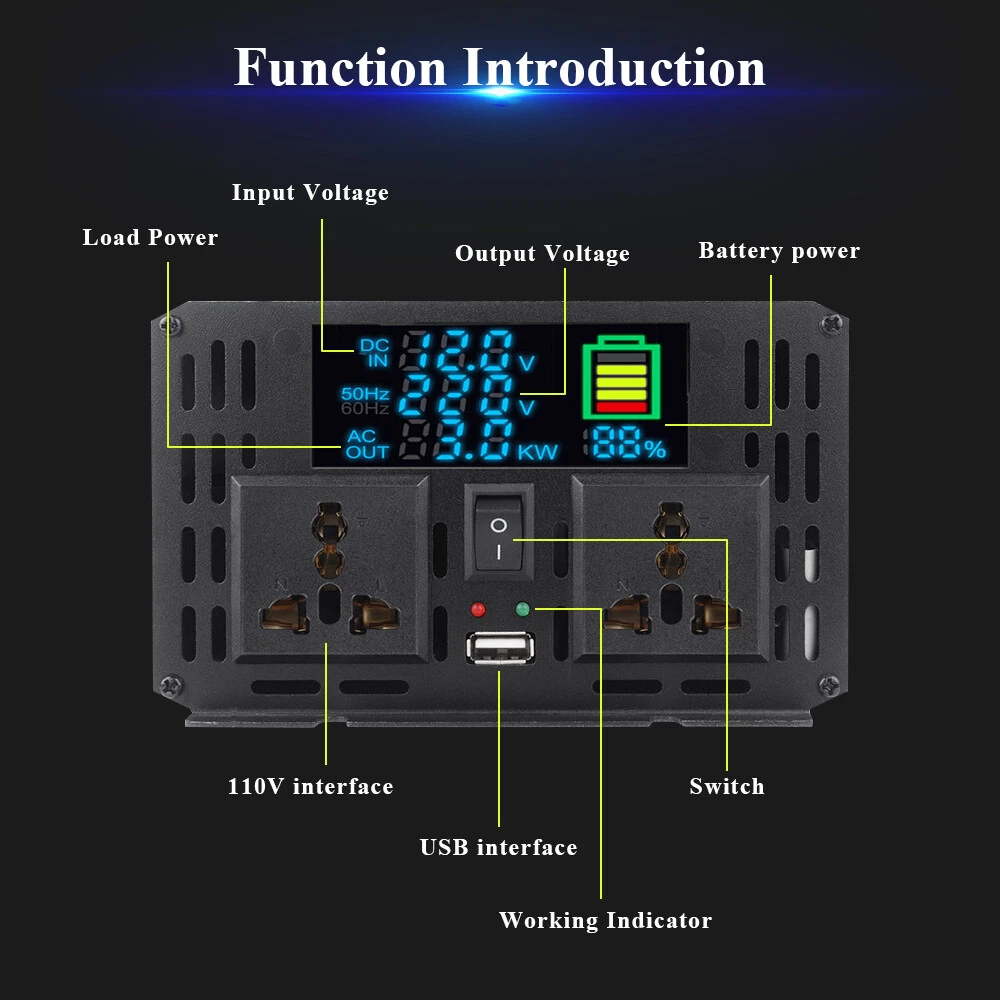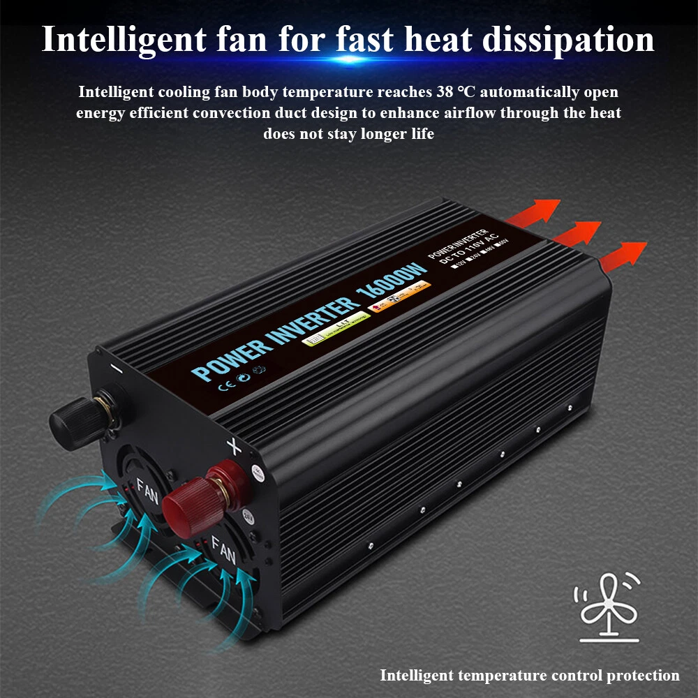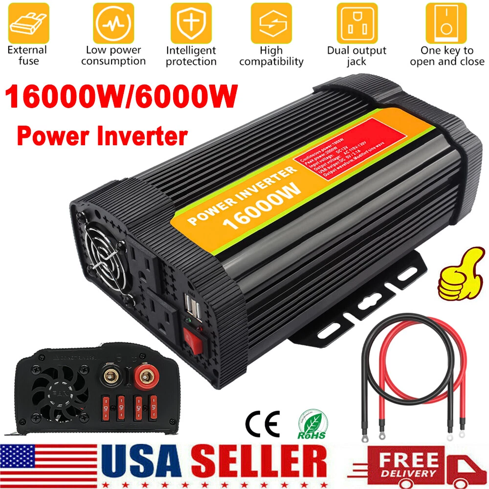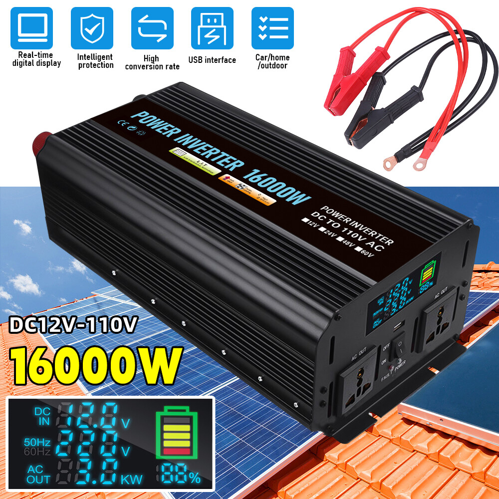 Logistics Tips: Dear customers, We are always working hard to ensure that orders are delivered on time. But inevitably there will be a very small number of orders may be delayed due to the worsening of the epidemic. If you have other problems or experience delays after purchase , please send us an email or leave a message on eBay, we will reply as soon as possible. Thank you for your support! A-1 6000W Power Inverter Note: Please pay attention to distinguish between peak and continuous output power. For example, the continuous power of 12000W peak is 6000W. Please refer to the description for details. Features: -The inverter can convert DC12V to AC 110V. -Overload, over temperature, short circuit, low voltage, overvoltage protection. -Stable and precise output voltage. -Built-in cooling fan with low noise. -This power inverter has Reverse input protection, High input voltage shutdown, Low input. -Voltage shutdown, Over temperature protection, Short circuit protection, Overload protection. -Perfect for TV, DVD player and other home appliances. -A must-have for your road trips, vacations, outdoors, emergency kit and more. Specifications: Color: Black Continuous Output: 8000W Peak power: 16000W Input voltage: DC12V Output voltage: AC 110V Wave Form: Modified Sine Wave Frequency: 50 ± 3Hz Clip length: 60 cm / 1.96 ft Car Charging Cable length: 50 cm / 1.64ft Note: Please allow slight deviation due to manual measurement. Package Include: 1 x 16000W Peak Car Inverter 4 x Fuse 1 x Guide line B-6000W Power Inverter Selling Points: 1. Increase the display screen for intelligent human-machine information exchange. Basically, you can intuitively understand the working status of the inverter and various working parameters in the display screen. For example: input voltage, output voltage, output frequency, battery power, load capacity Wait 2. Fault prompt function. In addition to different sound prompts, it can also be displayed more intuitively on the display screen. For example, battery undervoltage, battery overvoltage, heavy load, high operating temperature, output short circuit, etc. 3. The product has increased the overload delay shutdown function. It solves the sensitive problem of inverter protection when the soluble electrical appliance is started. For example: users can't afford a 50W LED light with a 300W traditional inverter or use a 500W inverter The converter can't carry a laptop and other problems. 4. The low-power non-professional user market has added the positive and negative return protection function. It solves the problem of return caused by the user's artificial connection of the wrong wire and burned out the inverter, and solves your after-sales worries. 5. Intelligent temperature-controlled oil-sealing fan. When the inverter is working, it will only work at a certain temperature, which is more energy-saving and quieter. 6, Digital MCU control, precise, accurate, fast, and intelligent; fine refers to the output waveform, and the frequency is more accurate. Quasi refers to the accurate output voltage; fast refers to the quick response of the protection circuit. specifications: Tang three generations 12V-110V black shell Output voltage waveform: correction wave Actual power: 500W (can be virtual standard (6000W)) Peak power: 1000W Input voltage: 12V Input voltage range: 9.5V-15.5V Output voltage: 110V/220V Output voltage range: 110V±10%/220V±10% Frequency: 50Hz/60Hz Inverter efficiency: 93% Circuit topology: exhortation No-load current: ≤0.7A Reverse polarity protection: Yes Low voltage protection: Yes, minimum protection voltage 9.5V High voltage protection: Yes, the highest protection voltage is 15.5V Over temperature protection: 60℃ Overload protection: Yes Output short circuit protection: Yes Output voltage regulation: Yes Use environment temperature: 30℃ Use environment humidity: dry bath Fan type: sealed oil Built-in fuse: 40A Protection automatic recovery: manual Protection buzzer: Yes USB interface: dual USB smart identification Input terminal wiring method: terminal Output interface: international universal socket Case material: plastic Product size (MM): 200*112*56 Keywords: Car Power Inverter Product packaging 1 converter 1 pair of black and red battery clips 1 cigarette butt 1 English manual Note: Suitable product types: electric fans, lighting, notebook computers, desktop computers, low-power electrical appliances such as razors, mobile phones, cameras, etc. Suitable for use; high-power appliances such as air conditioners, washing machines, microwave ovens, kettles, and water pumps cannot be used C-6000W Power Inverter Product Description: 1. [6000W Power inverter] Car power inverter with 2 USB ports and AC outlet. surge power: 6000W, the power inverter comes with free cigarette lighter and 2pcs battery clips, providing 300Watt continuous power, 6000watt peaks power (Please make sure that the total rated power of the connected devices is ≤ 300W). 2. [LED BATTERY DISPLAY] Battery Level Bar for LED Display shows the battery Capacity, which can remind you that when your battery no power. When connect the battery with inverter, this LED Screen work and show the real-time capacity of battery. It has five level (lattice) of the Battery Level Bar, and each lattice represents 20% of the battery power. When your battery is no power, the display will flash to remind you that you need to charge your battery. 3. [Fast Charging Dual USB ports] One AC Outlets and two USB ports can offer 100% fast charging for Mobiles phones, computers, laptop, breast pump, Nebulizer, Razors, medical rescue device, emergency equipment etc., can be as an Emergency Power Supply 4. [Multi Protection] Built-in fuses, safe charging design and cooling fan prevents the car power converter from over-heat, saving power and energy. over voltage, overload, over-current, short circuiting, under-voltage, overheating, short circuit protection. 5. [Lightweight design &Top Quality] Lightweight and compa