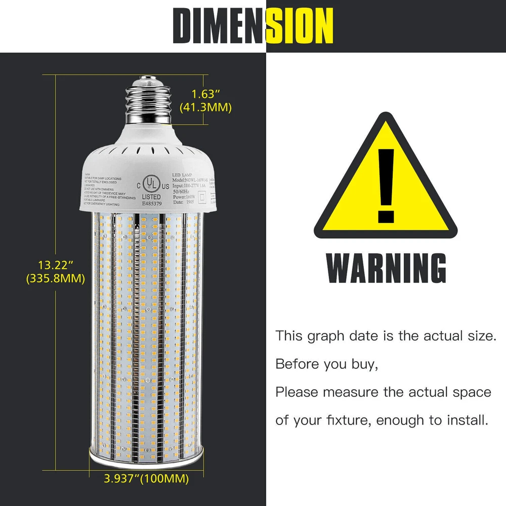 Product Description 160W LED Corn Cob Bulb for Gas Station Warehouse Airport Store Large Area Light 【Super Bright】 160W led corn cob with 22400 lumens and 360 degree beam angle fits to be 700W HID Replacement retrofit. The installation height is recommended between 16ft and 18ft. 【90% Energy Saving】The LED corn light reduce more than 90% electricity consume than traditional light. Available for working voltage from 100VAC to 277VAC 【Quality Listed】The industrial quality light passed UL certification. It offers a safer using at home, commercial, industrial area. 【Easy Installation】E39 Base is easy to Connect directly a screw base. Must be remove or bypass the ballast in your electric circuit before installation. 【Long Lifespan】This bulb has 50,000 hours lifespan. Offering at least 11 years of lighting time if used 12 hours a day. 【Warranty】We provide with 5 years warranty for all our bulbs. If any problem or question about bulbs please contact us by email. We will reply within 24 hours. Product description The LED cob bulb are UL/DLC listed with outstanding industrial quality, superb energy efficiency, long lifespan and easy installation. Compared with traditional light bulbs, we provide brighter lighting and wider applications, but we have achieved up to 90% energy saving. So our LED light bulbs can help you save more than 90% of electricity bills. The design of Non-flickering No UV or IR radiation can provide higher stability and reliability when using the bulbs. Feature: 1.UL Listed 2.Replace 7 00W HID bulb 3.Instant lighting 4.6K high voltage surge protection 5.Non-flickering No UV or IR radiation Technical Data: 1.Lighting Technology: LED 2.Bulb Shape: Corn Cob 3.Rated Power: 160 watts 4.Input Voltage: AC100-277V 5.Bulb Base: E39 Base 6.Power Factor: >90% 7.Power Efficacy: 140 Lm/W 8.Color Temperature: 5000K/6000K 9.Color Rendering Index (RA) : >80 10.PC Cover: Transparent 11.Materials:Aluminum+ASA 12.Lifespan: 50,000 hrs Wide Application: Indoor High Bay Area: warehouse, factory, workshop, shopping mall, church, garage, grocery, car wash-shop, gym, basketball court, tennis court, office, garden, community, back-yard, aircraft storage, farm, restaurant, airport, subway, convention center, swimming pool etc. About Us Payment Shipping Returns Contact Us SHENZHEN NUOGUAN TECHNOLOGY CO. LTD founded in 2010. We are high-technology comany specialized in manufacture Commercial and industrial LED light. Advanced production equipment and excellend R&D ability help us to combining service ,production sell together provide top-level products to our customers. 1. Payment is expected within 7 days of auction close. Or Unpaid Items will be forfeited per eBay . 2. Taxes may be applicable at checkout as states adopt new laws and regulations regarding sales tax collection. 1. We ONLY ship to USA . 2. Orders processed within 1-2 business day of payment verification. There’s no Delivery service or courier service on Saturdays, Sundays or Public Holidays. 3. We have 3 different warehouse in US,so due to stock status and time differences, we will choose to ship your item from our first available warehouse for fast delivery. 4. We offer Free Shipping within the Lower 48 states! All packages are sent via UPS or USPS.The delivery time for UPS Ground is typically 2-5 business days. We strive to ensure 100% satisfaction for each and every one of our customers. we offer a 30-day 100% money-back guarantee on all eBay orders. If your item isn't just as you wished, simply send it back to us and we'll refund or replace your item. Please note that all returns must be authorized by our Customer Service department. please contact us though message first if you have any problem. USA Warehouse. Fast shipping! We are appreciated your purchasing form our eBay store. Office Time: 9:30 - 18:30, Monday - Saturday (UTC+8) Please contact us with eBay Message. We will respond you within 24 hours on business day. About Us SHENZHEN NUOGUAN TECHNOLOGY CO. LTD founded in 2010. We are high-technology comany specialized in manufacture Commercial and industrial LED light. Advanced production equipment and excellend R&D ability help us to combining service ,production sell together provide top-level products to our customers. Payment 1. Payment is expected within 7 days of auction close. Or Unpaid Items will be forfeited per eBay . 2. Taxes may be applicable at checkout as states adopt new laws and regulations regarding sales tax collection. Shipping 1. We ONLY ship to USA . 2. Orders processed within 1-2 business day of payment verification. There’s no Delivery service or courier service on Saturdays, Sundays or Public Holidays. 3. We have 3 different warehouse in US,so due to stock status and time differences, we will choose to ship your item from our first available warehouse for fast delivery. 4. We offer Free Shipping within the Lower 48 states! All packages are sent via UPS or USPS.The delivery time for UPS Ground is typically 2-5 business days. Returns We strive to ensure 100% satisfaction for each and every one of our customers. we offer a 30-day 100% money-back guarantee on all eBay orders. If your item isn't just as you wished, simply send it back to us and we'll refund or replace your item. Please note that all returns must be authorized by our Customer Service department. please contact us though message first if you have any problem. Contact Us USA Warehouse. Fast shipping! We are appreciated your purchasing form our eBay store. Office Time: 9:30 - 18:30, Monday - Saturday (UTC+8) Please contact us with eBay Message. We will respond you within 24 hours on business day. You may also like 100W LED Barn Light with Dusk To Dawn Photocell Outdoor Garden Yard Night Light 69.05 USD Free shipping 200W UFO LED High Bay Light Industrial Fixture For GYM Warehouse Workshop 120V 99.05 USD Free shipping 100W LED Post Top Light For Garden Yard Parking Lot Road Circular Area Pole Lamp 138.74 USD 154.15 USD Fre