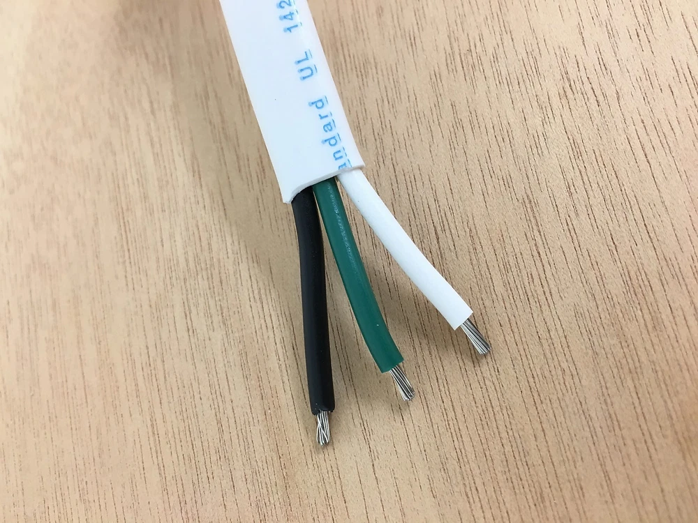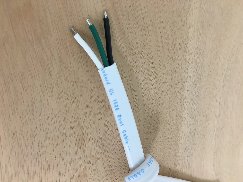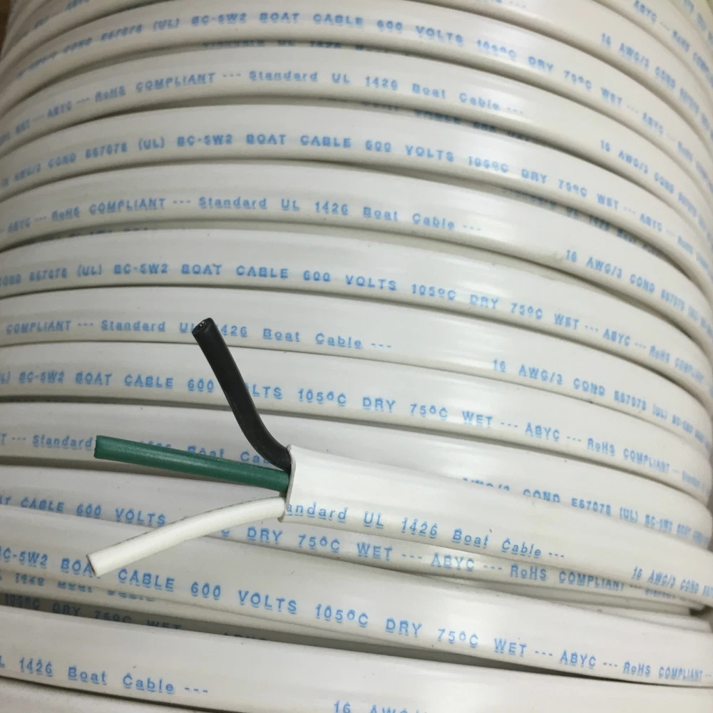 16 AWG 3 Conductor Wire, Marine Grade Boat Cable with White overall jacket with Black, White and Green conductors inside used for wiring AC applications. This wire is UL1426 listed and exceeds the requirements of ABYC and the USCG (US Coast Guard) for installation on boats as the flexible stranding and insulation are designed to withstand the harsh marine environment. Color Code: Black, White and Green Conductors ( AC Color Code with Black for Hot, White for Neutral and Green for Ground) Copper stranding is tin plated to resist corrosion, Flexible Type III, Class K stranding Meets all applicable boat wiring regulations from ABYC and US Cost Guard for use on boats Rated 600 Volts Max with 105C Dry and 75C Wet (BC5-W2) temperature ratings and will remain flexible in extreme cold weather Jacket and insulation are resistant to oil, gas, salt water, battery acid, heat, abrasion and sunlight Specifications for Flat Triplex Marine Wire: Wire Size (AWG) Dimensions Weight/FT Amps Max* 16/3 3/16" x 15/32" .075 lbs 25 14/3 7/32" x 1/2" .096 lb 35 12/3 7/32" x 17/32" .125 lbs 45 10/3 1/4" x 21/32" .186 lbs 60 8/3 3/8" x 1" .287 lbs 80 6/3 7/16" x 1-3/16" .470 ls 120 * Inside of engine space de-rate amps by 15% due to extra heat