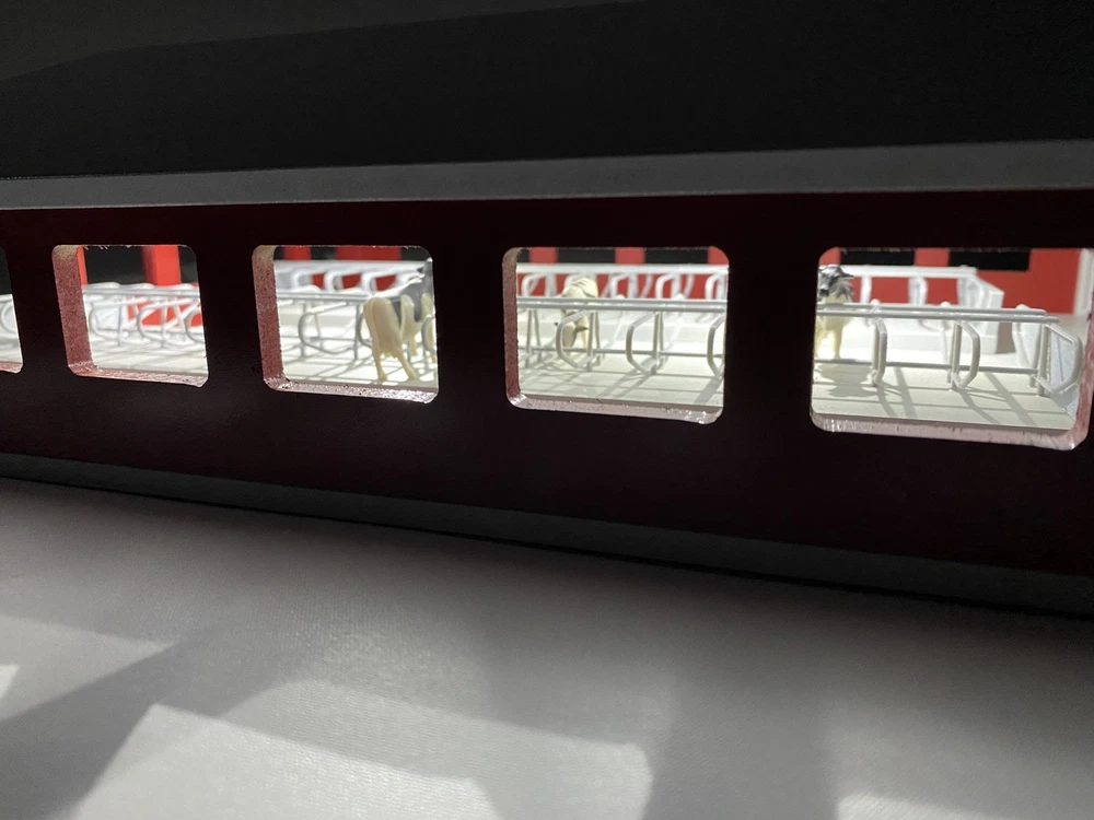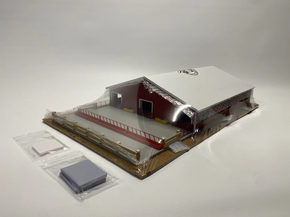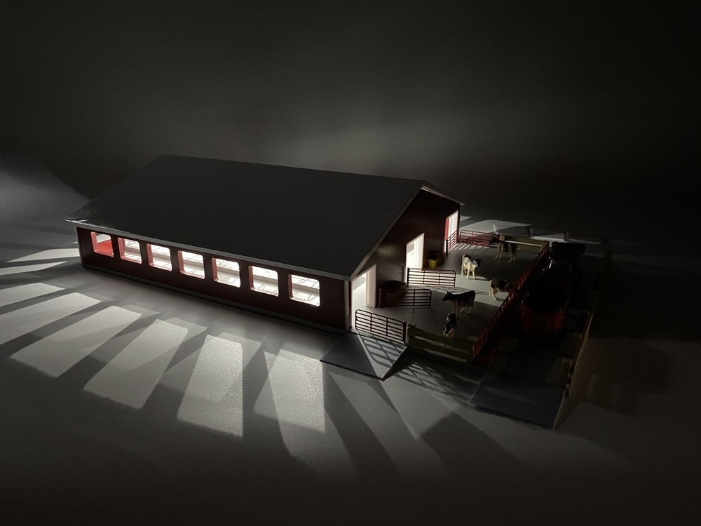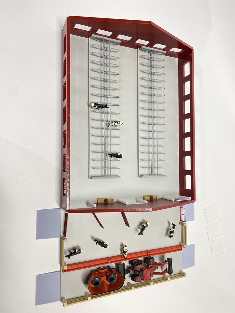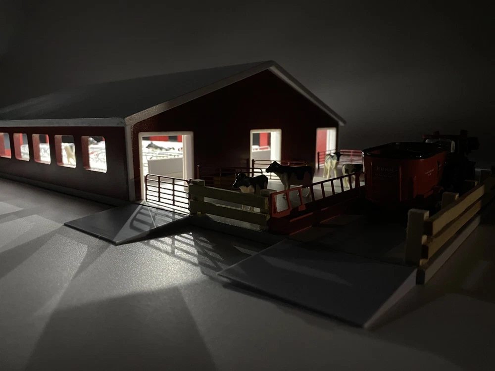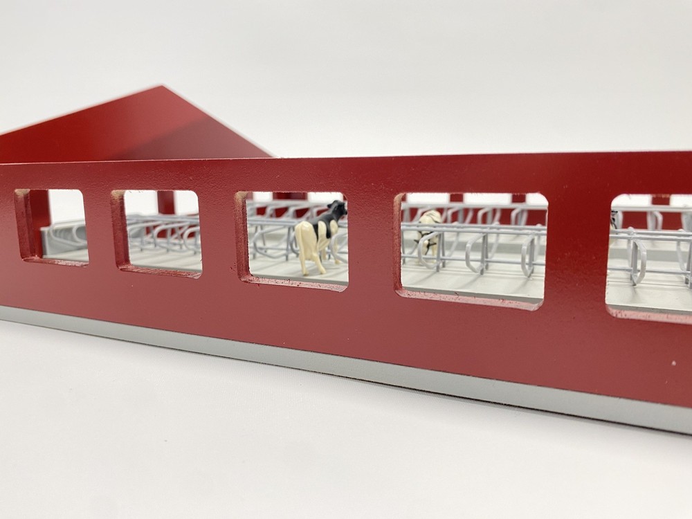 1/64 Cattle Freestall Barn and Feedlot. 70x85 Barn with stall for all your 1/64 cows. The barn is attached to the base that includes a feed lot. The barn has a removable roof, 4 waters, 5 swinging gates, 3 feeders, 3 removable garage doors, and enough stalls to hold 68 cows. The feed ally and entrances into the pen have ramps so your equipment does not unhook under play conditions. (4 included) This barn has it all including lights! The stalls are assembled and glued into the barn. Perfect for display of carful play. Door openings: 1.875”x1.875” Overall Dimensions including feed lot: 24.4”x13.5”x5” Red sides/white roof and trim Every Buckeye Farm Toy barn is hand made and therefore every one is unique. We do our best to solve any issues you may have with our items. Questions are welcome!