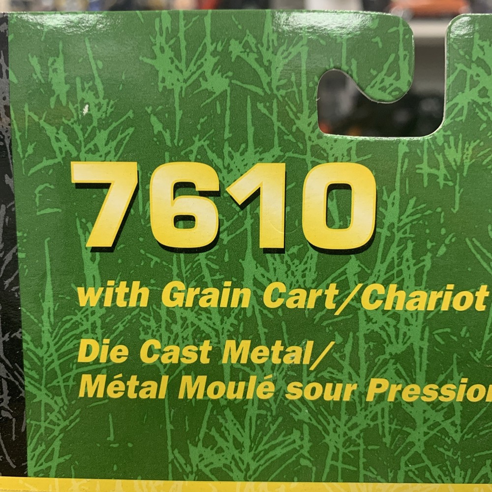 The product is a 1:64 scale Ertl diecast toy of a John Deere 7610 FWA Tractor with a 500 Grain Cart. This toy represents a contemporary manufacture farm vehicle and is part of the Farm Vehicles category in the Toys & Hobbies section. The detailed model showcases the tractor and grain cart in a smaller scale, perfect for collectors or for play. The Ertl brand is known for producing high-quality diecast and toy vehicles, making this a sought-after item among farm vehicle enthusiasts.