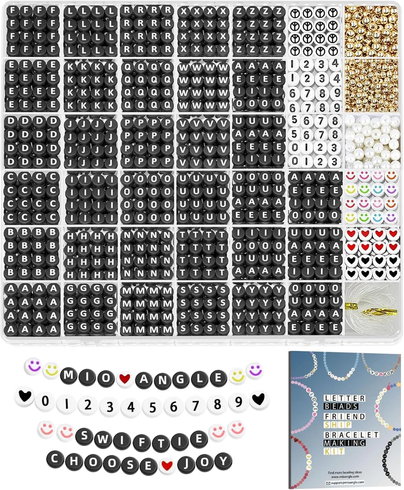 【For a Complete Crafting Experience】:Mio Angle letter beads friendship bracelet kit has been adjusted based on market research, increasing the quantity of each vowel beads (A, E, I, O, U) to 90 Pcs. This allows you to create confidently without worrying about missing essential 【Make More Friends】:Whether preparing friendship bracelet for events or crafting personalized jewelry, the Mio Angle letter beads kit meets your needs. Crafting handmade items allows you to easily express your feelings and strengthen relationships with friends. 【Create as You Wish】:With 39 different beads, including 26 letter beads, heart、peace、smiley、beads, and gold spacer beads in 4mm and 6mm, along with 6mm pearls, the comprehensive set inspires your creativity and helps you create unique pieces. 【Unleash Your Creativity】:These alphabet beads are perfect for use with clay, pony, and glass beads. Ideal for crafting friendship bracelets, necklaces, keychains, eyeglass chains, and more, they add a fun touch to your DIY projects. 【Providing the Perfect Experience】:Mio Angle letter beads is carefully packaged with beads sorted by color and type for convenience. We are dedicated to continuously improving our products to meet customer needs and ensure every purchase is a pleasant experience. Product Description