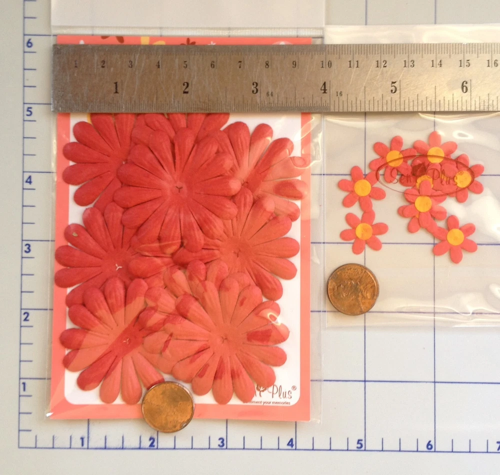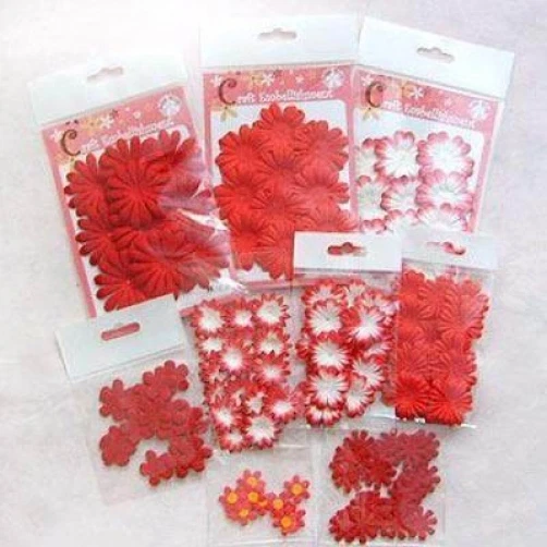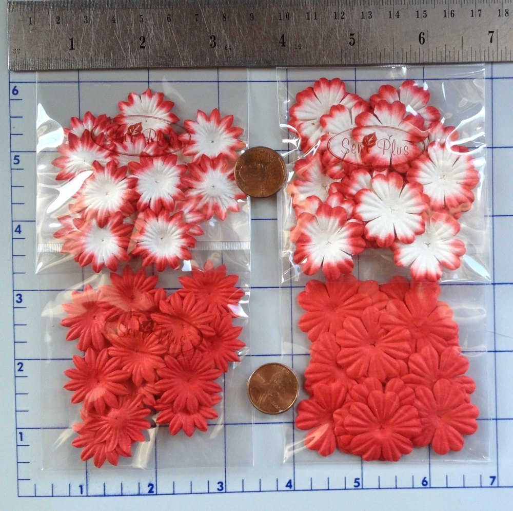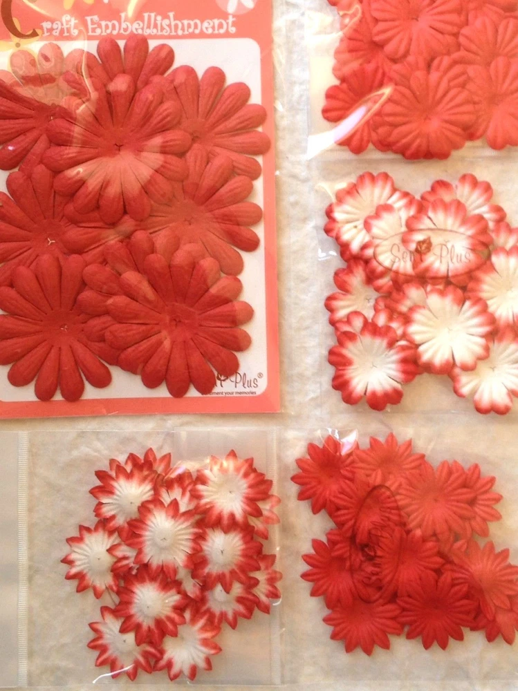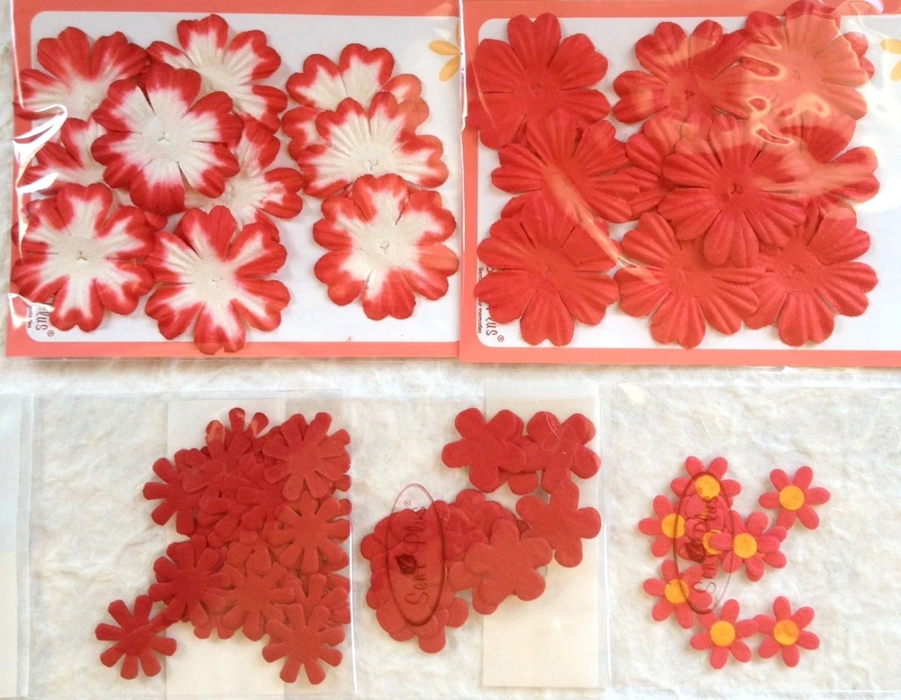 166-170 handmade mulberry paper, assorted shades of red colored flower petals.There are 10-20 flowers individually packaged by style. (**The packs may have a few over or under the numbers listed below.) The flowers range in size from approximately 3/4"-2" in size. Color may vary slightly on computer monitor and handheld devices to actual product. Mulberry paper is acid and lignin free and suitable for long lasting projects. Photo 3- Both quantity 10, diameter about 1 1/2". Photo 4- Both left quantity 20, 1" wide. Both right quantity 20, diameter 1 1/8". Photo 5- Left quantity 10, diameter 1 7/8". Right quantity 10, diameter 11/16" Photo 6- Left quantity 28-30, diameter 7/8" wide. Right quantity 18-20, diameter 7/8".