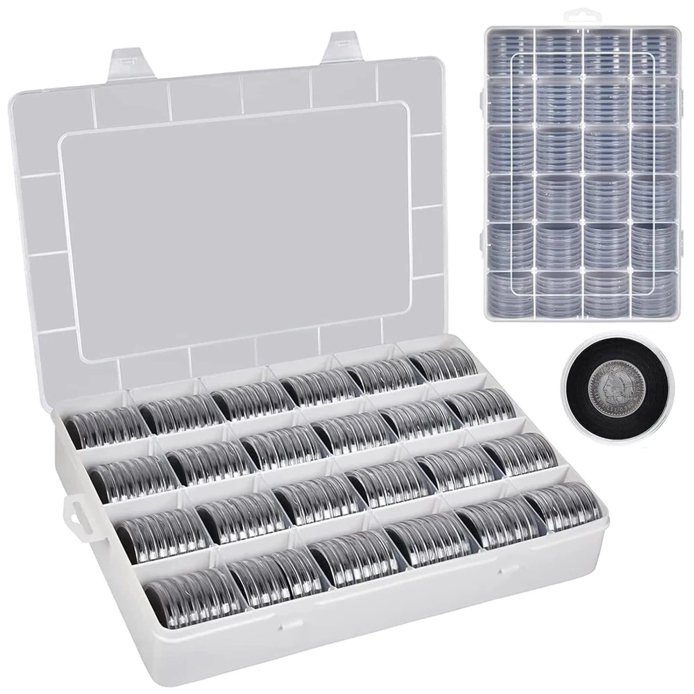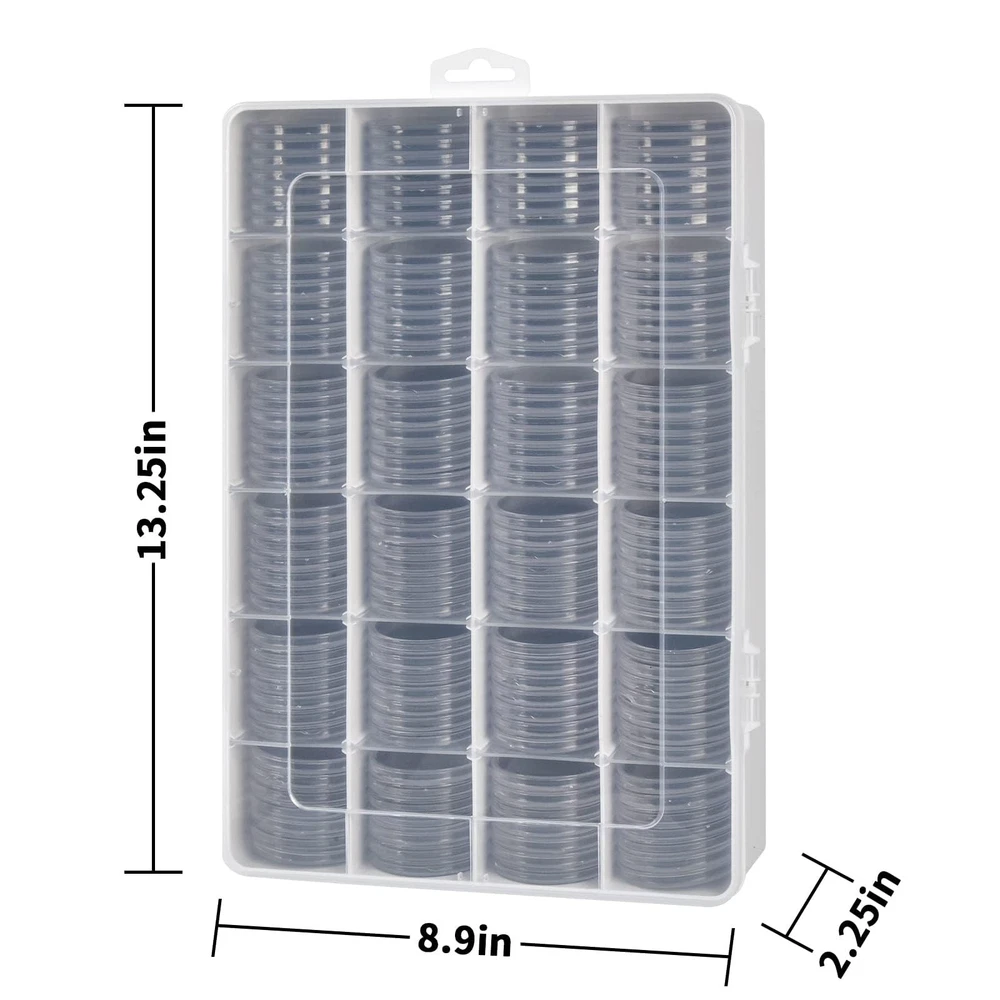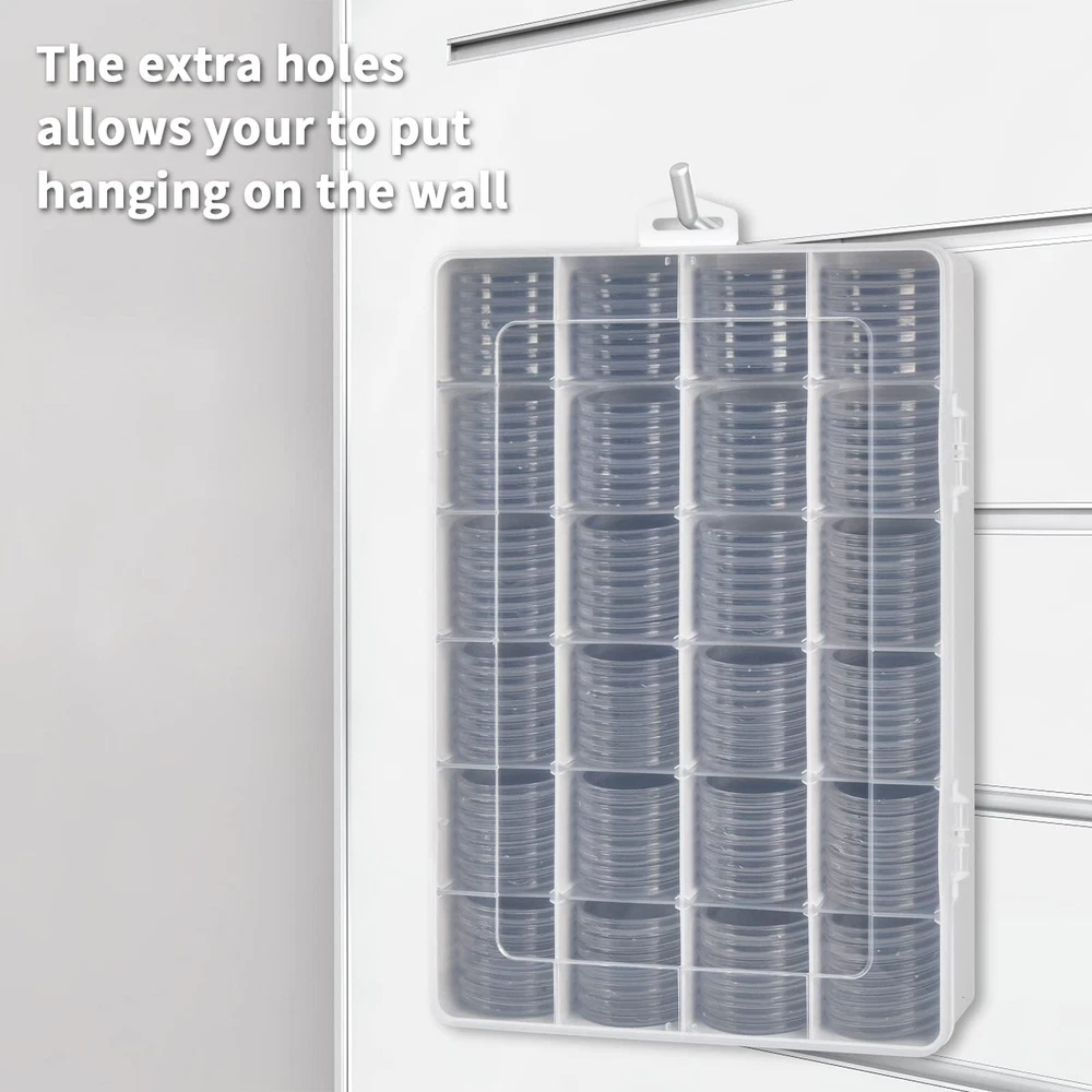 Coin large capacity storage protector: Coin organizer case with 168pcs 46mm coin capsules, which has 8 Sizes (16 20 25 27 30 35 40 46mm) foam gasket.. Coin cases all sizes for collectors fits for all various coins, such as American Silver Eagle coins, bullion coins, challenge coins, US quartes or dollars, ect. Note: Coin collection storage case only, not contain any coins. Coin case with customizable layout: Silver dollar coin holder comes with 20 removable dividers, allowing the user to create up to 24 compartments of various sizes to suit their specific needs. Plastic coin holder makes it easy for coin holders for collectors to organize their coins by type, date, or any other classification they prefer. The removable dividers can be easily adjusted, allowing for a customized layout that can be changed as needed. Coin display case with hanging ear: Gold coins collecting case features with a hanging ear that allows it to be hung on a wall, thus making coin case holder easier to display and saving space. Coin tray with transparent cover provides a clear view of the coins inside without the need to open the coin box. Coin dispenser makes it easy to quickly identify the coins and avoid unnecessary handling. Coin box storage box with premium material: Half dollar coin holder made of sturdy plastic, keeps coins well, withstand daily wear and tear, providing long-lasting protection for the coins stored inside. Coin holders for all coins has double latches, ensuring a secure and tight closure when carrying silver coin storage around. Coin collection case is great as a offering: Silver coin case with compact size of 13.19 x 8.78 x 2.16 inches makes it easy to store in a drawer or on a shelf. Gold coin case is designed to be versatile and can be used to store a variety of different coins. Coin capsules protective box is a practical goods for coin lovers and collectors to store and provide shielding for their favorite coins.