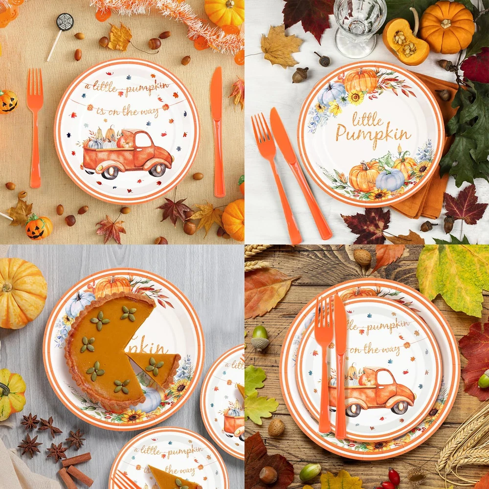 168Pcs little pumpkin baby shower plates and napkins 24 little pumpkin paper plates 9 inch 24 7 inch a little pumpkin is on the way plates 24 pumpkin cups 24 2-ply baby shower napkins 24 sets of fall cultery (Forks, Knives, Spoons) WARNING: Little pumpkin cups are for cold drinks only. 【Pumpkin Baby Shower Decorations】- A little pumpkin is on the way baby showers include 24 9 inch little pumpkin baby shower plates, 24 7-inch a little pumpkin is on the way plates, 24 little pumpkin cups, 24 littble pumpkin napkins, 24 sets of orange plastic utensils (forks, spoons, knives), 168 pieces in total. This is a great little pumpkin baby shower plates and napkins sets. 【Fall Themed Baby Shower Decorations】- This pumpkin party decorations features orange, grey and blue pumpkins, sunflowers and eucalyptus leaves as embellishments, and the text design of "a little pumpkin is on the way".The rich colors and vivid pumpkins present a scene of autumn harvest, which is both childlike and warm. It is very suitable for fall pumpkin themed baby shower party. 【Finest Quality】- Improved by , fall baby shower plates have a protective film on top, making the board waterproof and oil resistant, pumpkin baby shower plates are thickened to prevent bending, leaking or tearing, no need to stack two pumpkin plates. Fall paper plates have a raised edge to avoid food spills. The double layer design of the fall baby shower napkins has strong water absorption and will not fade. 【Disposable and Recyclable】 - Little pumpkin baby shower favors are made of 100% food grade paper and are a disposable baby shower dinnerware set, no-toxic, biodegradable. You can simply throw them away when cleaning after the little pumpkin baby shower party. You can enjoy more time with friends and family. 【Pumpkin Baby Shower Plates and Napkins】- Orange baby shower decorations are suitable for almost any occasion, such as baby shower fall decorations, fall baby shower plates and cups and napkins sets,pumpkin baby shower decor, neutral fall baby shower decorations girl boy, lil pumpkin baby shower decorations, a little pumpkin is on her way baby shower, boho baby shower decorations,autumn baby shower decorations, Thanksgiving plates.