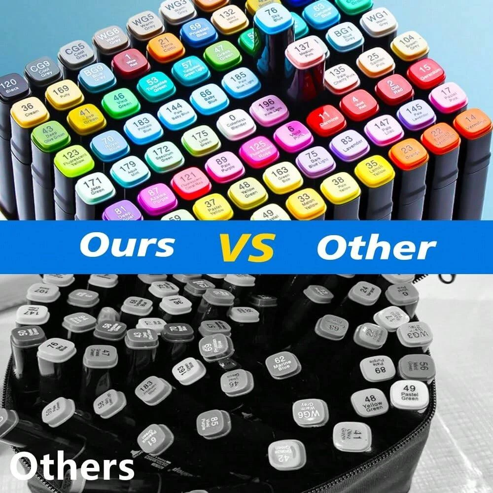 1.[SUPER QUALITY MARKERS]The quick-drying ink color can be kept cleansmooth and evenly, that resists smudging and fading. The professional colorand ease of use have made it popular among people all over the world. Deeplyloved by adults. Buy now and you will quickly experience the happiness thatother painting products can't give. 2. [TWO PENS IN ONE]Save money and space with DUAL TIP MARKERSthat allow you to create fine details with the bullet tip(0.5mm-2mm) or broadsweeping strokes (2mm-7mm) with the chisel tip. Ours markers that alsoreduce coloring lines, helping even beginners create professional effects withthese blendable markers. WARNING: CHOKING HAZARD-Small parts. Not for children under 3 yrs.