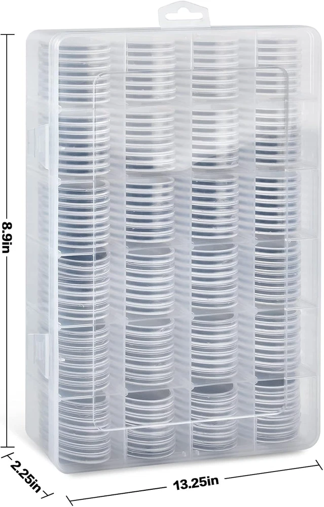 The 168-Piece Coin Capsule Set is an essential addition for any serious coin collector. This comprehensive set includes 168 high-quality 46mm coin capsules along with a variety of foam gaskets in six different sizes (20/25/27/30/38/46mm), providing versatility for various coin types. The included plastic storage box, measuring 13.25 x 8.9 x 2.25 inches, features 24 grid compartments and 20 removable layers, allowing you to organize and display your prized coin collection efficiently. This set is designed to keep your favorite coins safe and secure while showcasing their beauty. Constructed from durable, heavy-duty plastic, the coin holder is designed to withstand wear and tear, offering superior protection compared to traditional acrylic options. The transparent design allows for easy viewing of both sides of your coins without the need for handling, ensuring they remain in pristine condition. With its user-friendly crescent design, accessing your coins is effortless, making it an ideal solution for both display and storage. Whether at home or on the go, this coin capsule set is perfect for collectors looking to preserve their collections. Includes 168 high-quality coin capsules for extensive coin collection. Features six sizes of foam gaskets to accommodate various coin types. Durable plastic construction ensures enhanced protection against damage. Transparent design allows for clear visibility of coins without direct contact. Convenient storage box with removable layers for easy organization and transport.